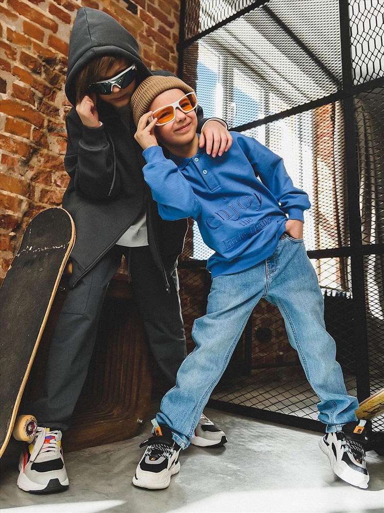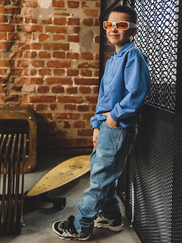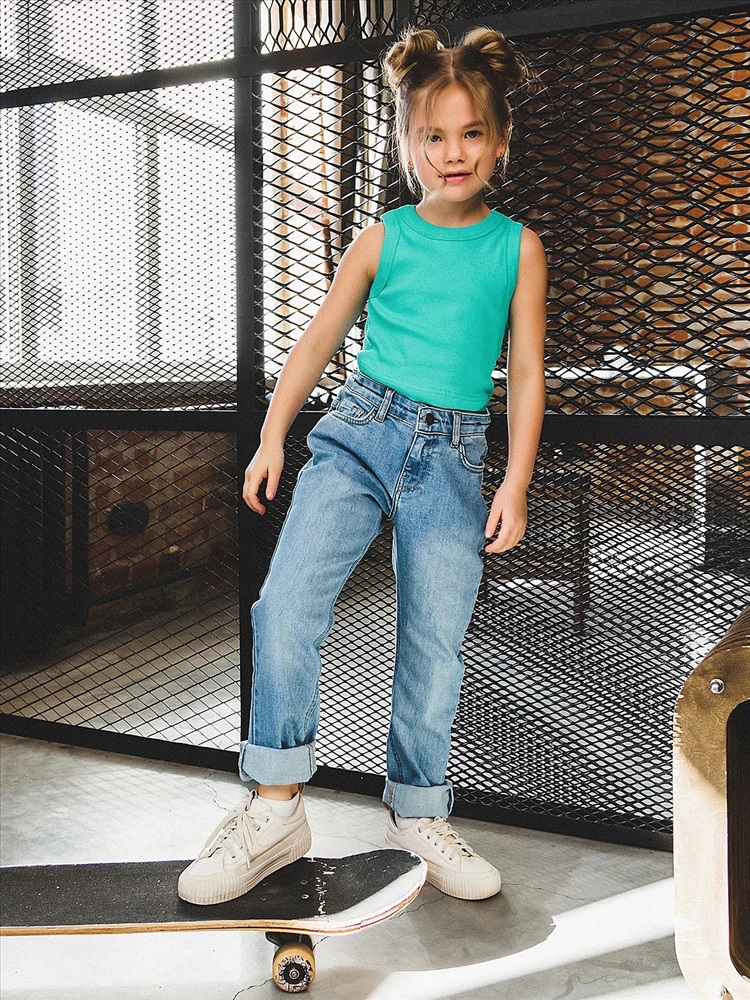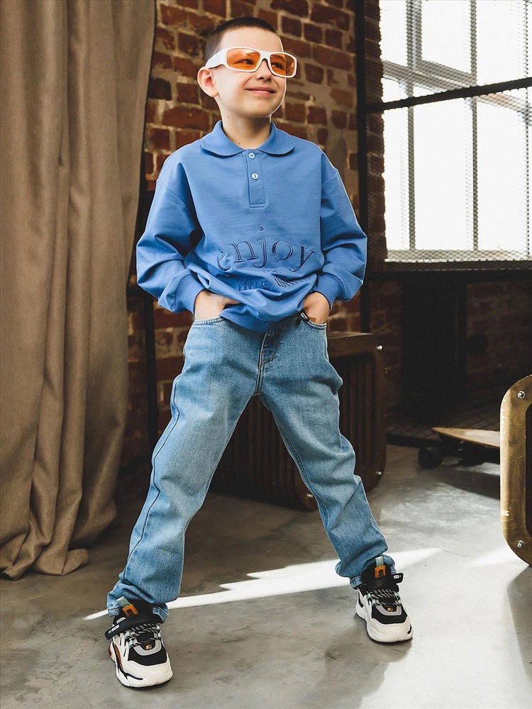 Базовые прямые джинсы со средней посадкой. Деним из натурального хлопка с добавлением эластана для максимального комфорта. Классическая модель подойдет как девочкам, так и мальчикам. Брюки будут гармонично смотреться с объемным верхом кроя оверсайз. Два прорезных кармана спереди, кармашек для мелочи, два накладных кармана сзади. Застежка на молнию и пуговицу, пояс с резинкой для регулировки обьема, шлевки для ремня.