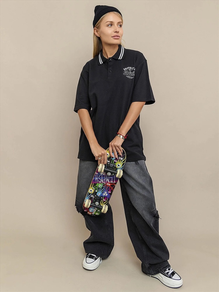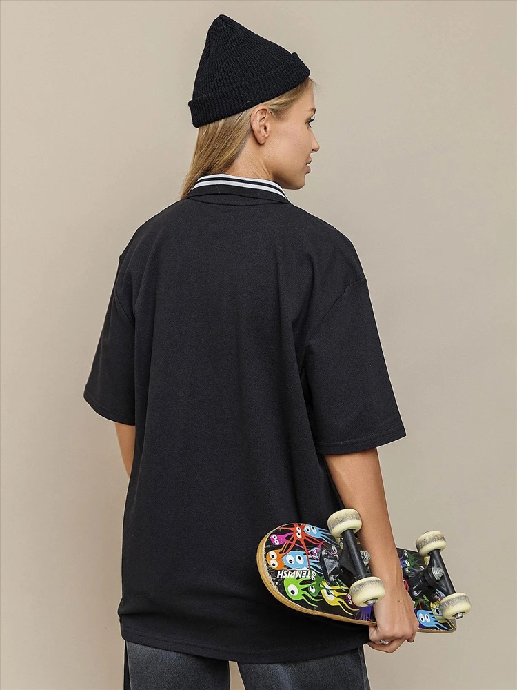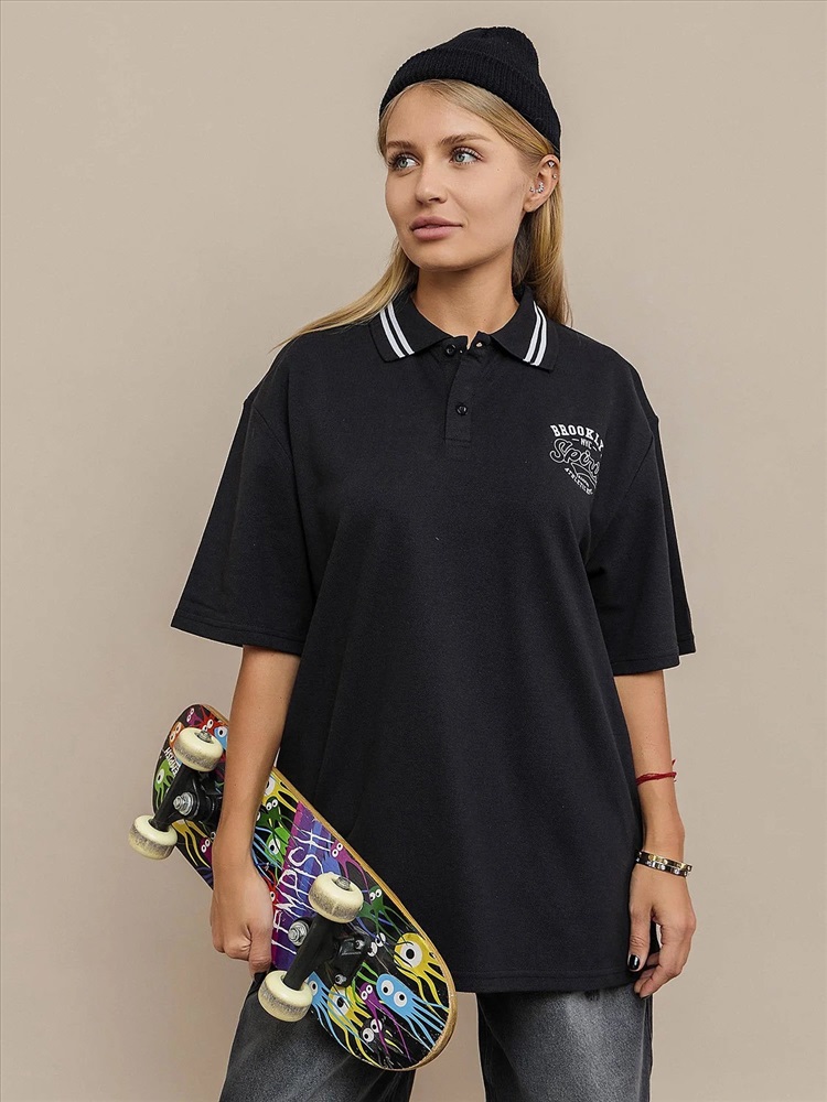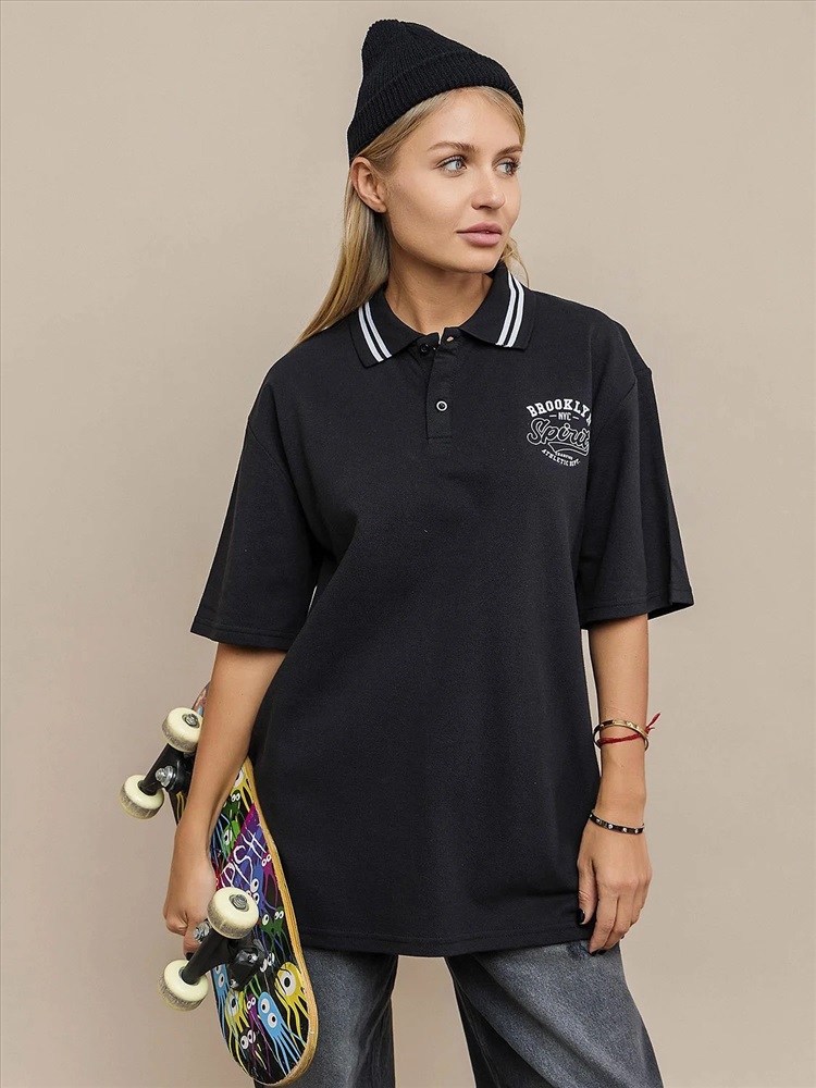 Футболка поло унисекс с коротким рукавом трикотажная из ткани пике. Стильная и удобная футболка – неотъемлемая часть детского и подросткового гардероба. Эластичный воротник с застежкой на пуговицы, однотонная черная расцветка и стильная надпись на груди.