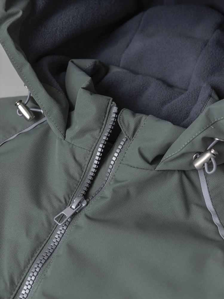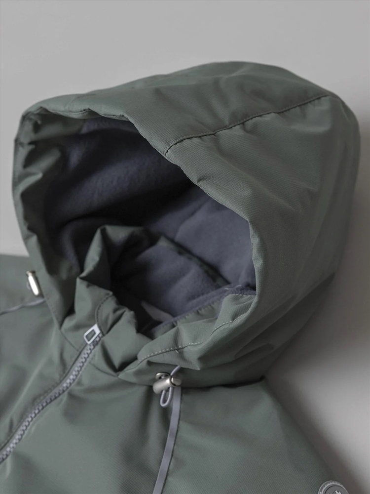 Подкладка спинки и полочки выполнена из мягкого флиса, рукава дополнены подкладкой из гладкой таффеты для удобства надевания. Рукав реглан обеспечивает свободу движений, а удлинённая центральная молния облегчает процесс переодевания. Регулируемый капюшон, манжеты на резинках, съёмные силиконовые штрипки и утяжка по талии делают модель особенно удобной. Светоотражающие элементы повышают безопасность в тёмное время суток.