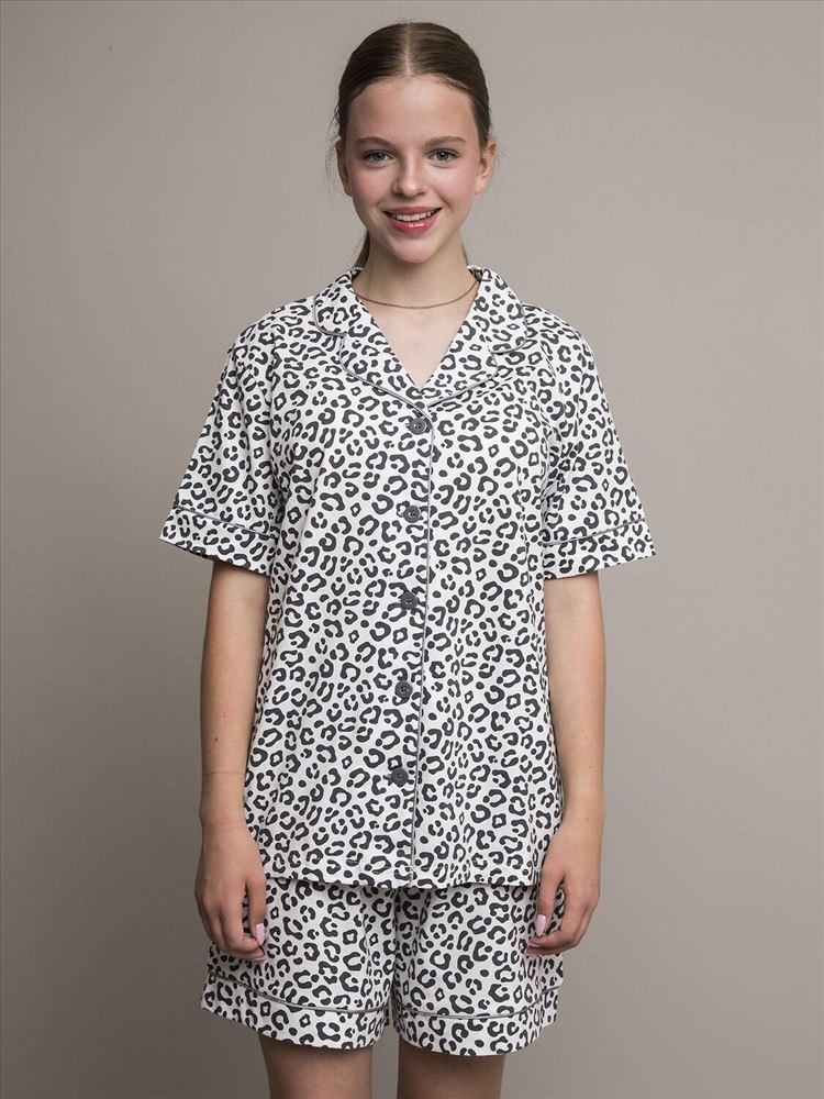Детский пижамный комплект для девочки из супрема пенье. Футболка с коротким рукавом и удобные шорты. Нежный белый фон с модным леопардовым принтом. Футболка с милыми пуговичками спереди. Мягкая резинка на шортах для комфортного сна. Воздухопроницаемая ткань премиального качества.
