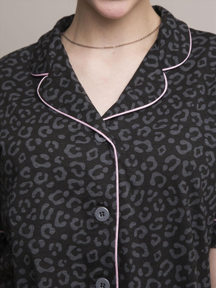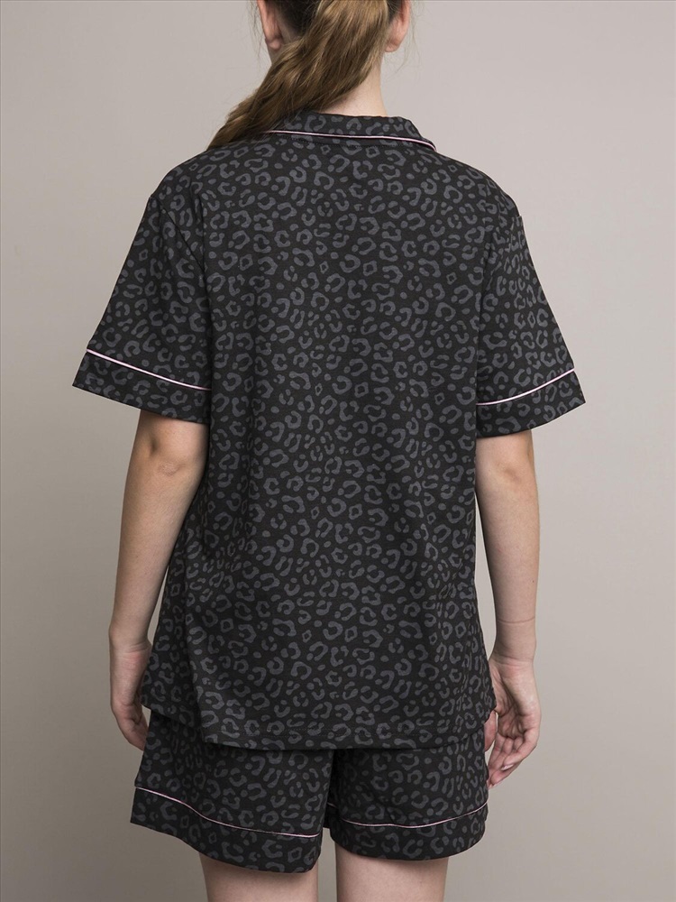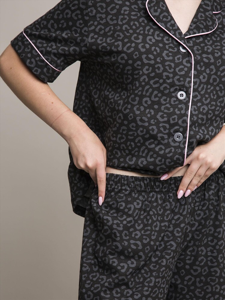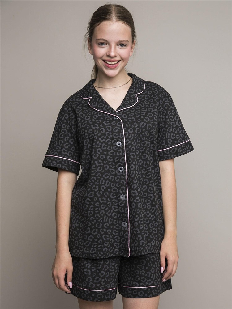 Детский пижамный комплект для девочки из супрема пенье. Футболка с коротким рукавом и удобные шорты. Черный цвет с модным леопардовым принтом. Футболка с милыми пуговичками спереди. Мягкая резинка на шортах для комфортного сна. Воздухопроницаемая ткань премиального качества.