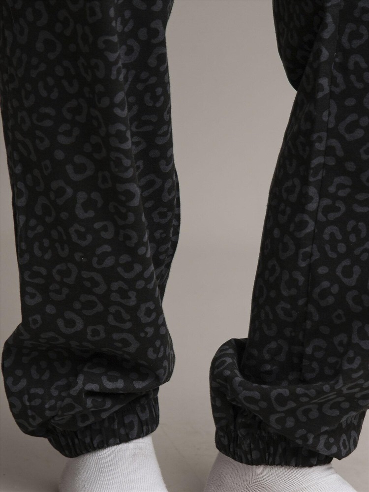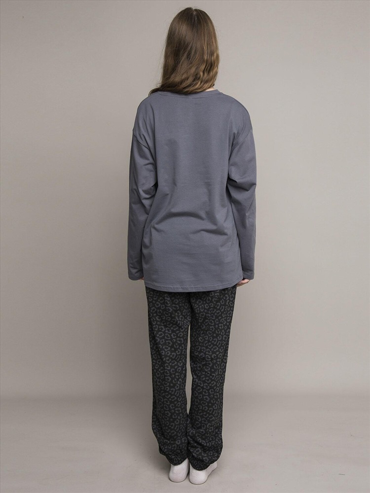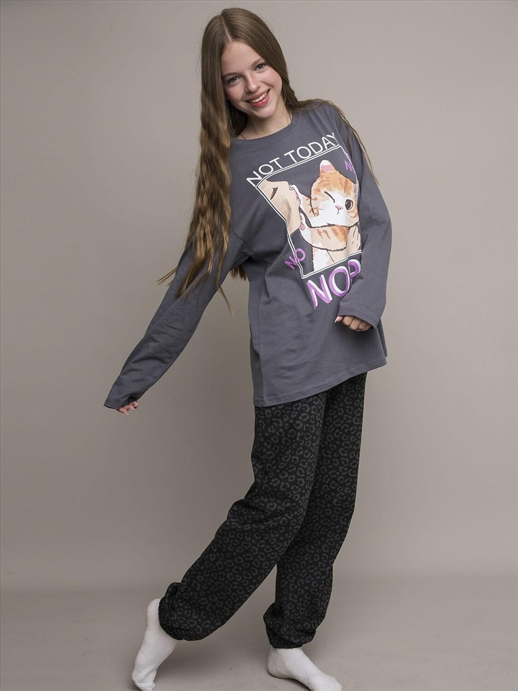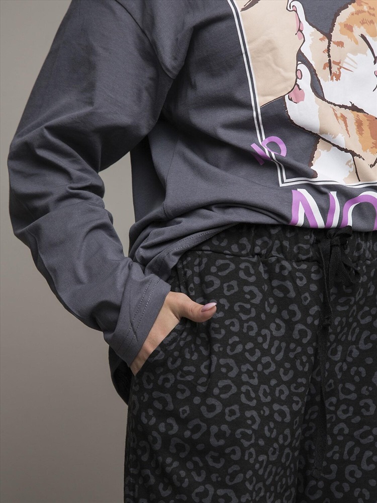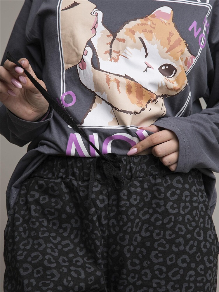 Детский пижамный комплект для девочки из супрема пенье. Футболка серая с длинным рукавом и милым принтом в виде котика и надписями. Брюки черные со стильным леопардовым принтом. Эластичная резинка на брюках для комфортного сна.