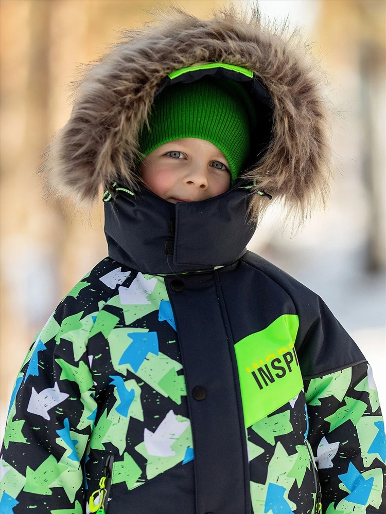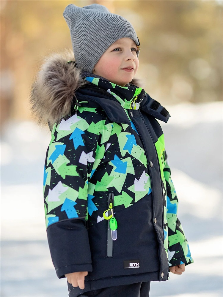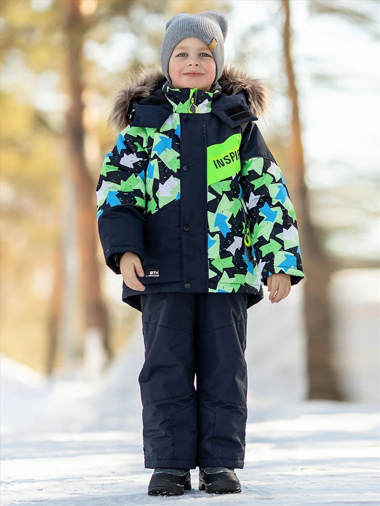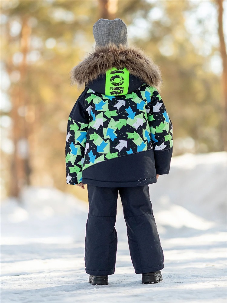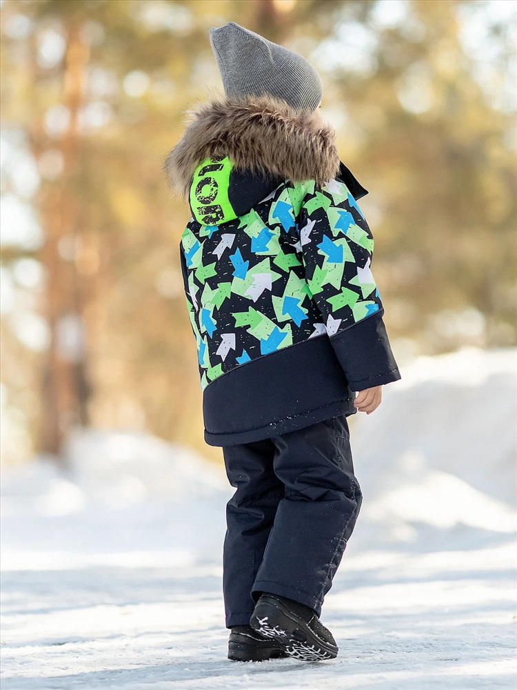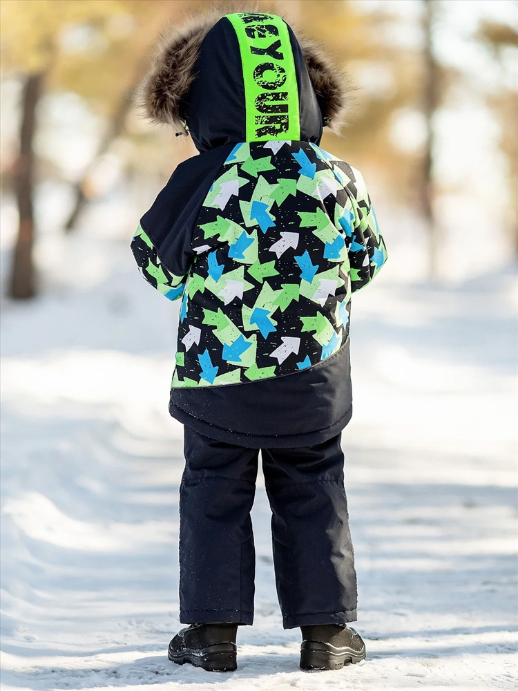 Комплект для мальчика Арон зимний утепленный. Актуальность модели подчеркнута ассиметричными линиями кроя и динамикой принта. Практичная расцветка, продуманная система роста благодаря отворотам по рукавам и брюкам. Яркая и спортивная расцветка – салатово-голубые стрелки на куртке и темно-синий однотонный полукомбинезон.
