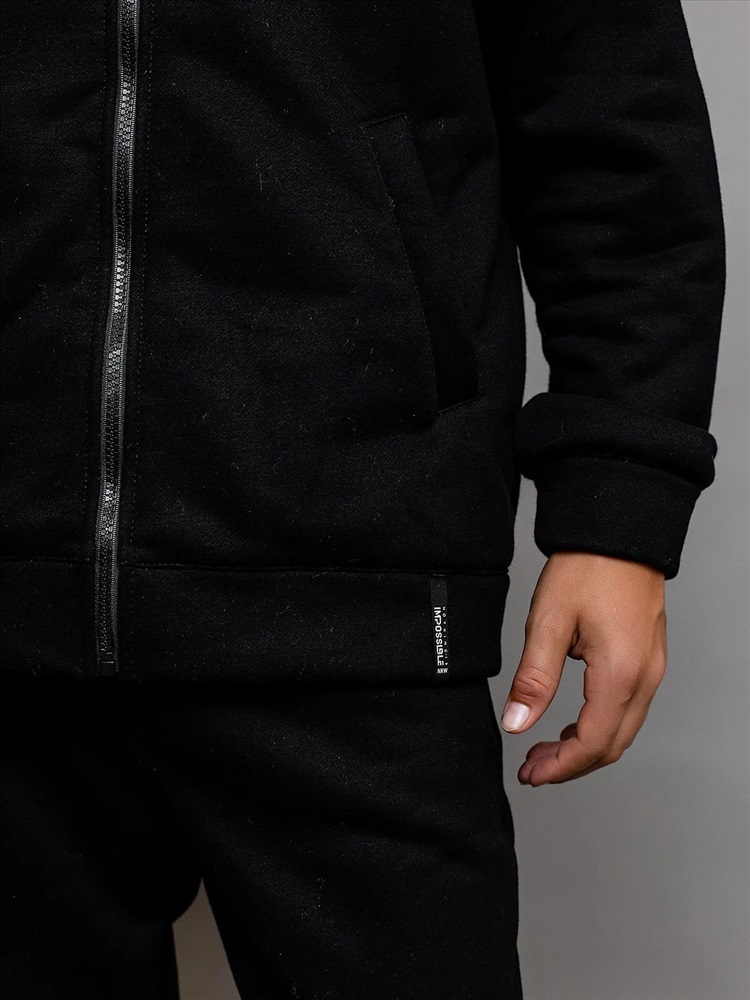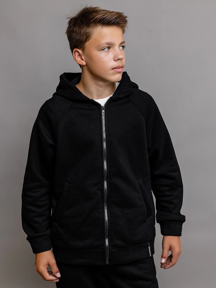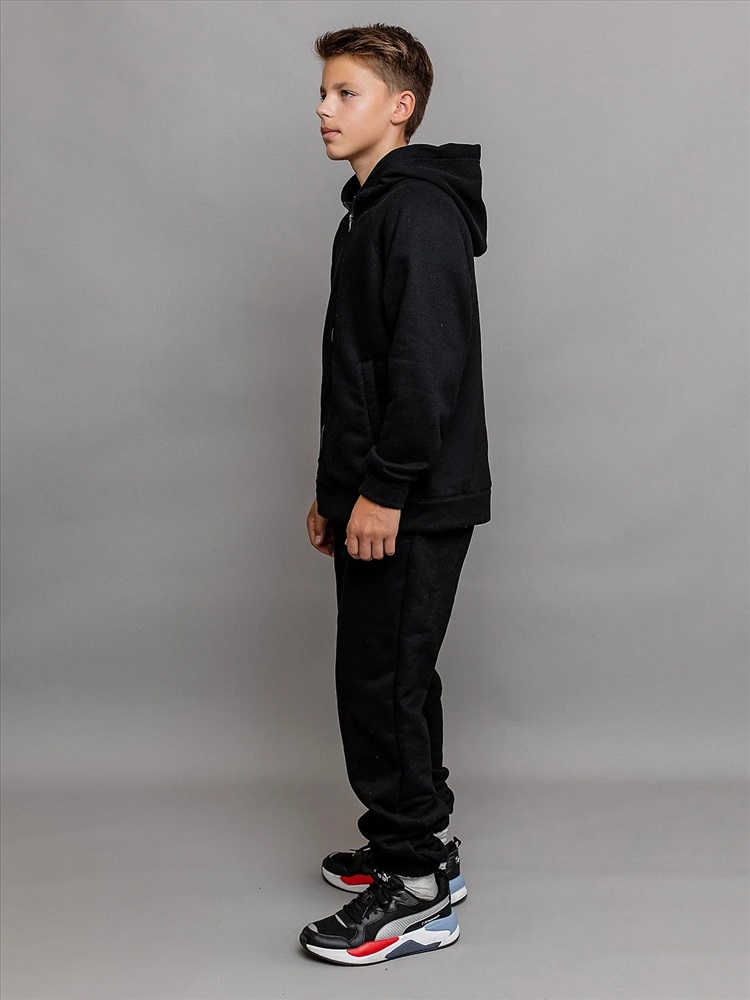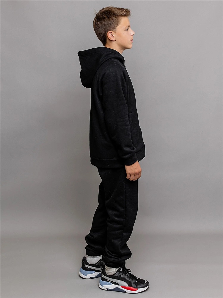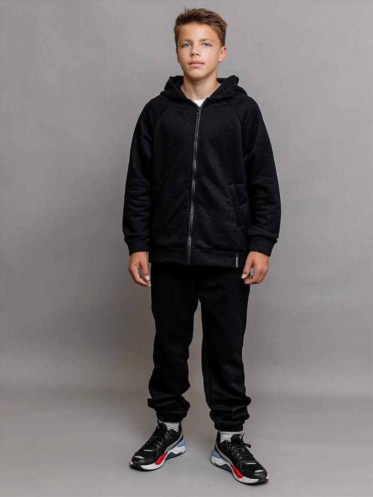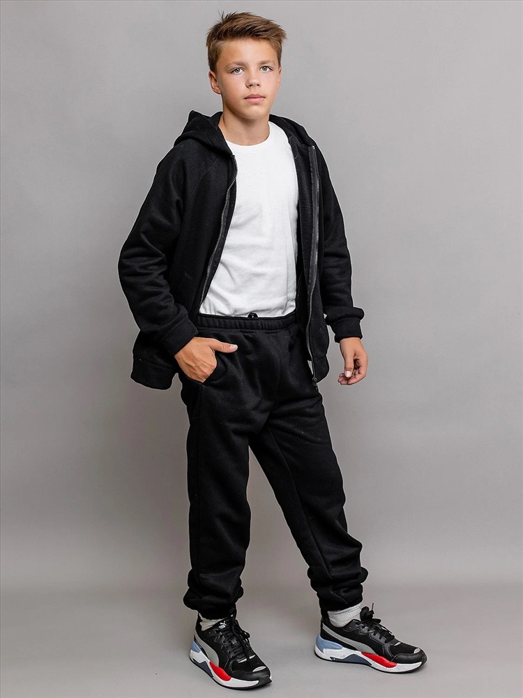 Комплект спортивный из футера с начесом черный для детей: толстовка на молнии и брюки. Ткань не линяет, не выцветает. Толстовка с карманами, глубоким капюшоном и эластичными манжетами рукавов. Брюки с поясом на резинке и утяжке шнурком, карманами и эластичным низом. Удобный базовый комплект одежды.