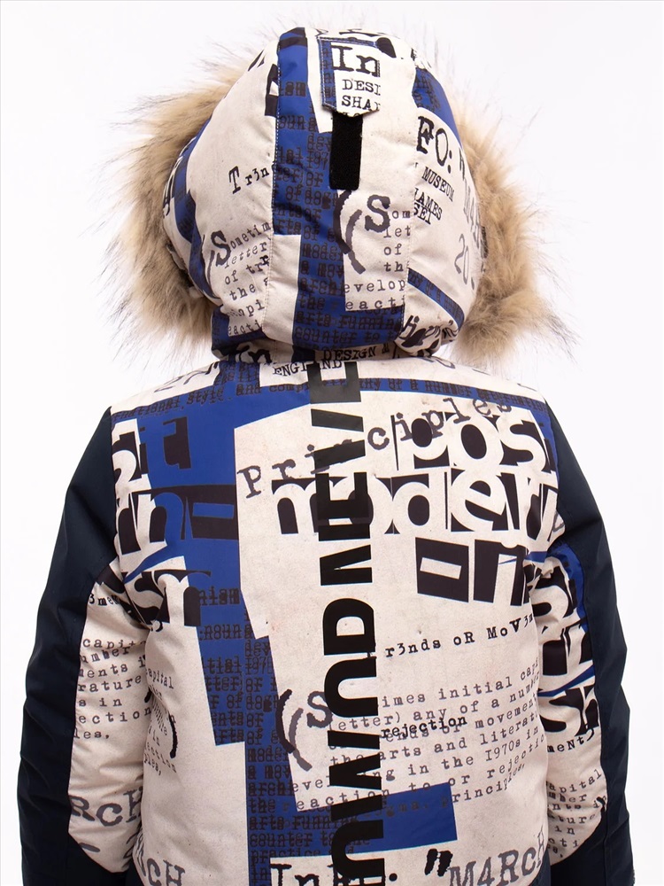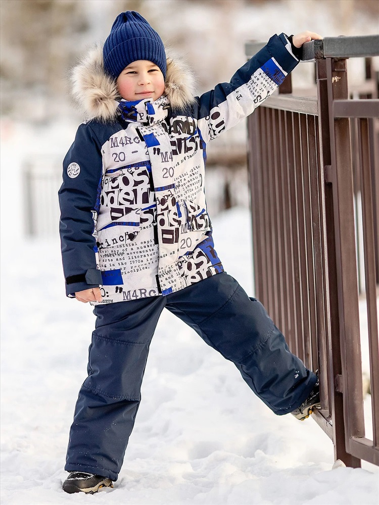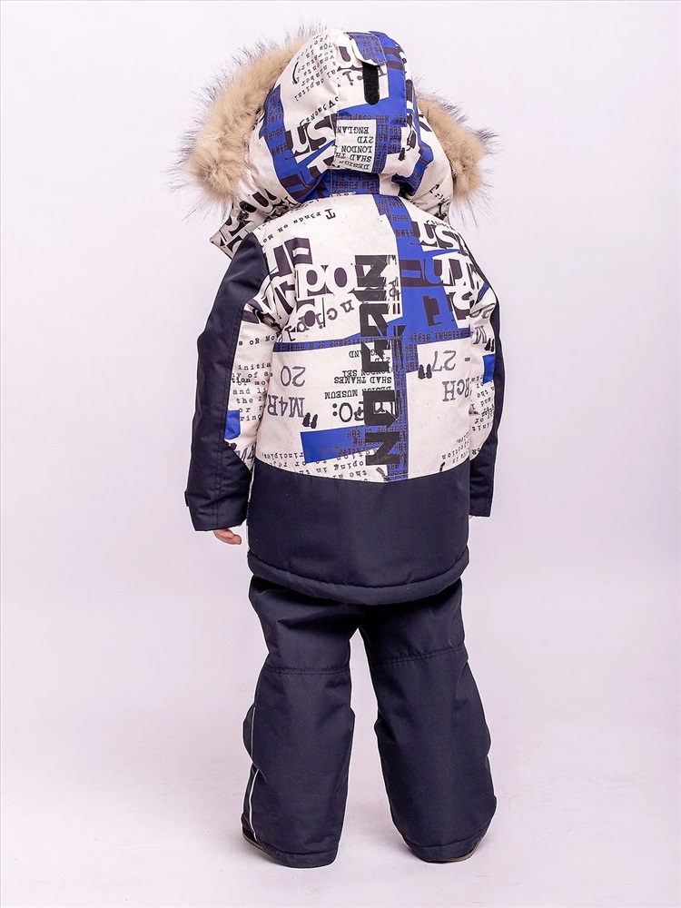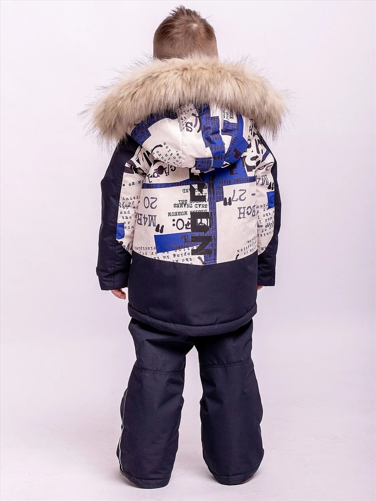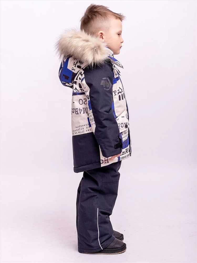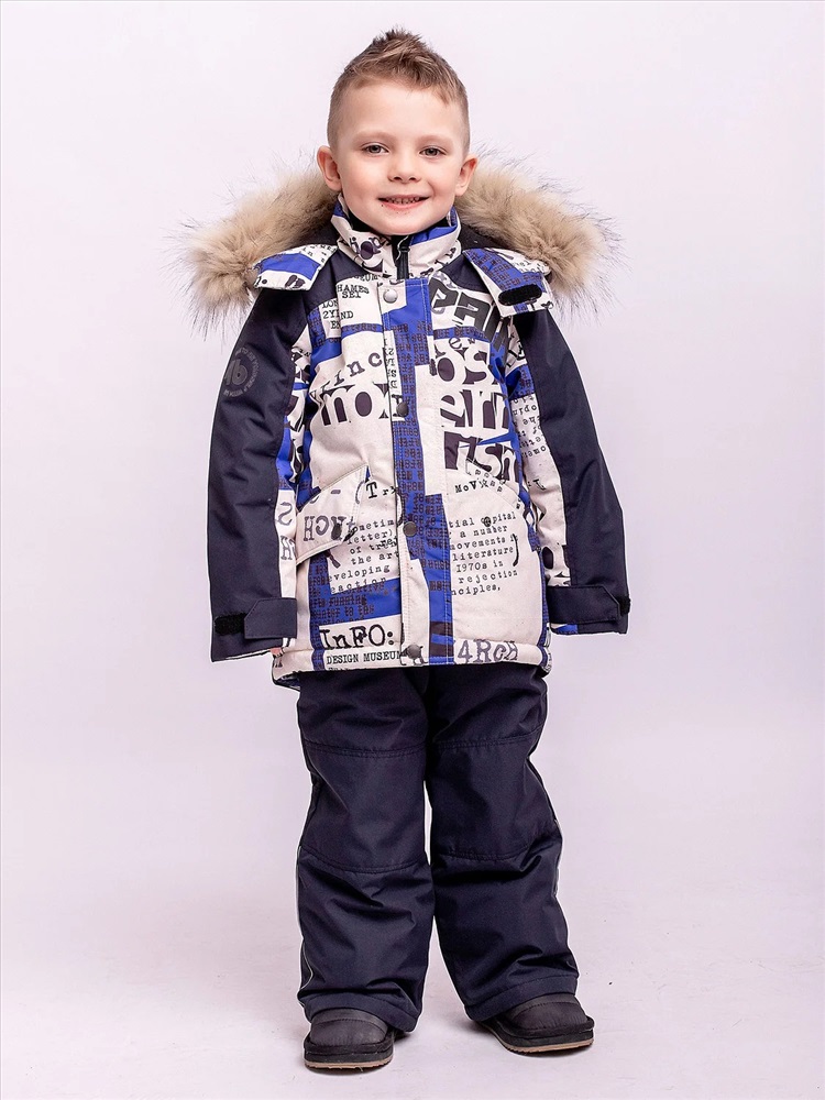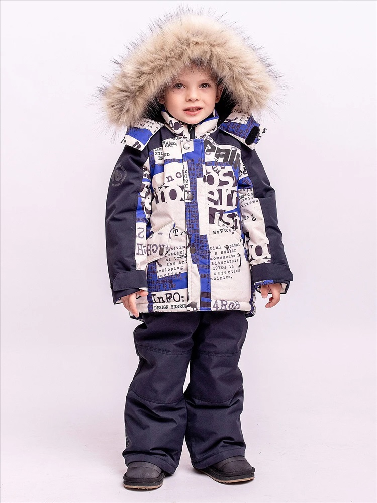 Комплект для мальчика Деннис зимний утепленный с курткой и полукомбинезоном синий с принтом "постер". Капюшон несъемный с искусственной опушкой. В рукавах эластичные манжеты. Молния на куртке с ветрозащитным клапаном и защитой подбородка. Боковые карманы с клапаном. Низ куртки стягивается эластичным шнуром с фиксатором, что помогает предотвращать попадание снега внутрь. Подтяжки брюк эластичные, регулируются по длине и снимаются.