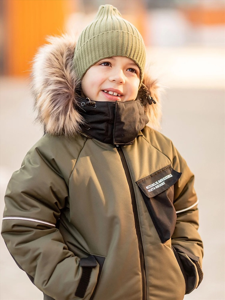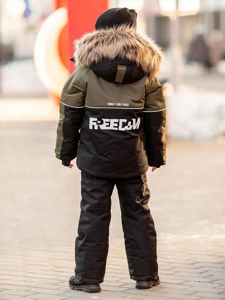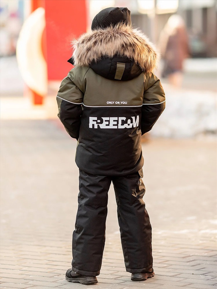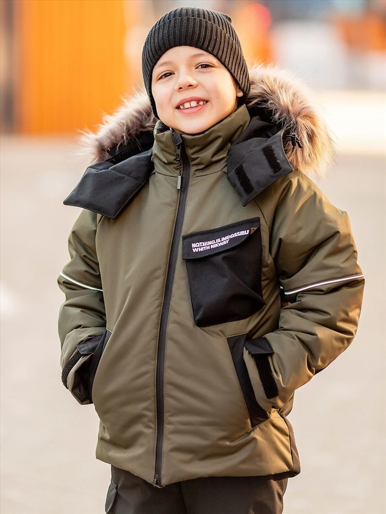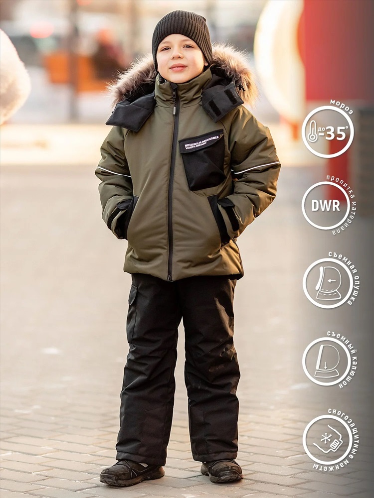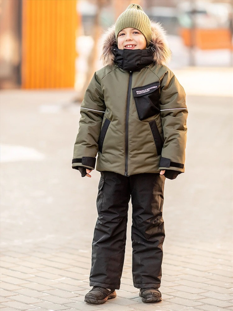 Комплект для мальчика Влад в расцветке хаки утепленный из новой коллекции Зима 2023/2024: куртка и полукомбинезон. Приятная на ощупь флисовая подкладка и мембрана обеспечивают комфорт и тепло даже в мороз. Зимняя куртка имеет три кармана: на груди накладной, внутренний и боковые. Капюшон съемный на кнопках с застежкой на липучки. Снегозащитная юбка защитит поясницу от переохлаждения и будет препятствовать попаданию снега внутрь. Манжеты рукавов на резинке для надежной фиксации и защиты от попадания снега. Полукомбинезон с застежкой на молнию и накладными карманами.