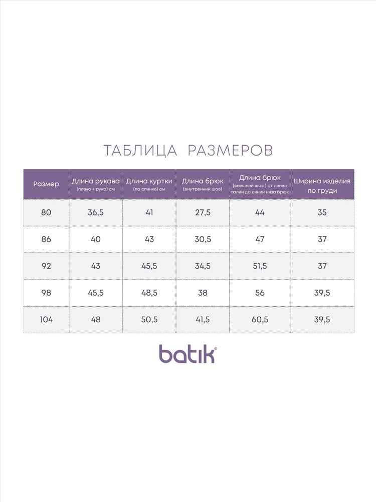Производитель: BATIK; Российский размер: 80; Артикул поставщика: 650-24в-3; Сезон: Осень, Весна; Год: 2024; Страна: Россия; Утеплитель: 100 гр; Ткань верха: Курточная ткань с блеском; Подклад: таффета