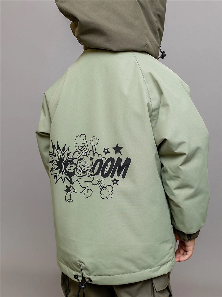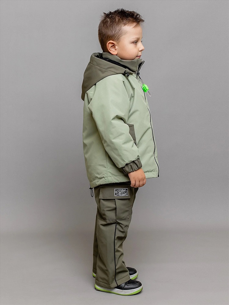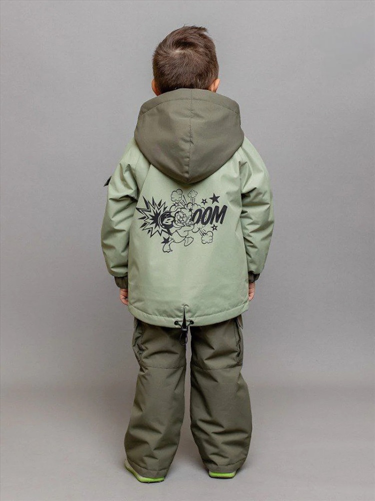 Универсальный демисезонный комплект для мальчика Марио с игровым термотрансфером на спинке в расцветке хаки. Для дополнительной защиты есть регулировки объема капюшона и по низу куртки. Спереди куртки прорезные карманы на молнии и накладной карман на рукаве. На полукомбинезоне регулируемые бретели и объемные накладные карманы в стиле карго.