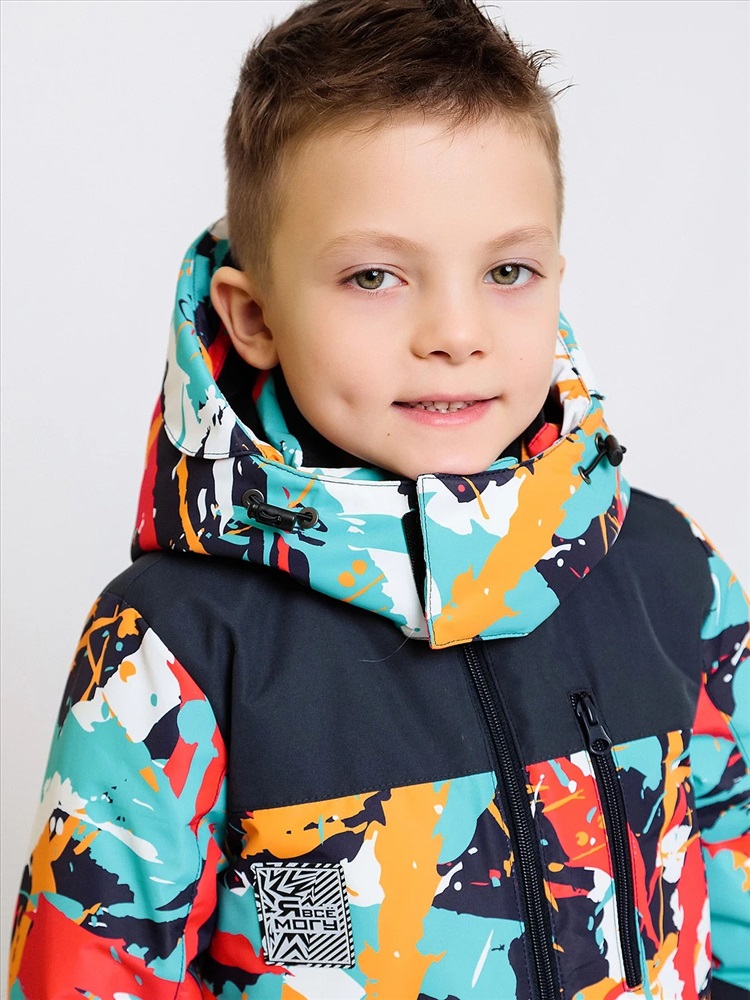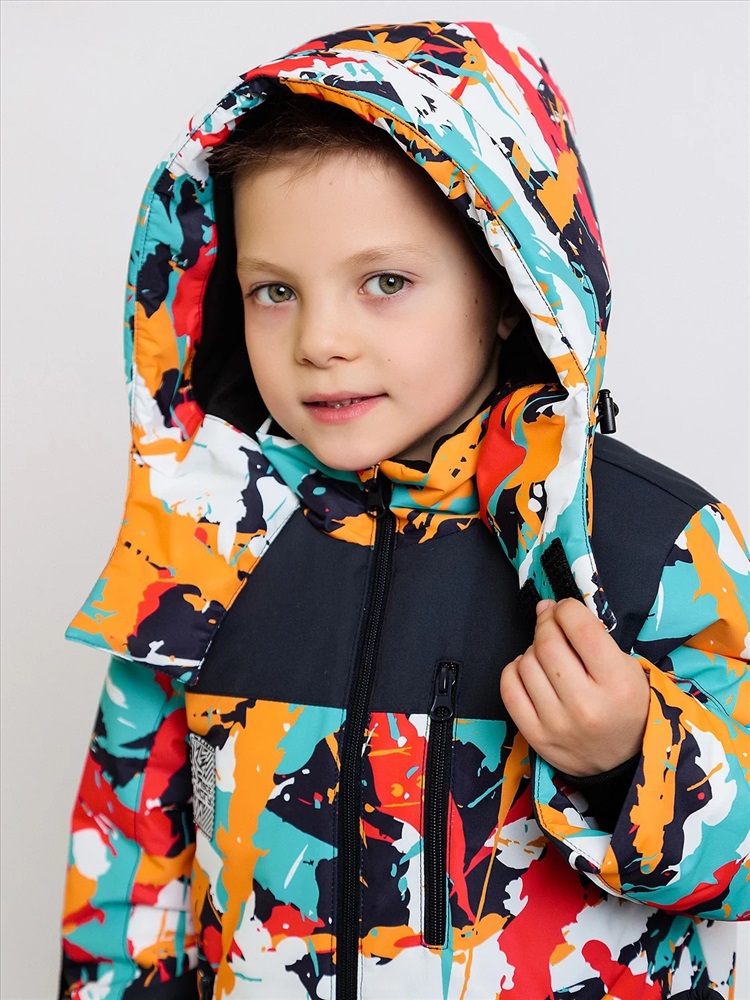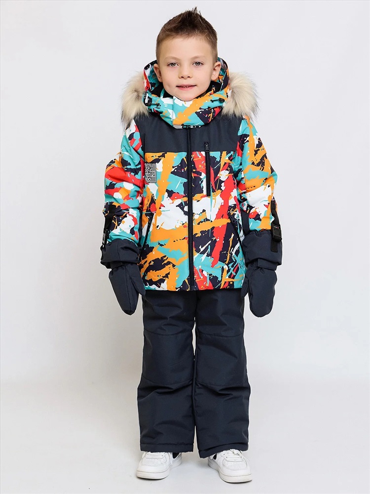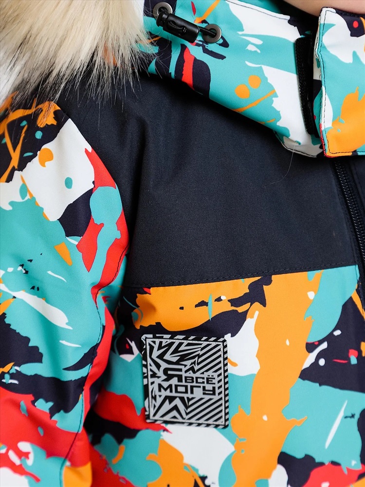 Стильный зимний комплект для мальчика Фарес черный с ярким абстрактным принтом. Выполнен из плотной, но достаточно мягкой ткани с мембранным покрытием, что делает его устойчивым к холоду и влаге. Подклад из флиса способен долгое время сохранять тепло и при активной деятельности отводить влагу наружу. Черные нашивки по низу брюк для защиты от износа, у молнии установлена внутренняя и внешняя планки от задува и защита от защипа. Вместительные тёплые карманы на молнии, трикотажные манжеты, высокий мягкий воротник-стойка защищает от ветра и позволит не надевать шарф в более тёплую погоду. Удобный капюшон с регулировкой и съемной опушкой, полукомбинезон с завышенной талией - защита от поддува, краги крепятся к изделию на карабин.