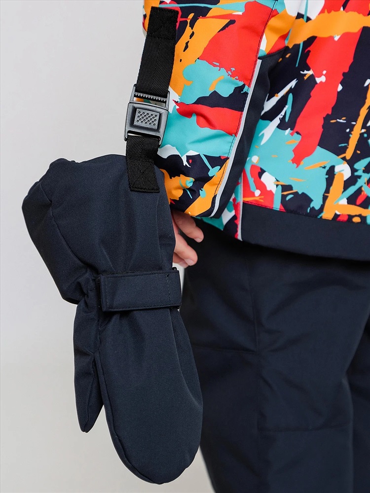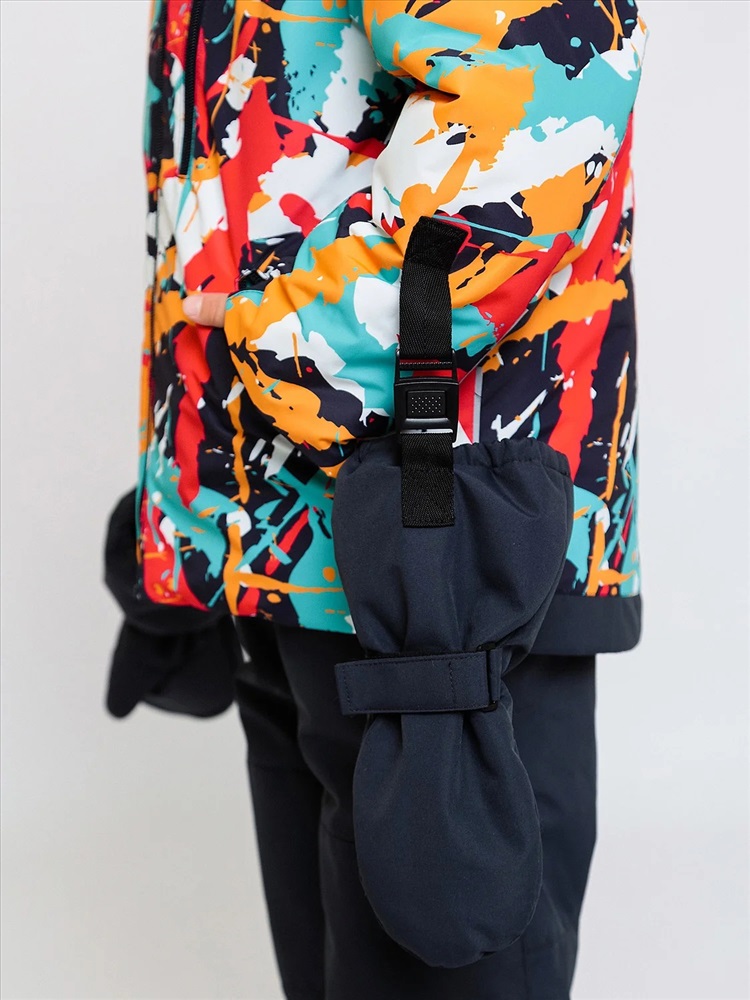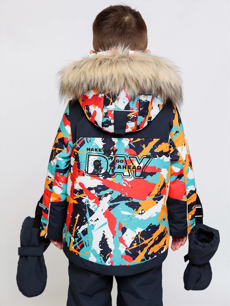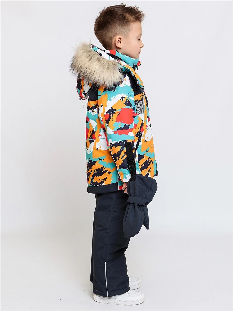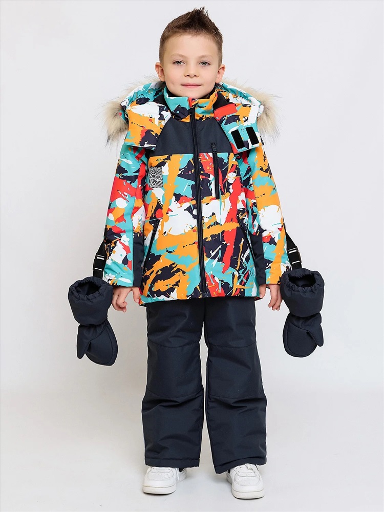 Стильный зимний комплект для мальчика Фарес черный с ярким абстрактным принтом. Выполнен из плотной, но достаточно мягкой ткани с мембранным покрытием, что делает его устойчивым к холоду и влаге. Подклад из флиса способен долгое время сохранять тепло и при активной деятельности отводить влагу наружу. Черные нашивки по низу брюк для защиты от износа, у молнии установлена внутренняя и внешняя планки от задува и защита от защипа. Вместительные тёплые карманы на молнии, трикотажные манжеты, высокий мягкий воротник-стойка защищает от ветра и позволит не надевать шарф в более тёплую погоду. Удобный капюшон с регулировкой и съемной опушкой, полукомбинезон с завышенной талией - защита от поддува, краги крепятся к изделию на карабин.