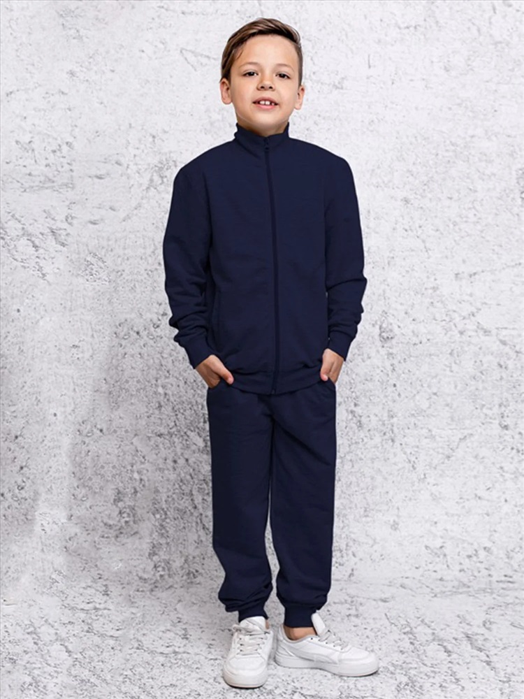 Костюм спортивный без капюшона синий из футера: пуловер и брюки. Пуловер без капюшона на молнии с воротничком и карманами. Брюки на резинке со шнурком и боковыми карманами.