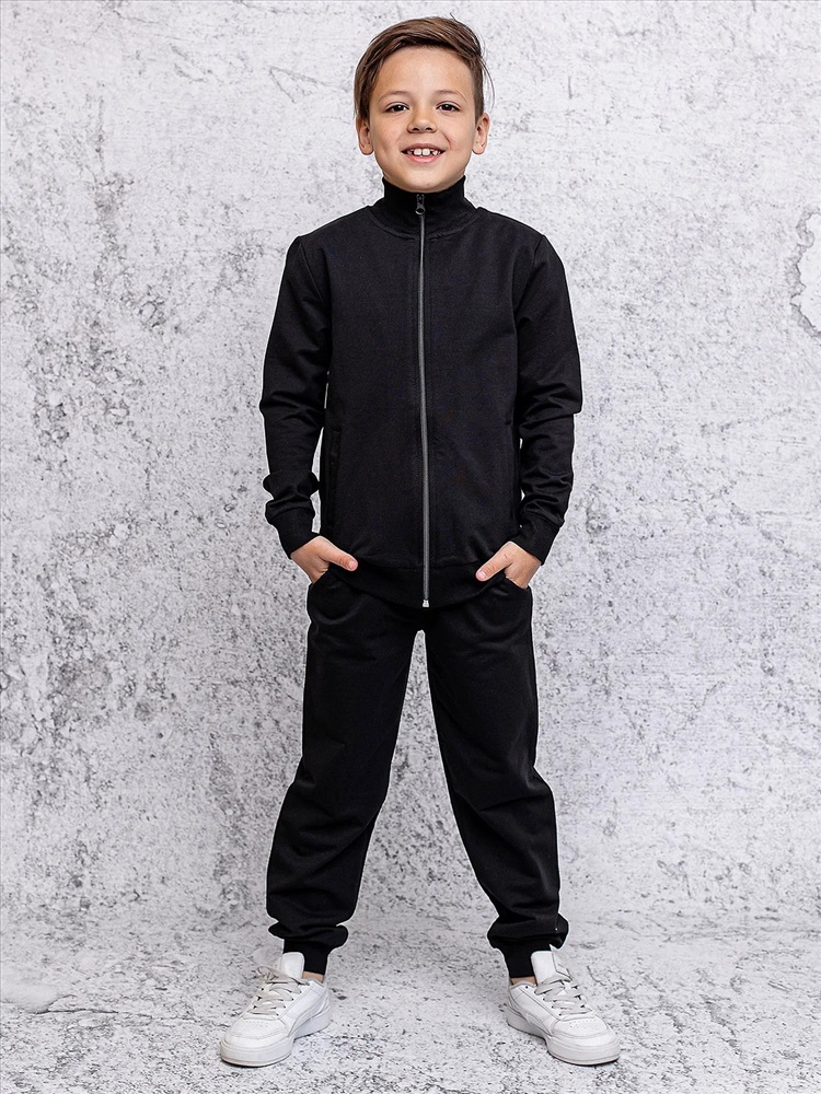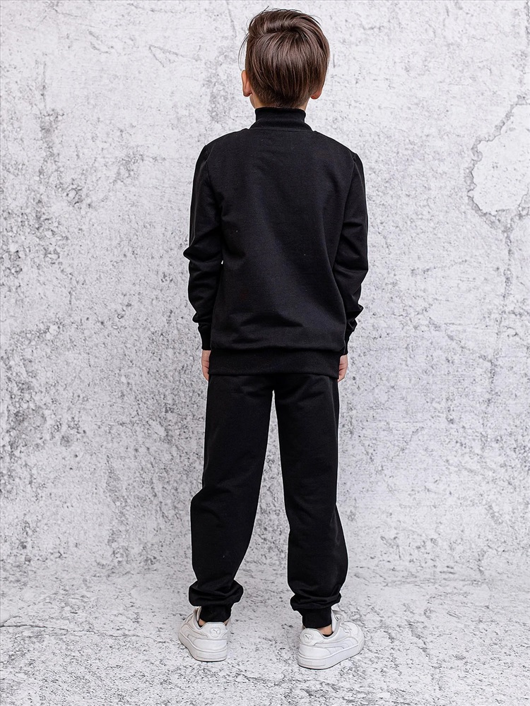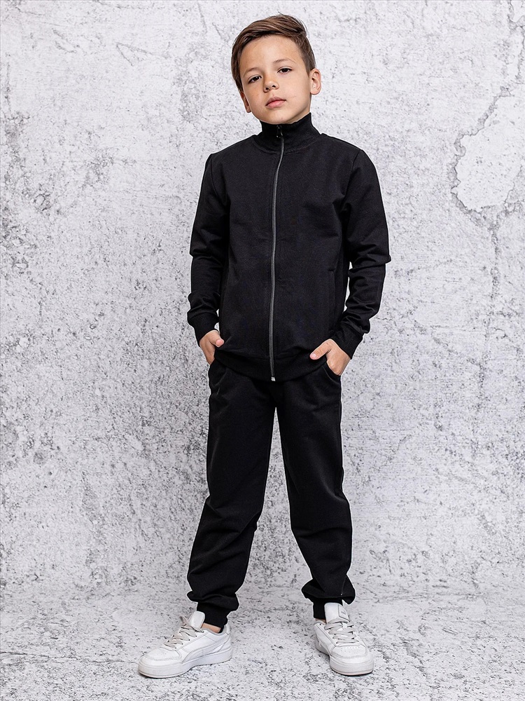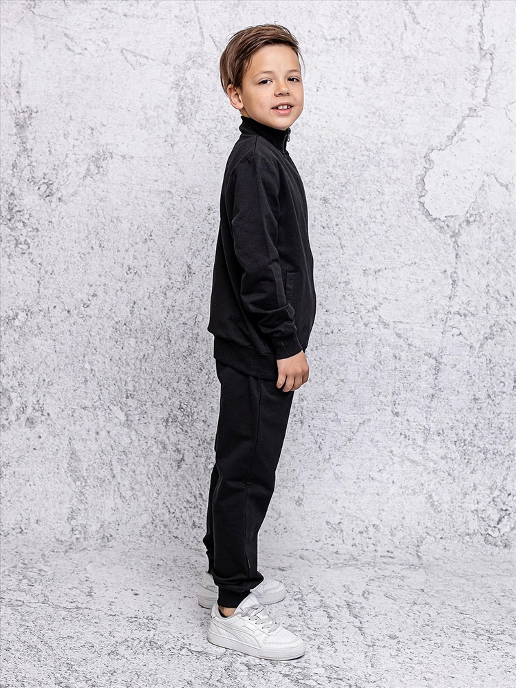 Костюм спортивный без капюшона черный: пуловер на молнии и брюки. Спортивный костюм из футера - обязательное приобретение для в детского гардероба. Очень стильный и удобный спортивный костюм для детей смотрится стильно и сочетается с любым цветом кроссовок.