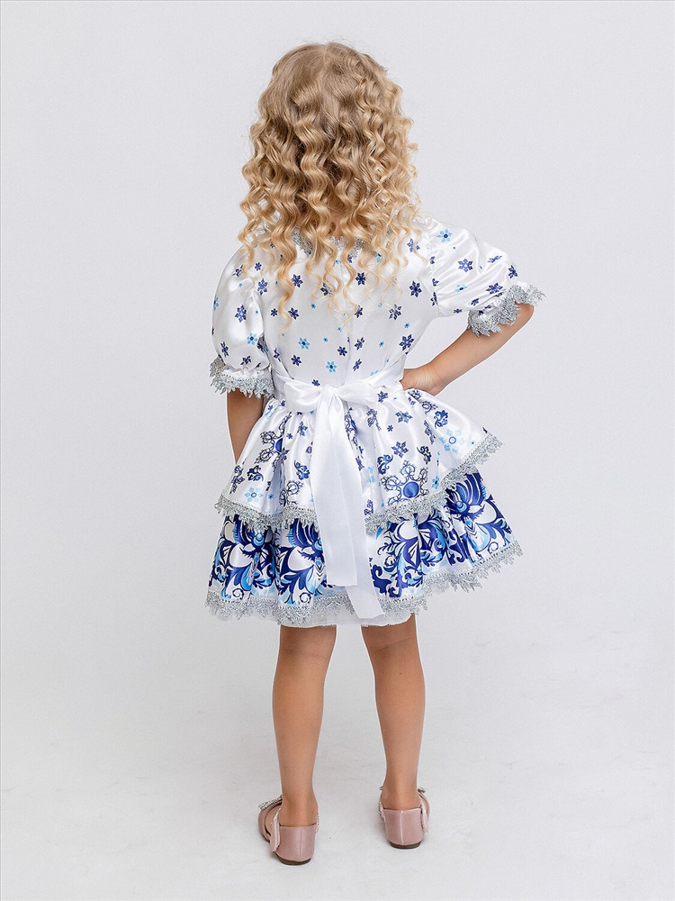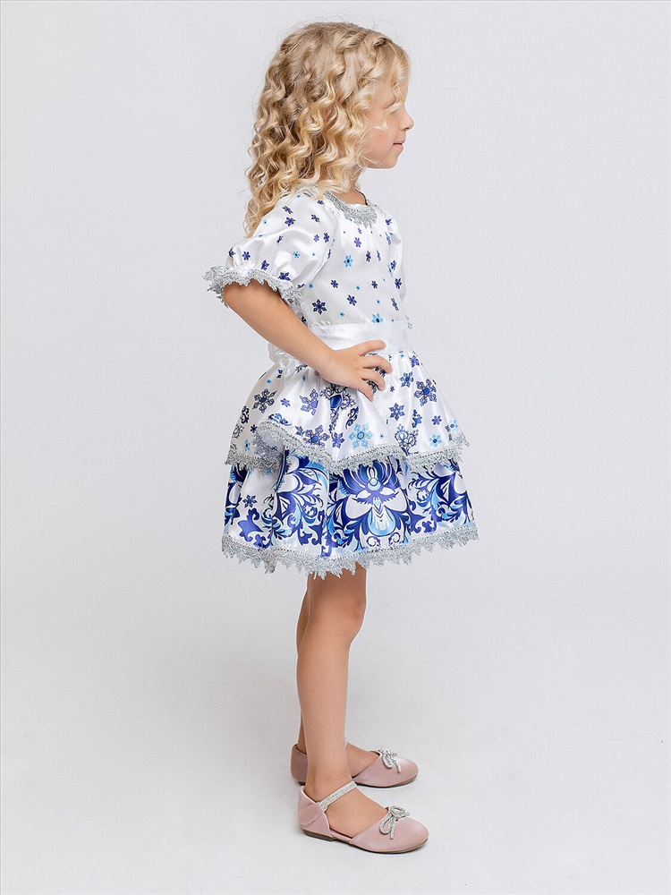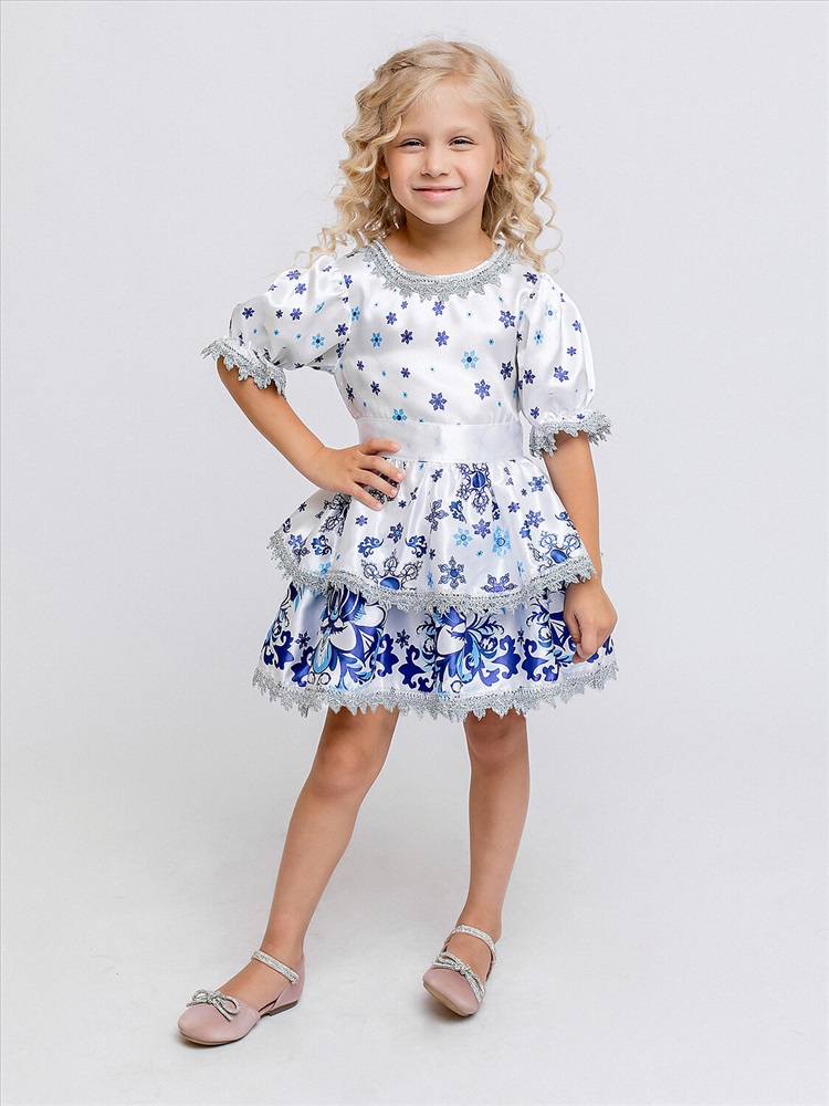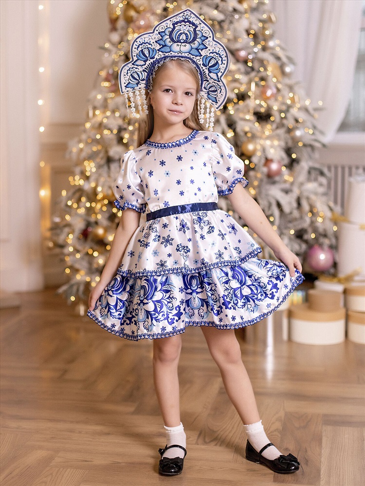 Карнавальный костюм Зима Белоснежная для девочки 3-6 лет. В комплекте платье и кокошник. Платье белое с коротким рукавом и узором гжель. Оторочено узорной тесьмой по краям. Костюм Зимы подойдет девочкам на Новый год: для театрализованных представлений и фотосессий.