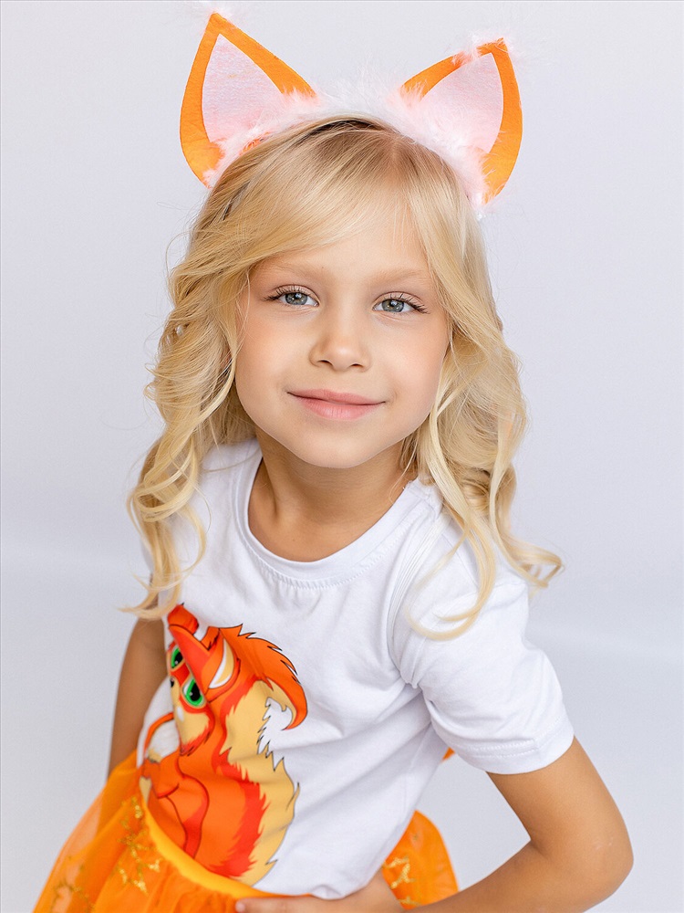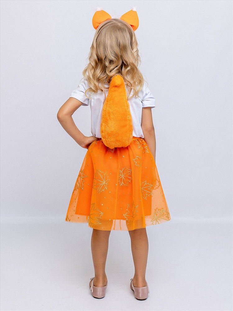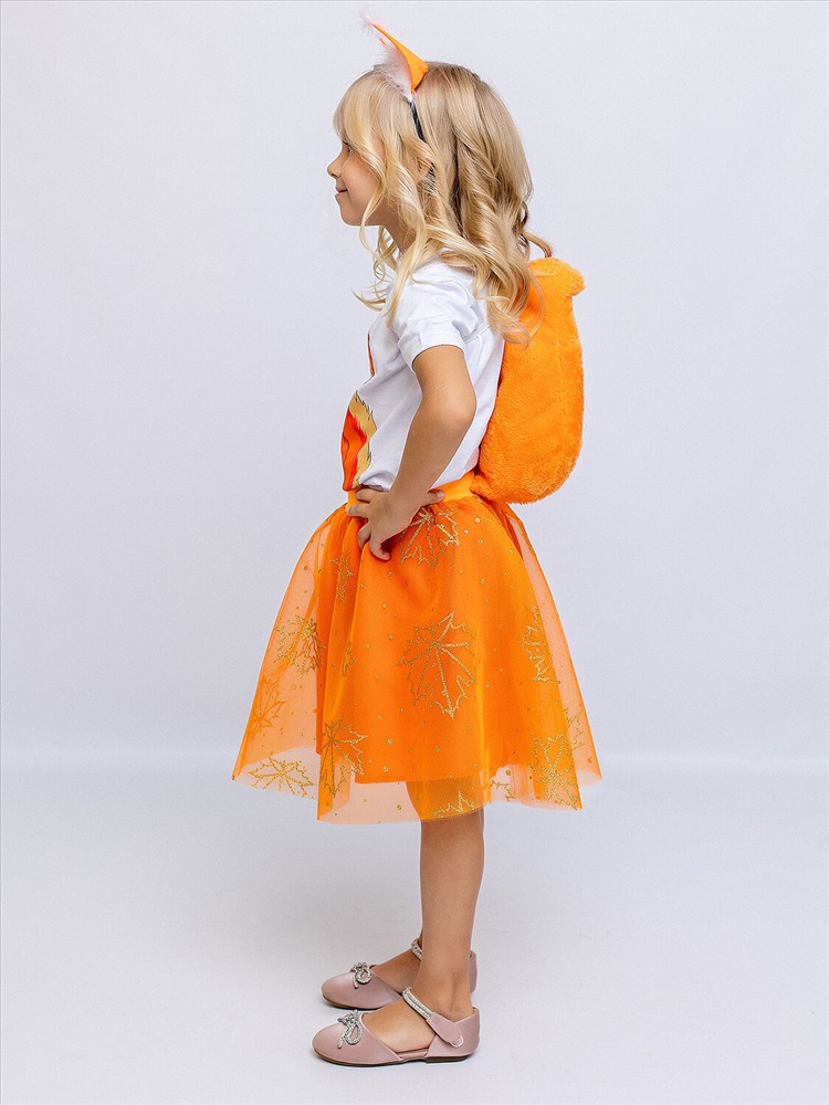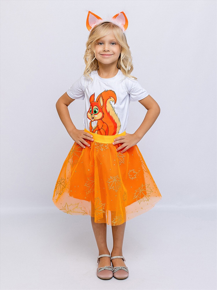 Карнавальный костюм Белочки детский от batik. Комплект включает ушки на ободке, футболку с принтом в виде белочки, юбку из сетки и съемный хвост. Юбка оранжевая, сшита из фатина средней жесткости и хлопка, она прекрасно держит форму. Удобство костюма состоит в том, что его детали можно носить отдельно друг от друга в повседневной жизни.