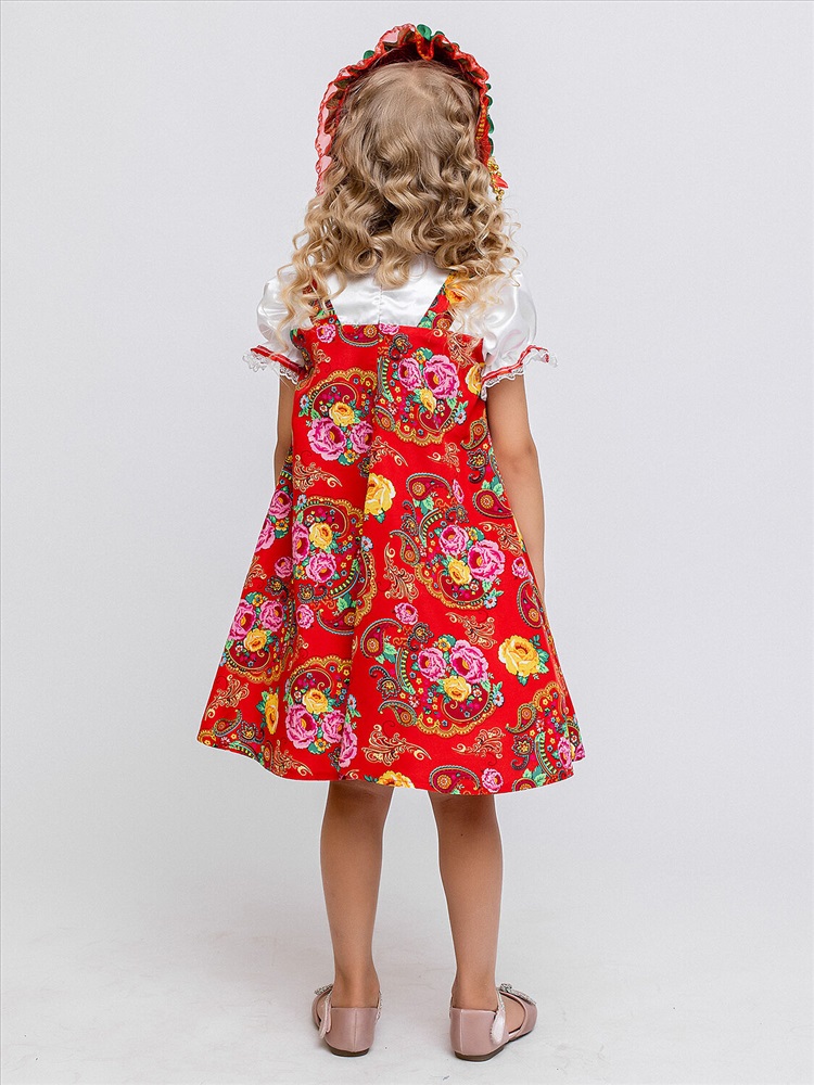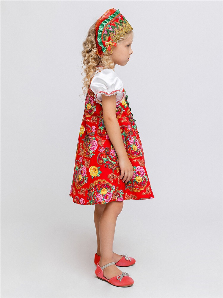 Карнавальный костюм Красна-девица детский: платье и кокошник. Девочка в таком костюме сможет почувствовать себя настоящей сказочной царевной, если она выступает на утреннике, играет в спектакле или просто идет на костюмированный праздник. Платье с короткими объемными рукавами и народным узором.