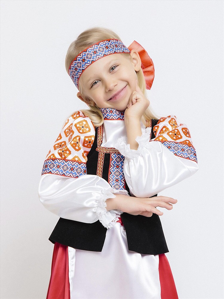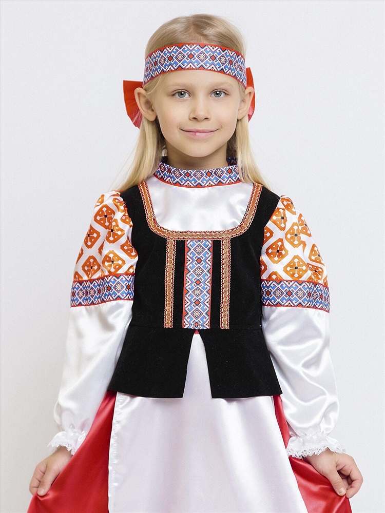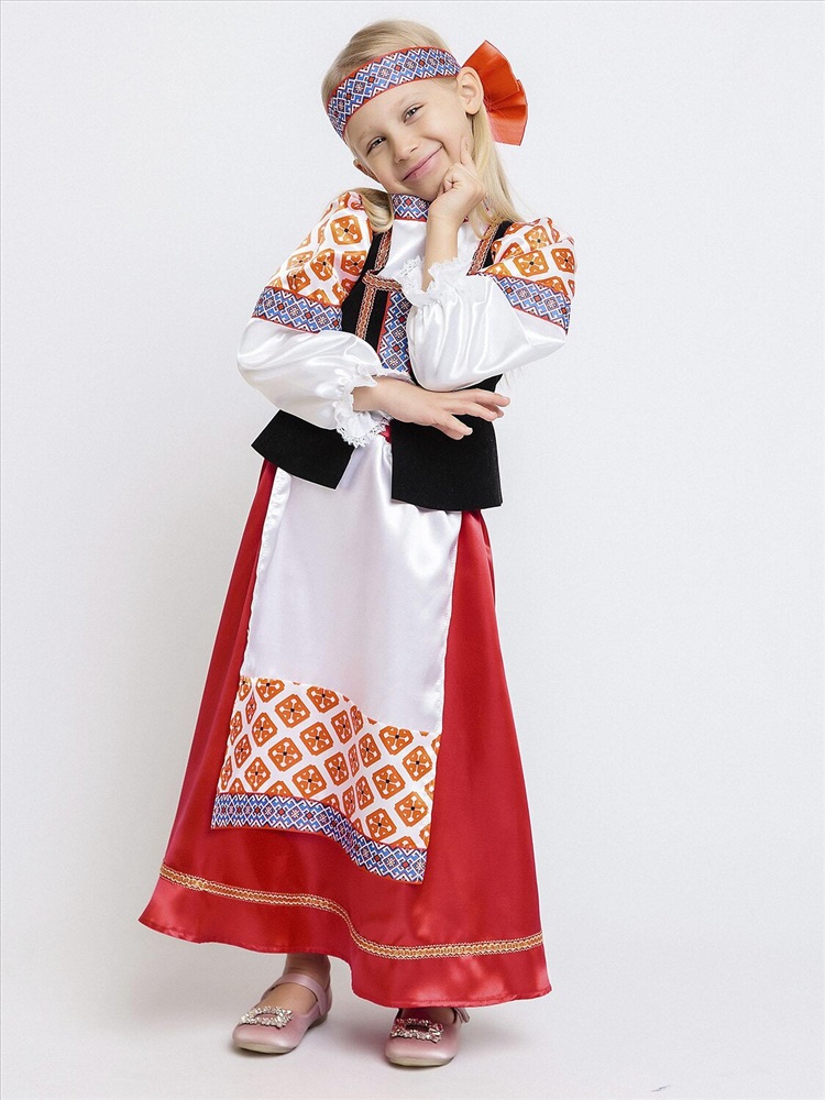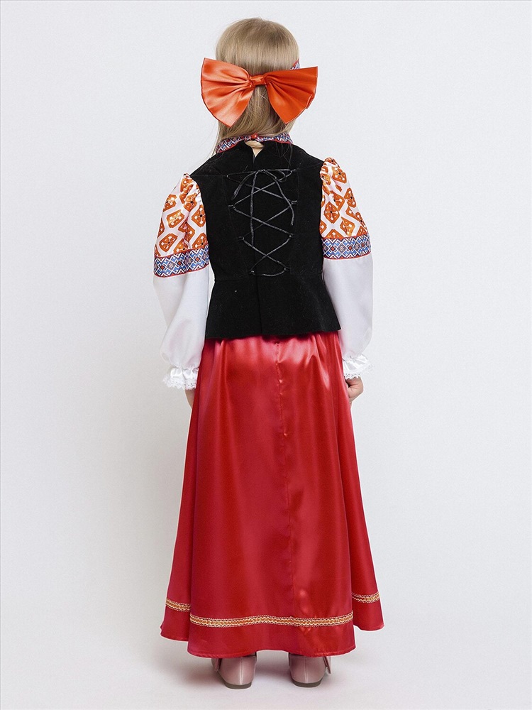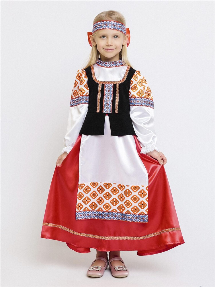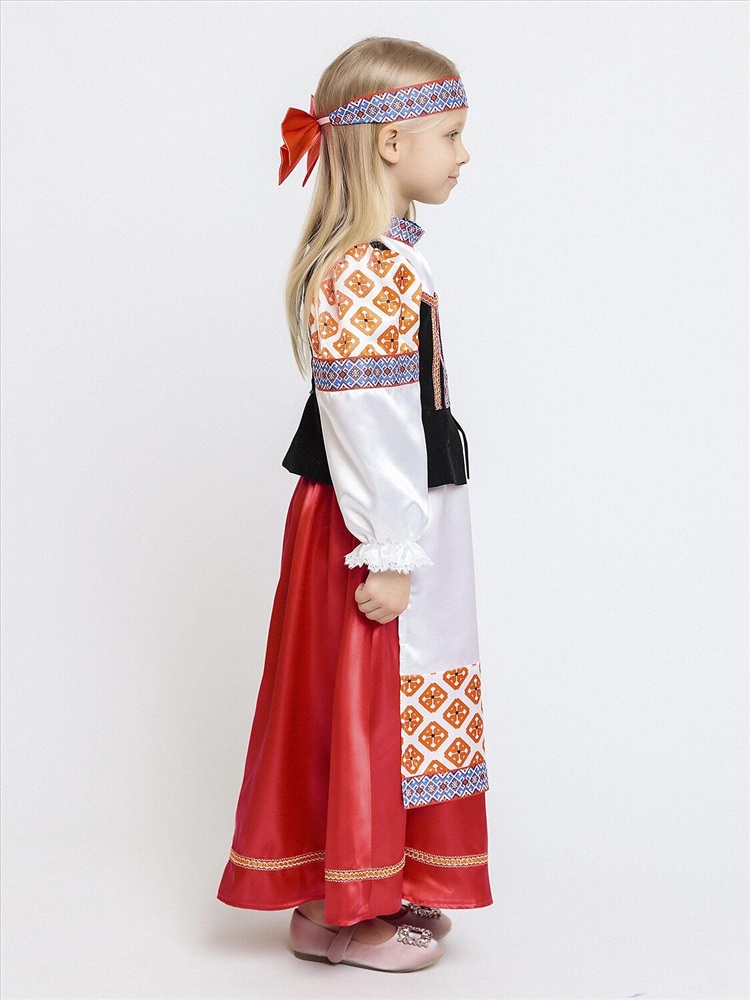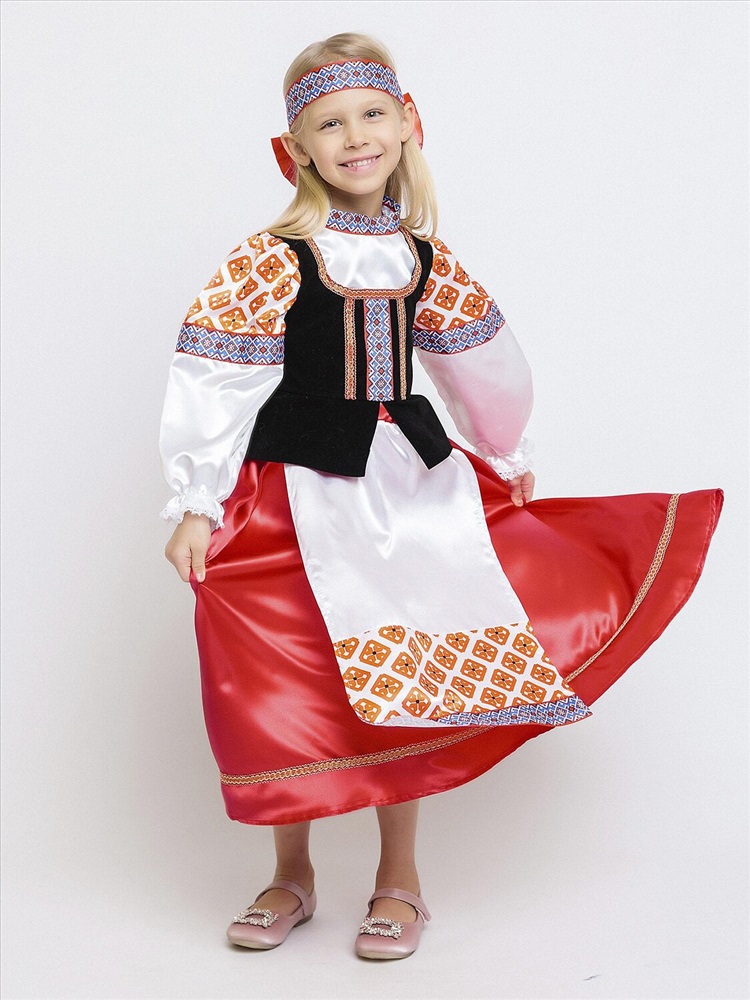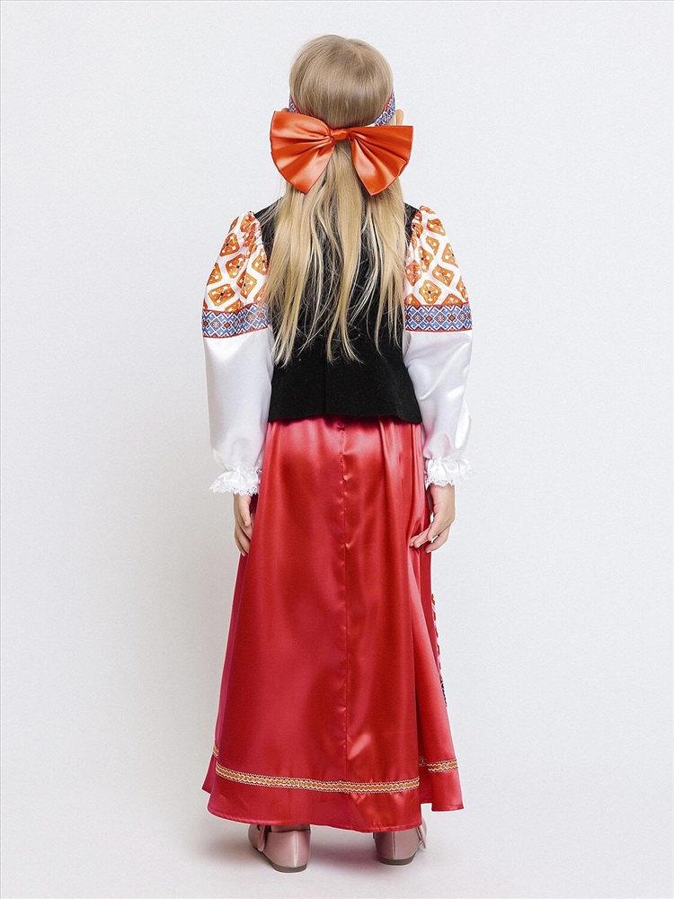 Карнавальный костюм для девочки Дарёнка - красивый образ в народном стиле для выступлений и утренников. В комплекте блузка с длинными рукавами, длинная юбка и повязка с орнаментом. Блузка с вшитой черной жилеткой и узорами. Юбка красная с вшитым передником. Повязка на голову украшена объемным красным бантом сзади. Карнавальный костюм позволит почувствовать себя царевной из русской сказки.