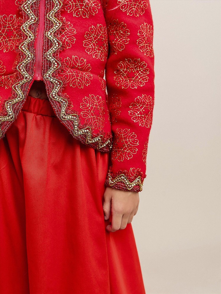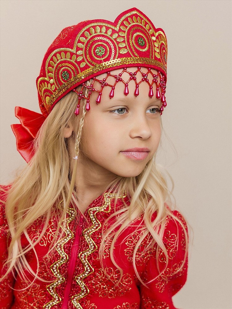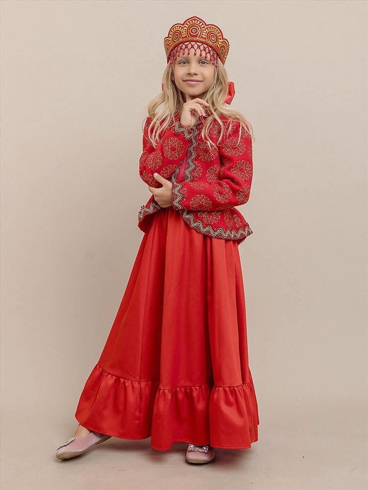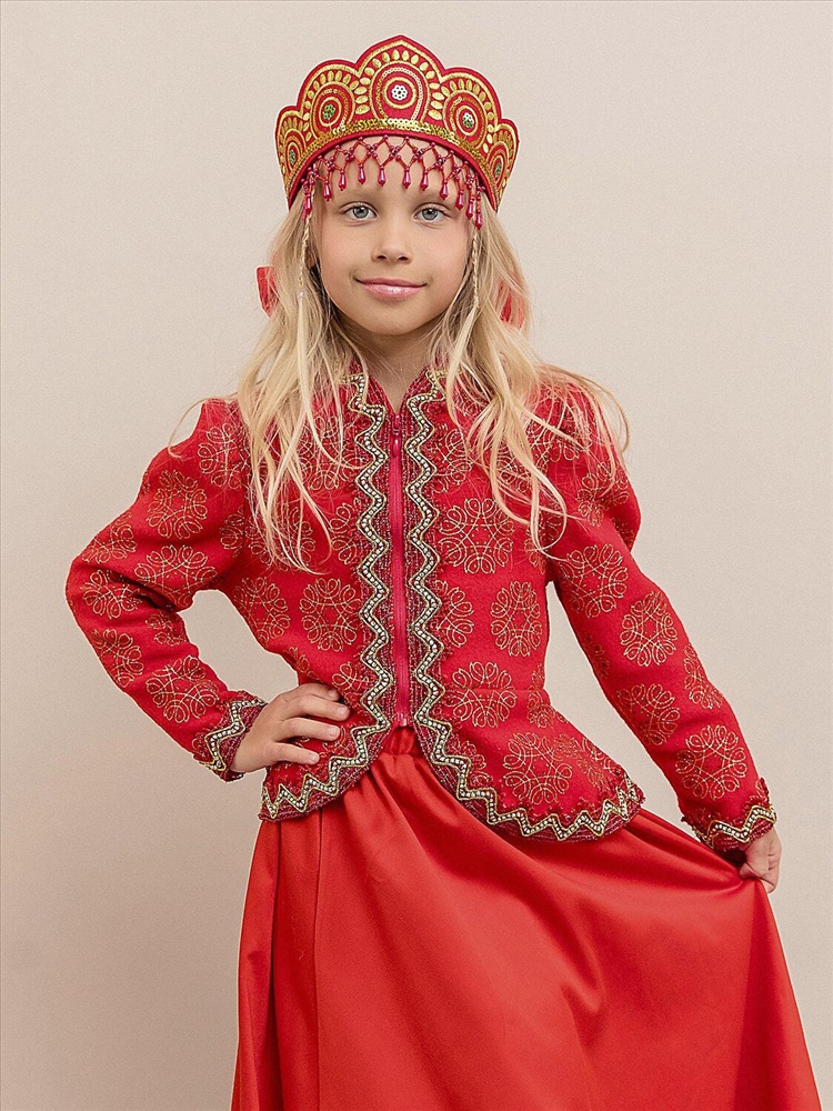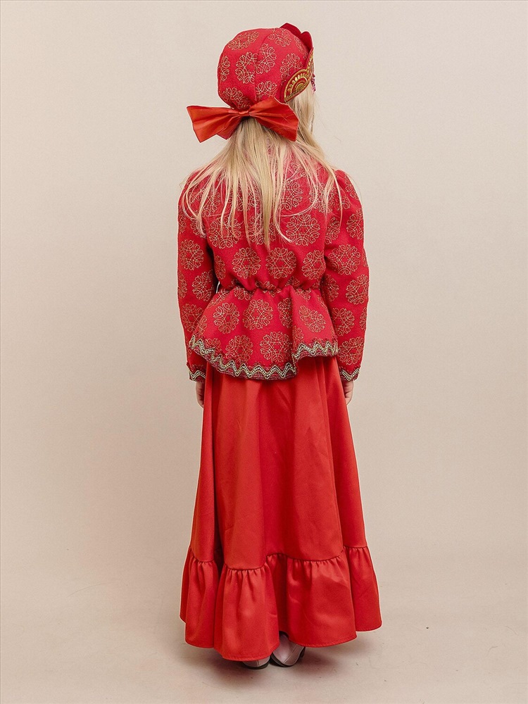 Детский карнавальный костюм "Дуняша" – очаровательный народный образ для девочки. Комплект включает: кокошник с традиционными узорами, длинную юбку на резинке, кафтан на молнии. Роскошная цветовая гамма – сочное сочетание красного с золотым орнаментом.