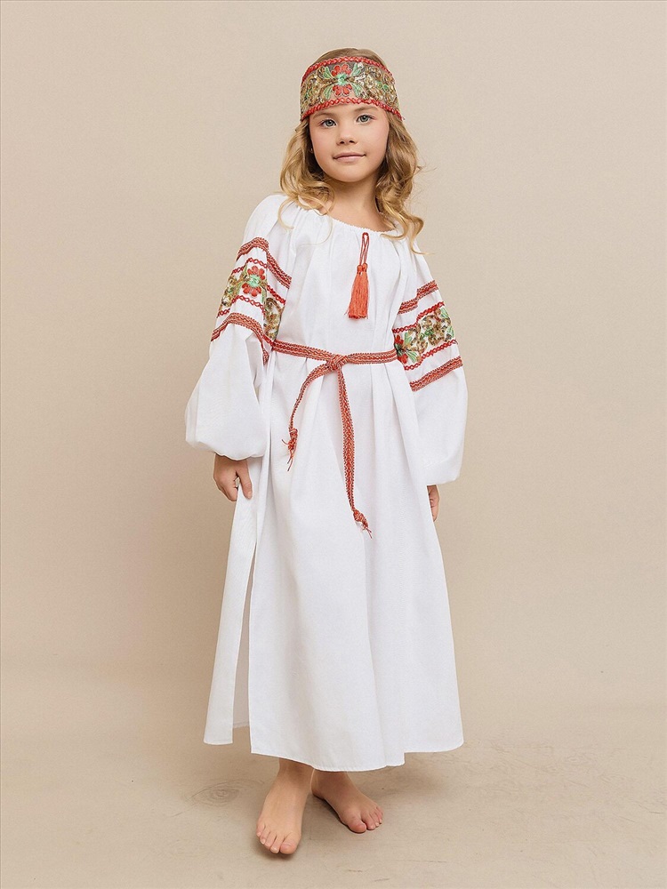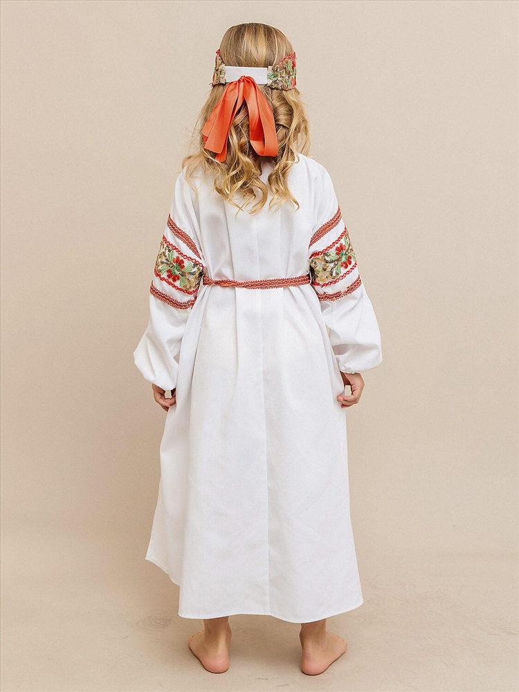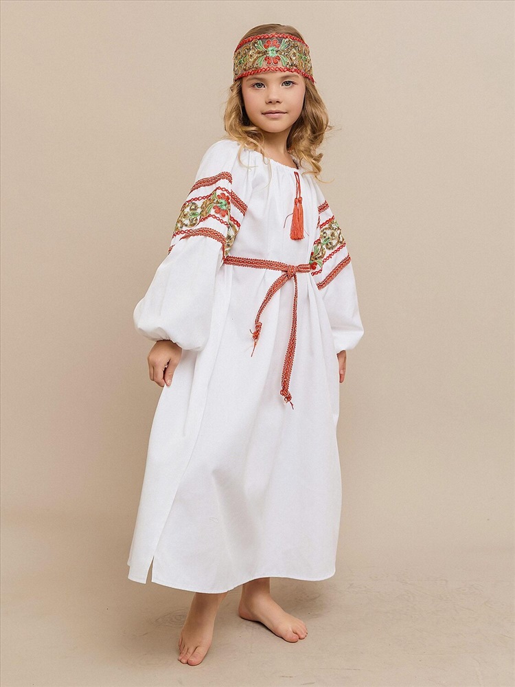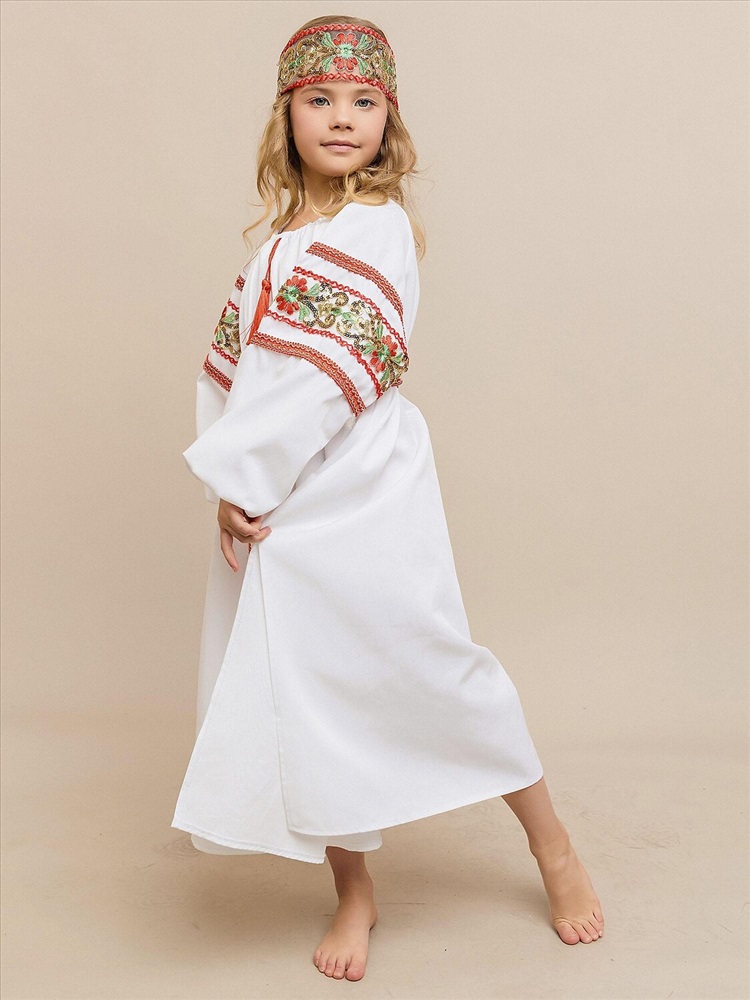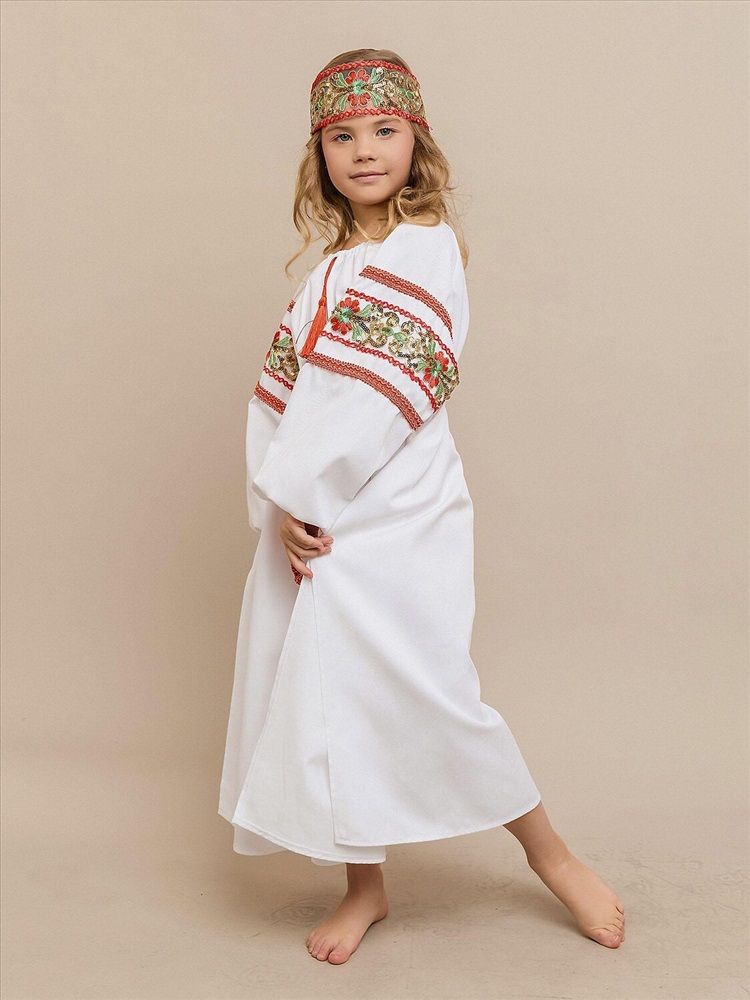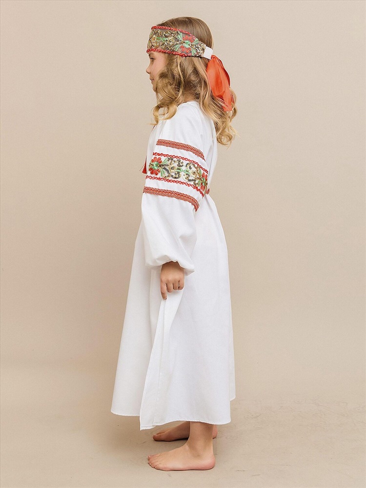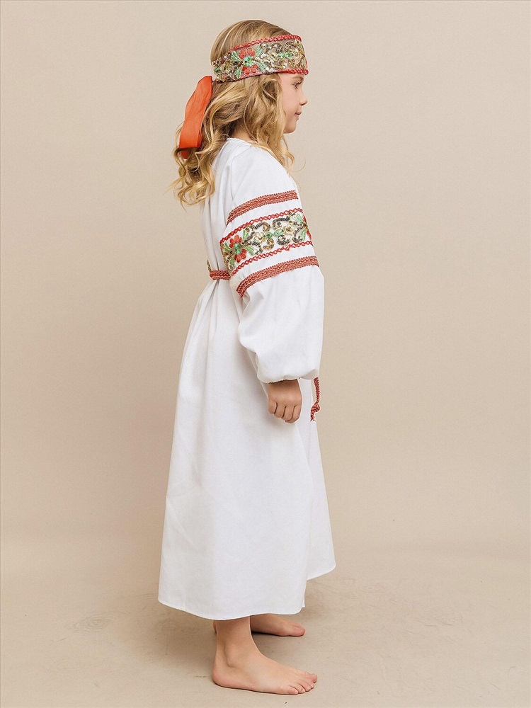 Карнавальный костюм «Купава» — наряд в народном стиле для девочки. В комплект входят платье-рубашка и повязка на голову. Лёгкий и удобный костюм прекрасно подойдёт для утренников, народных праздников и театральных постановок, создавая образ русской красавицы.