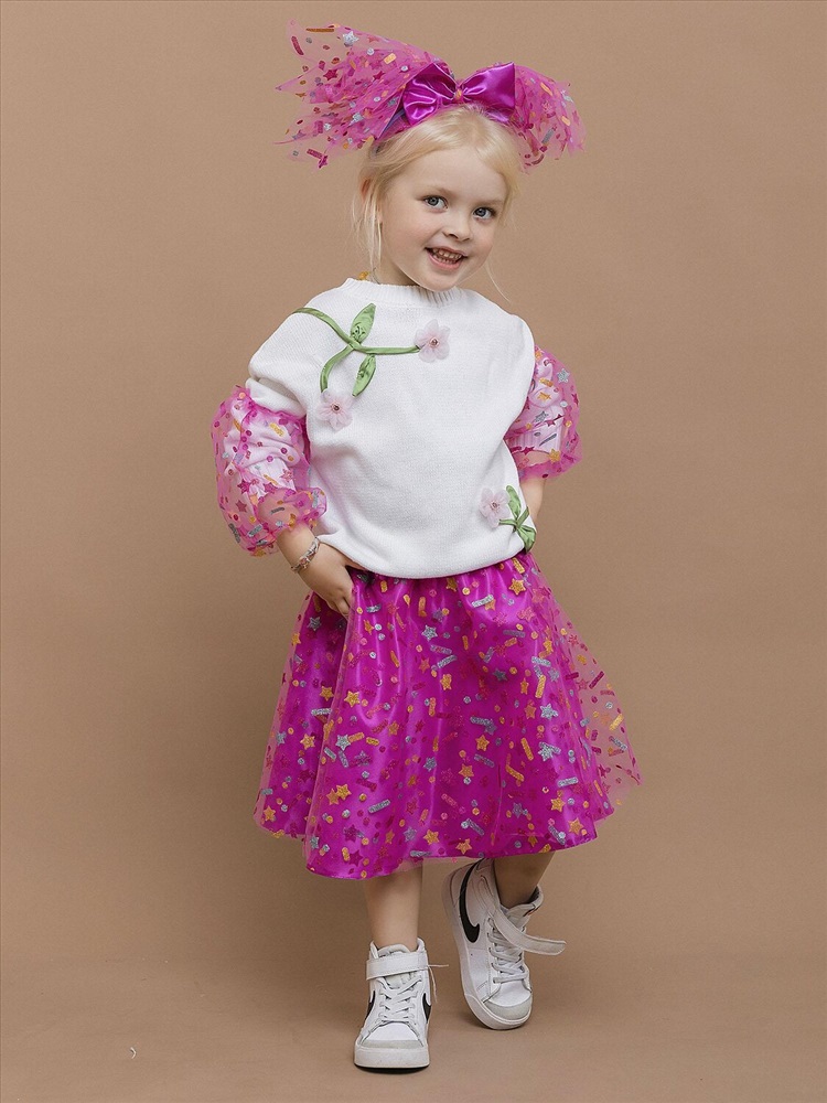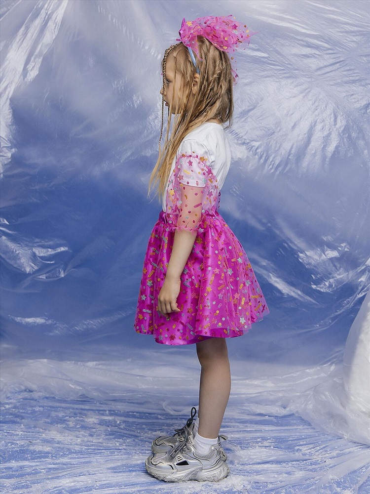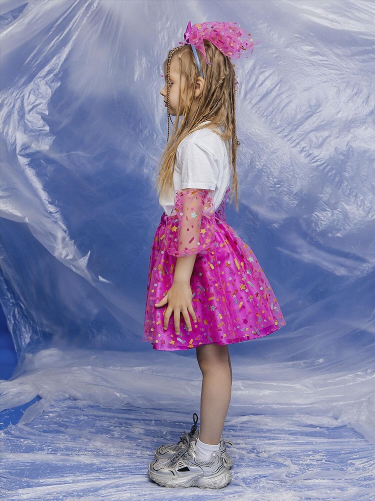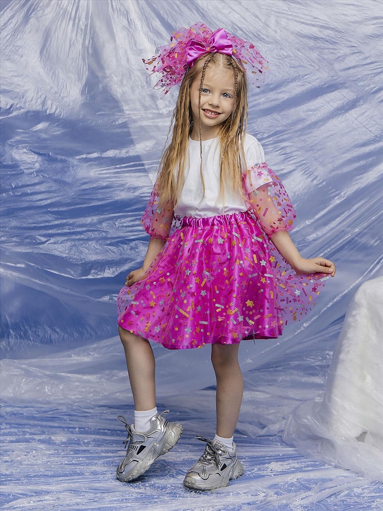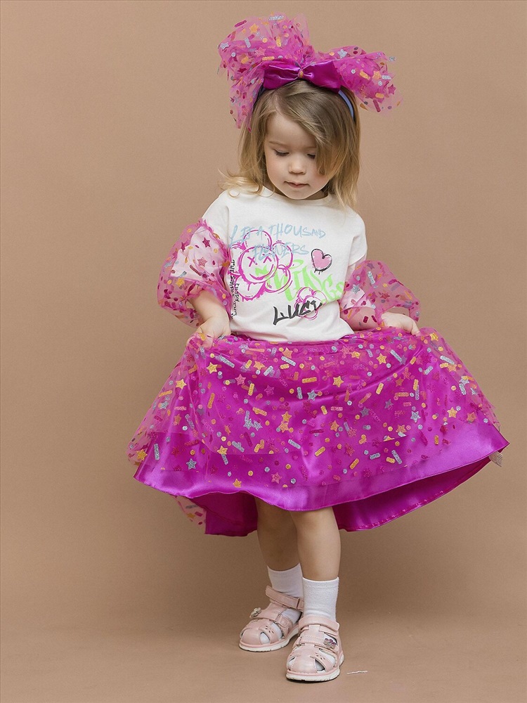 Карнавальный костюм Хлопушка – взрыв ярких эмоций и праздничного настроения. В комплекте: пышная юбка, съемные рукава на резинках, яркий ободок с бантом. Съемные элементы позволяют дополнять образ по настроению. Приятные к телу материалы позволяют свободно двигаться и танцевать.