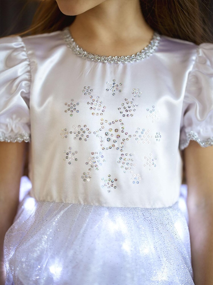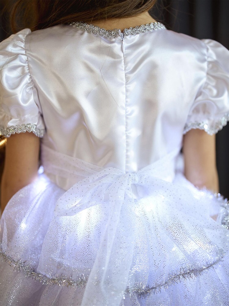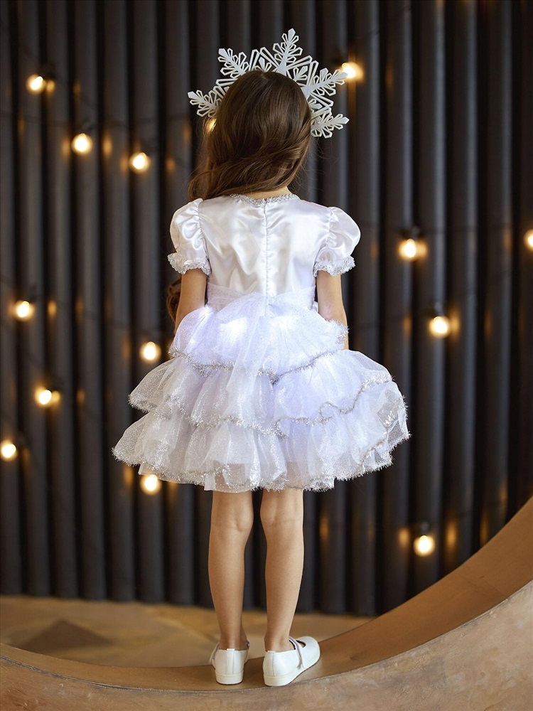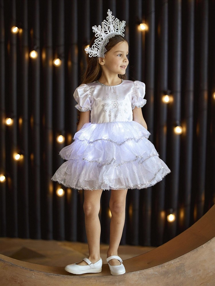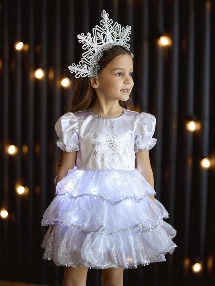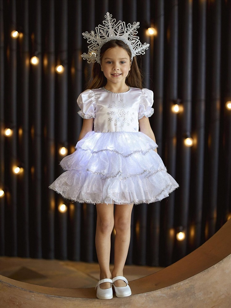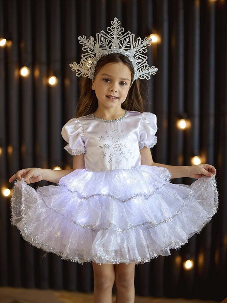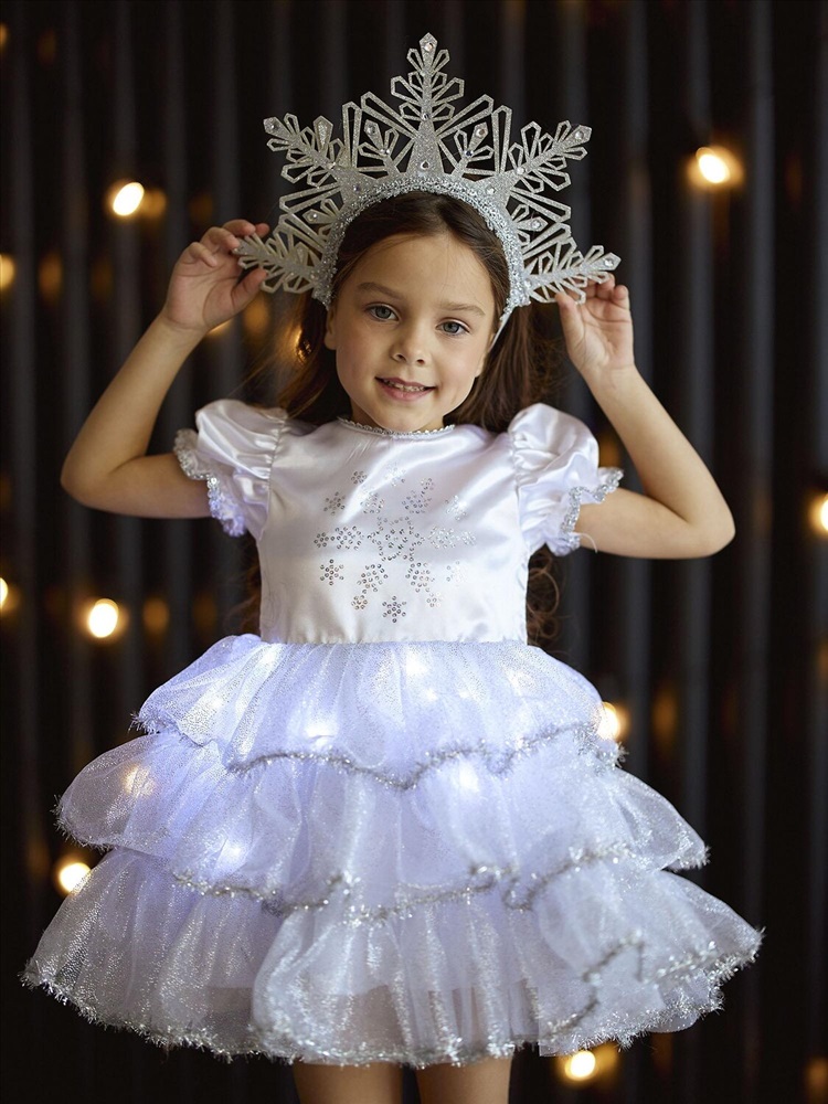 Детский карнавальный костюм Снежинка Аврора белый на Новый год. Комплектация: платье со светодиодами, кокошник.