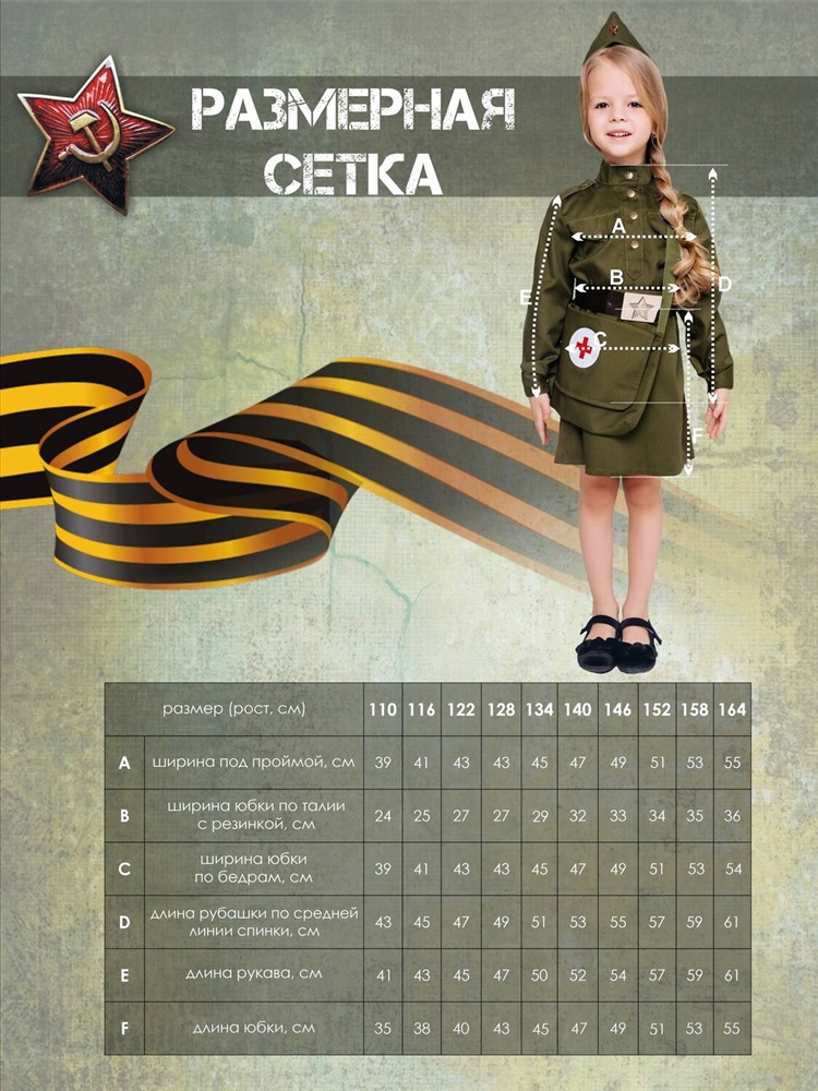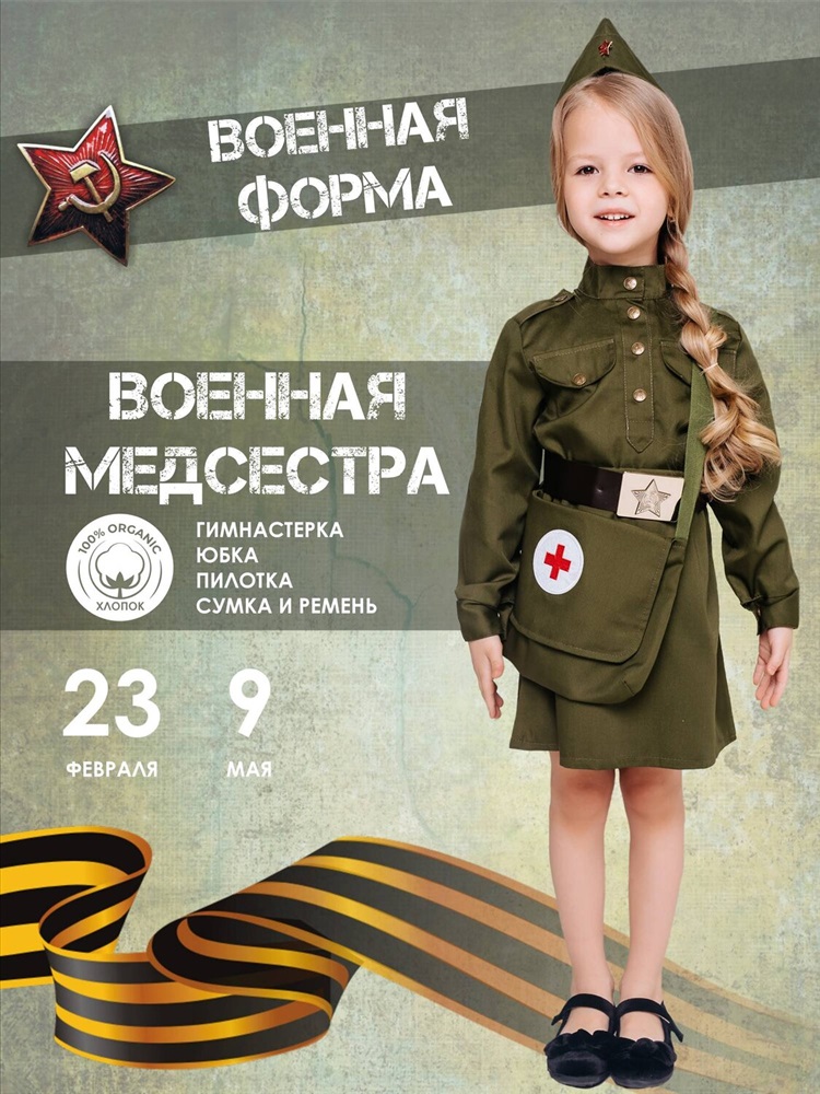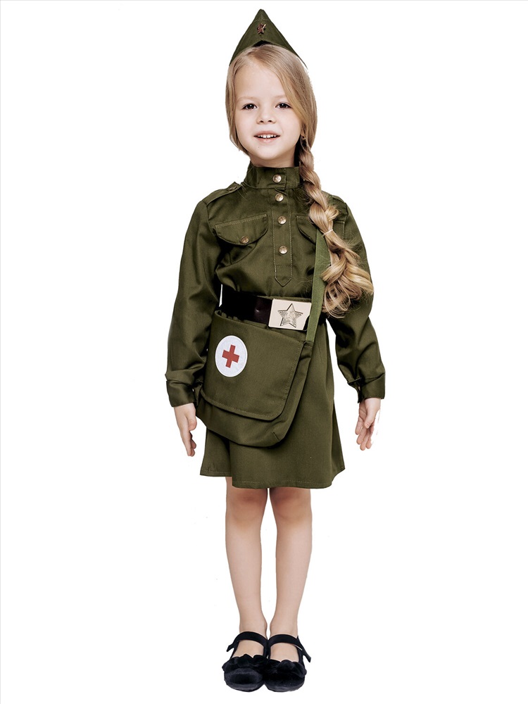 Костюм Военная Медсестра для девочек к праздникам 9 мая и 23 февраля представлен в широком ассортименте размеров от 4-х до 12 лет. В комплекте образа гимнастерка, юбка, пилотка, сумка и ремень.