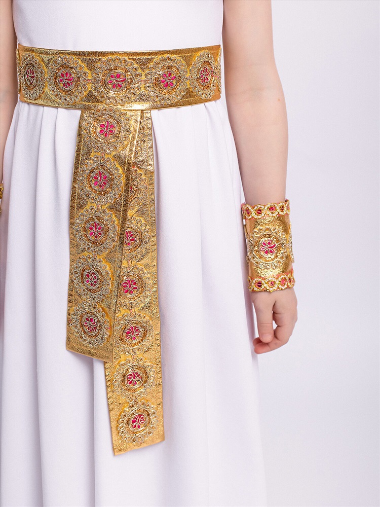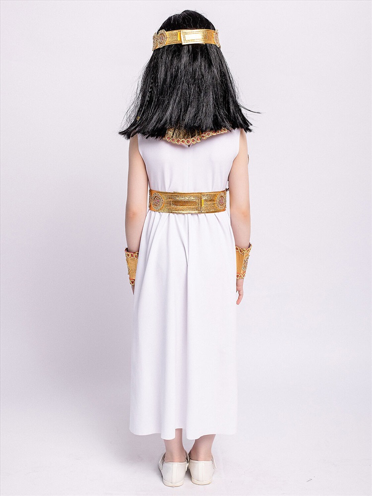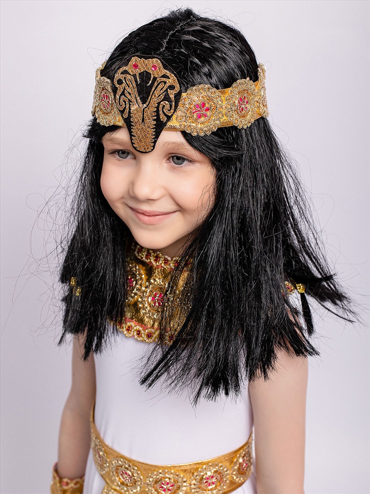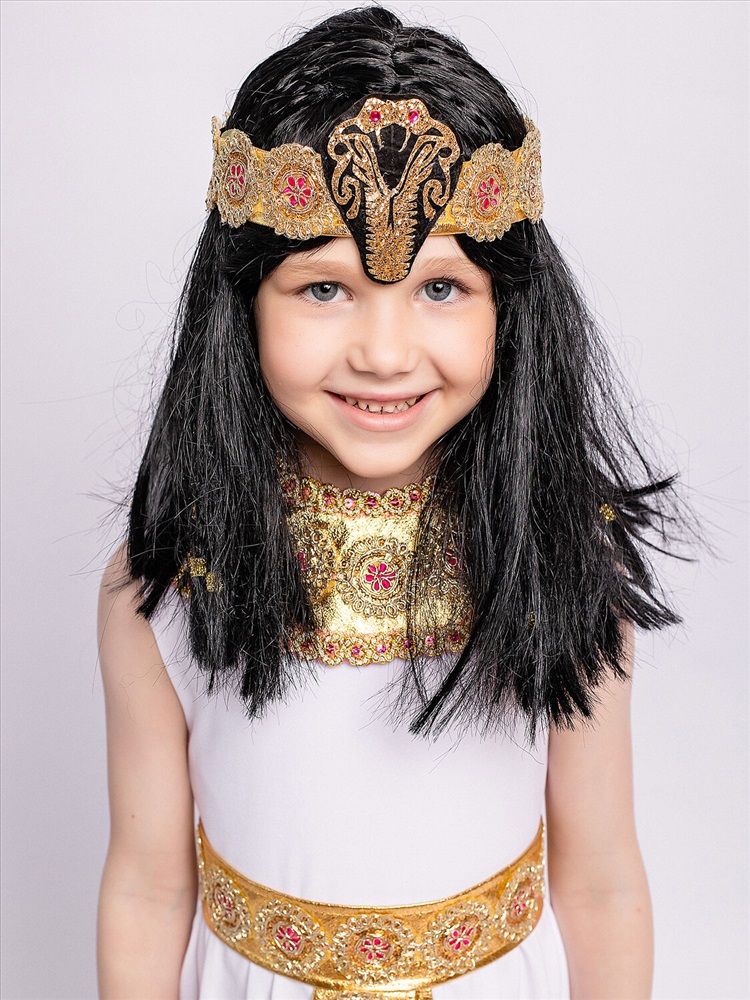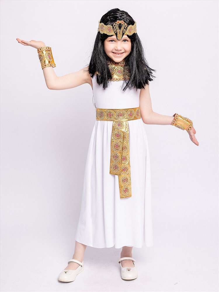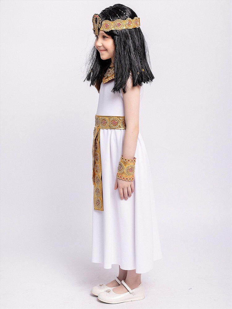 Карнавальный костюм Клеопатра для девочки представляет собой длинное белое трикотажное платье без рукавов. На спинке застежка-молния, оплечье, пояс, наручи и повязка на голову на застежке велкро. Также в комплекте черный парик.
