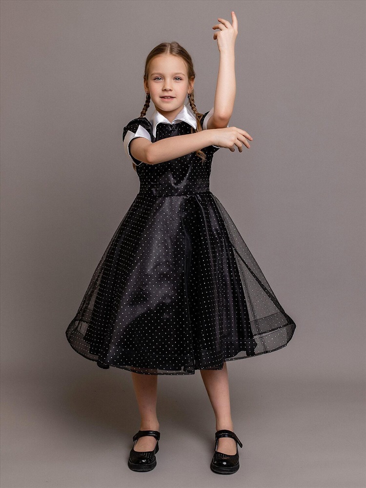 Нарядное платье из сериала Wednesday - настоящий хит для девочек от 6 до 10 лет. Модное платье Уэнсдей станет великолепным нарядом на выпускной, Хэллоуин, тематическую фотосессию или день Рождения. Платье черного цвета с мелкий горошек с коротким рукавом. Имеет белый отложной воротник, верхняя часть из сетчатой черной ткани.