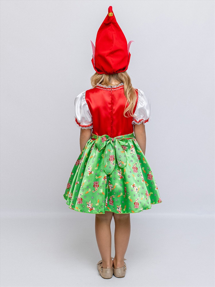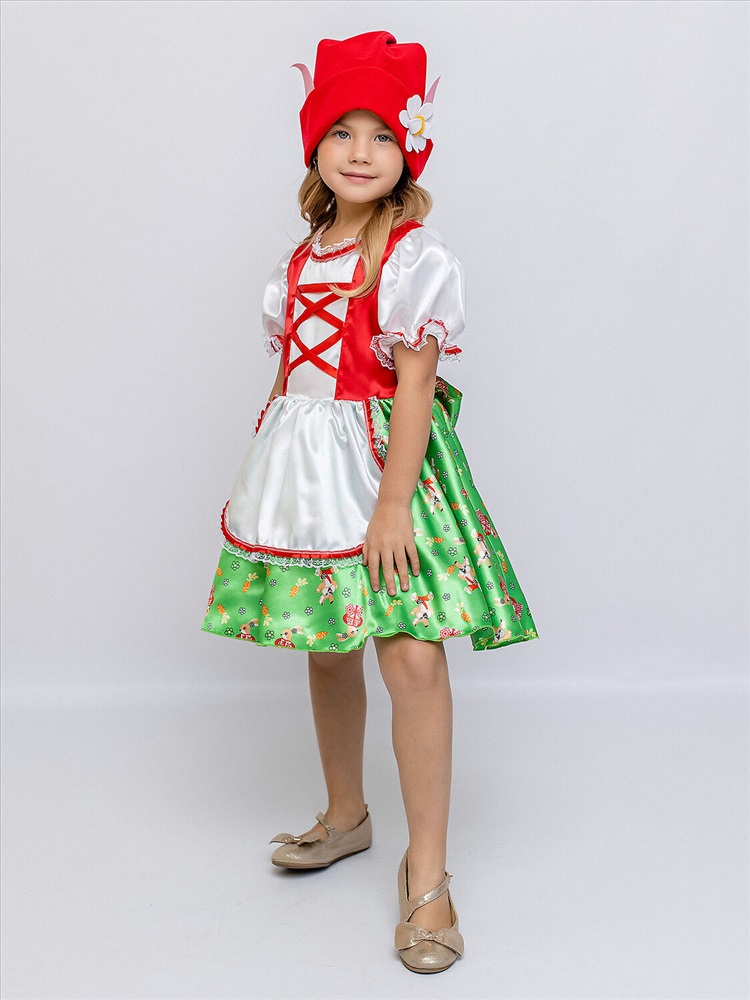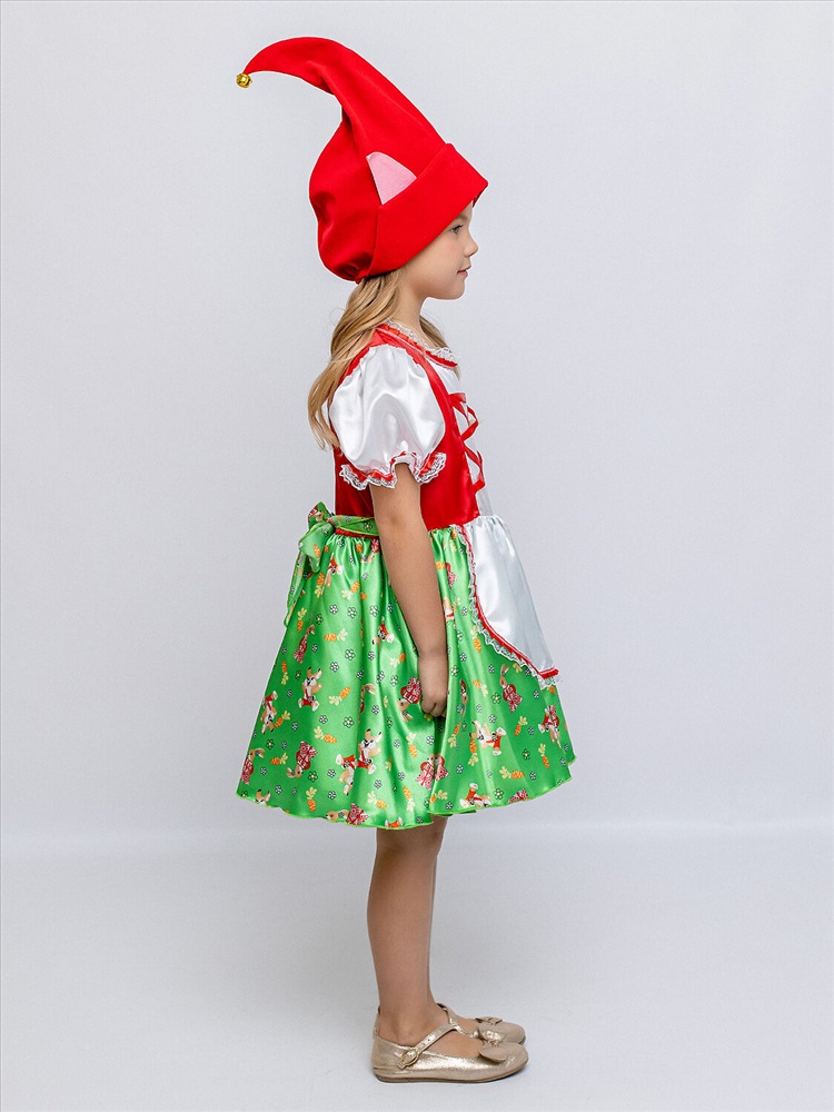 Карнавальный костюм для девочки Гномик Тася. В комплекте платье с коротким рукавом и красный колпак с цветком. Платье с пышной зеленой юбкой с рисунком, рукава-фонарики и ажурная оторочка воротника.
