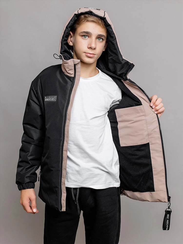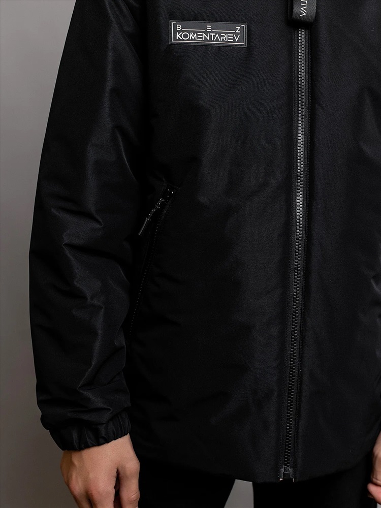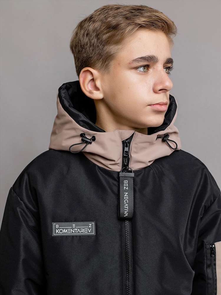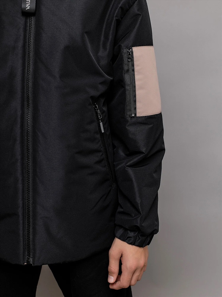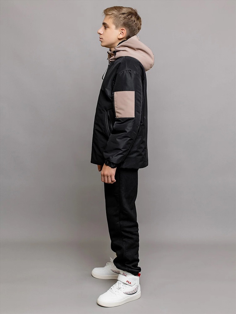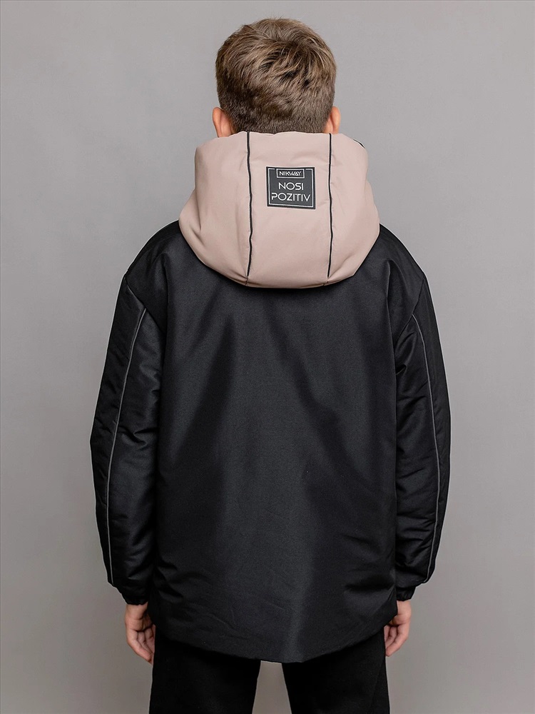 Куртка для мальчика Спейси черная объёмная со спущенной линией проймы из мембранной ткани. Анатомичный крой рукава для комфорта движения. Подкладка спинки и полочки из мягкого хлопкового трикотажа. Подклад рукавов из гладкой приятной таффеты обеспечит удобное одевание и снятие, а также легкий уход и быстрое высыхание. Центральная застёжка на молнию с внутренней ветрозащитной планкой и защитой от защипа подбородка. Воротник из мягкого трикотажа. Капюшон и низ куртки с регулировкой на резинке. На левом рукаве накладной карман на молнии с патчем из отделочной ткани. Капюшон и карман левого рукава из отделочной ткани контрастного цвета. Светоотражающие элементы: кант в капюшоне, локтевых швах руквов, светоотражающие нашивки на капюшоне и правой полочке, патч и навес на молниях.