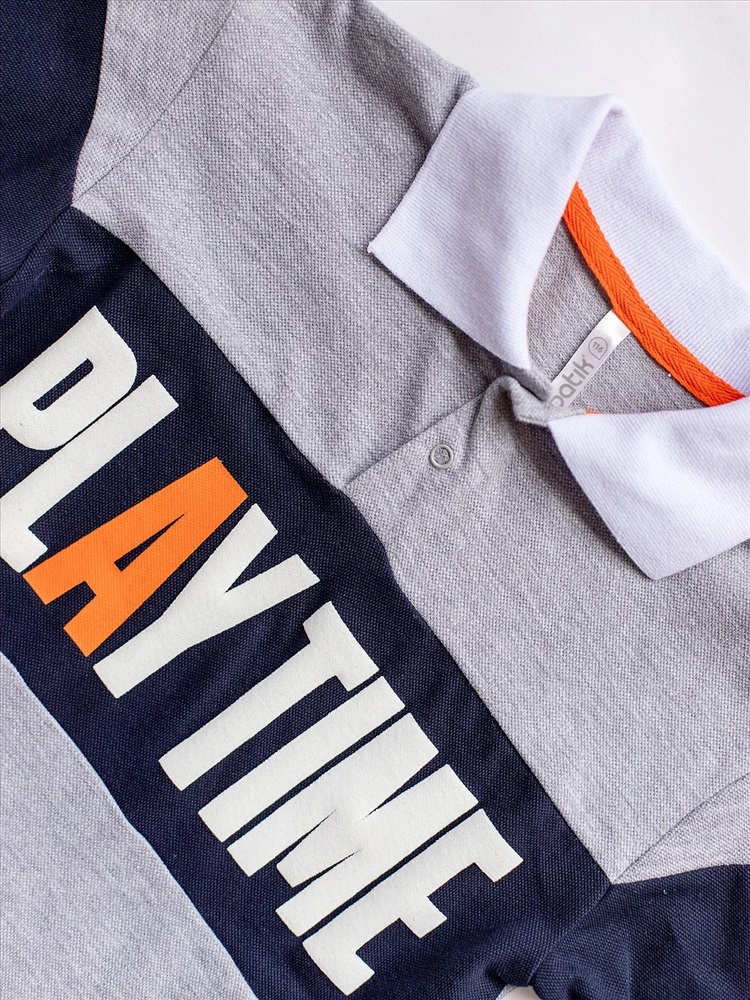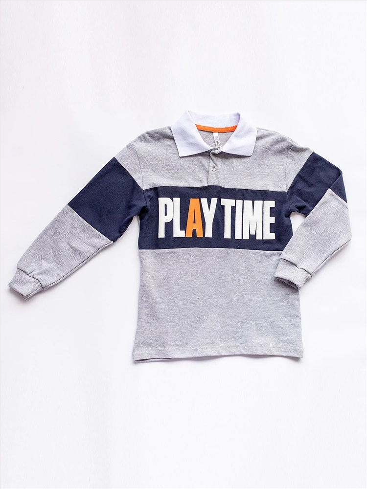 Футболка с длинным рукавом поло серо-синяя с надписью на груди.
