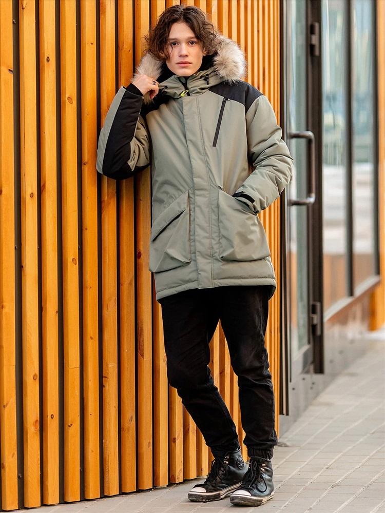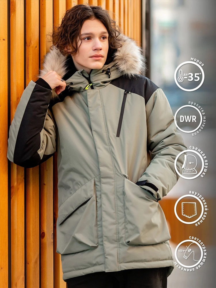Парка для мальчика Рэд в расцветке хаки зимняя утепленная с капюшоном. На груди карман на молниия. также карманы по бокам. На рукаве стильная надпись. Эластичные манжеты регулируются благодаря липучкам. Центральная застежка на молнию и планку на кнопках.