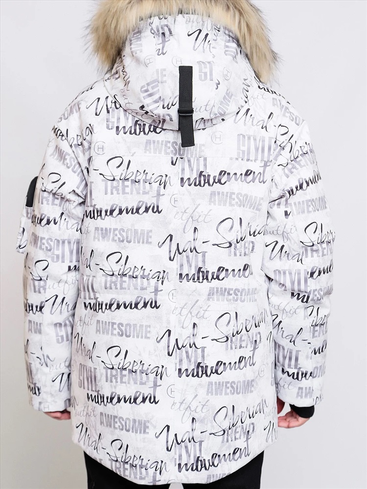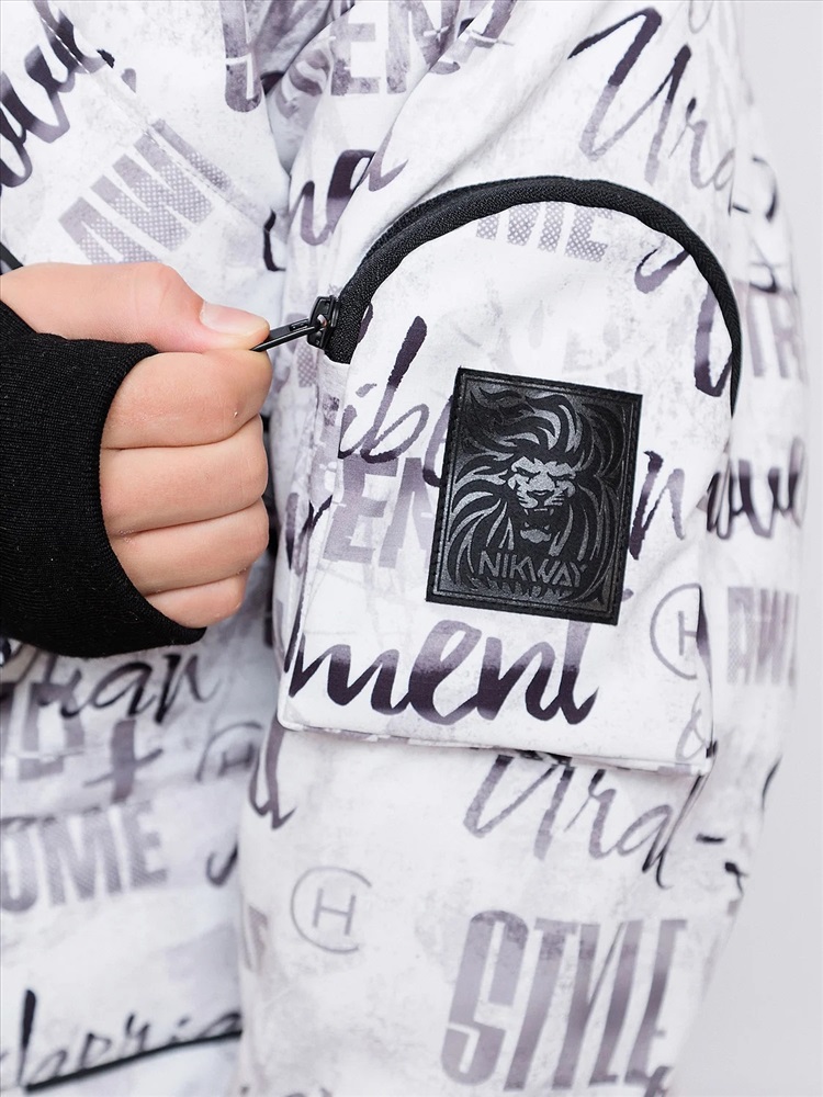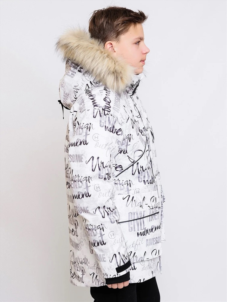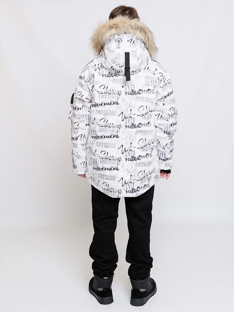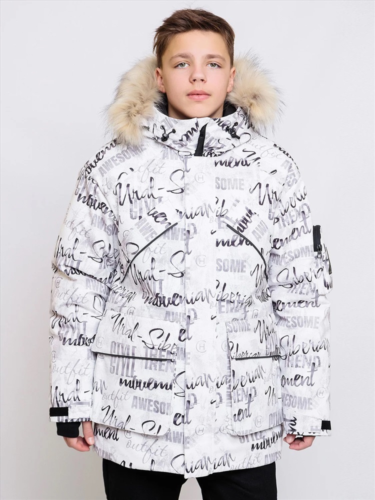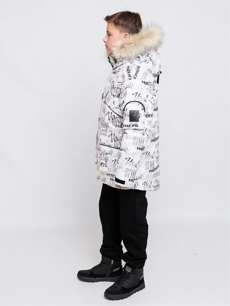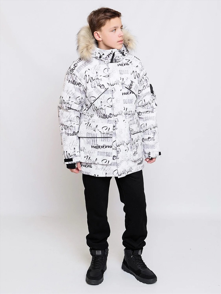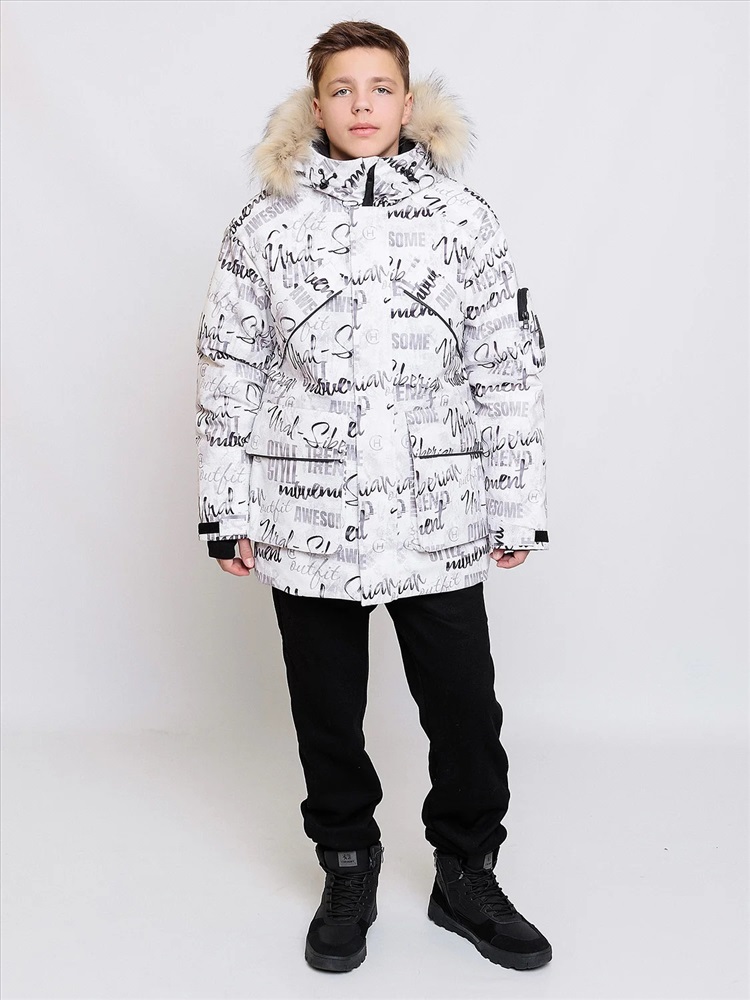 Зимняя парка для мальчиков Алан с шрифтовым принтом актуального силуэта оверсайз представляет собой микс спортивного и городского стиля. Выполнена из плотной мембранной ткани, которая защищает от ветра и влаги. Удлинённая спинка, внутренняя и внешняя ветрозащитная планка. Рукав кроя реглан с внутренней трикотажной манжетой с отверстием для пальца регулируется по ширине. Объемный декоративный карман с молнией и оригинальной нашивкой на левом рукаве. Несколько объемных карманов с клапаном на магнитах на теплой подкладке. Кпюшон со съемной опушкой регулируется по ширине и высоте, внутри подклад из мягкого ворсового трикотажа. Все открытые срезы предусматривают защиту от поддува за счет утяжек. Светоотражающие элементы по принципу 360 градусов видимости обеспечат безопасность в темное время суток.