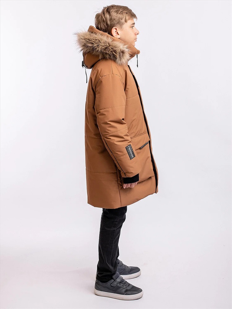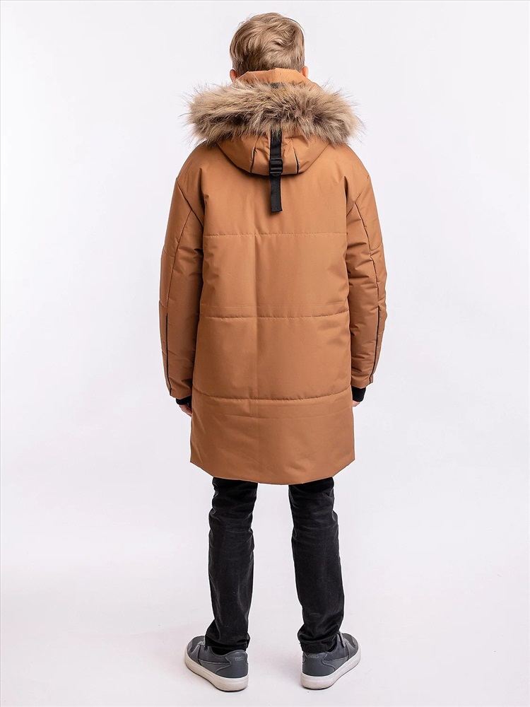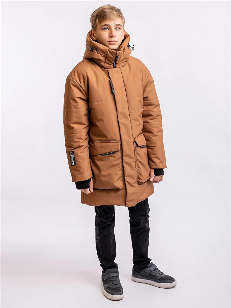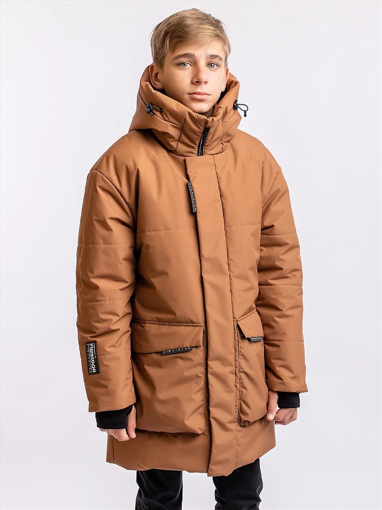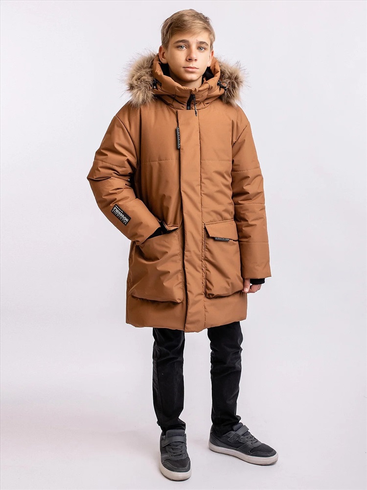 Зимняя парка для мальчика Роман в расцветке кешью. Подклад полибрушед делает изделие очень теплым и легким, хорошо защищающим от ветра и дождя. Ветрозащитная внешняя планка на магнитах от поддува. Трикотажные манжеты с прорезью под пальчик для большего тепла и комфорта. Вместительные карманы: внутренний на молнии и несколько внешних с двойным входом, клапаны и боковой вход в карман на магнитах. Теплый капюшон втачной с регулировкой по объему и глубине и съёмной опушкой на молнии. По низу идет утяжка на резинку с фиксатором. Светоотражающие элементы по принципу 360 градусов видимости обеспечат безопасность в темное время суток.