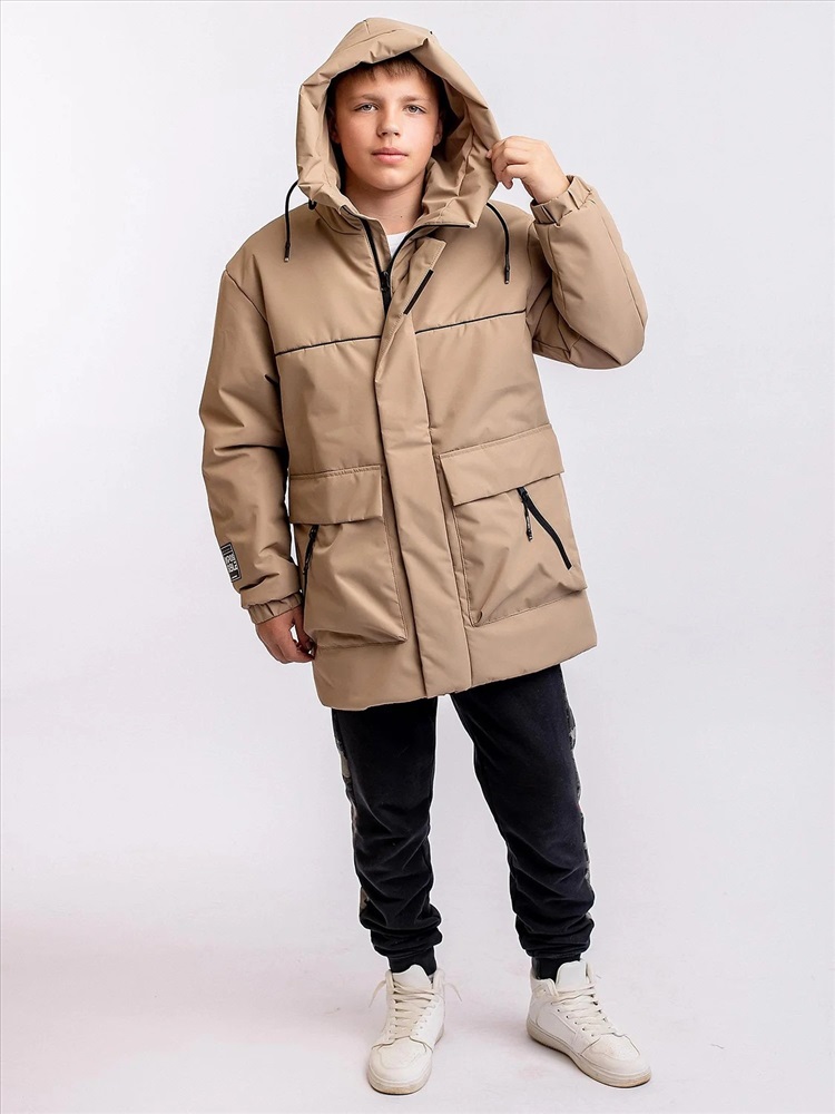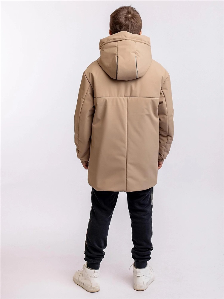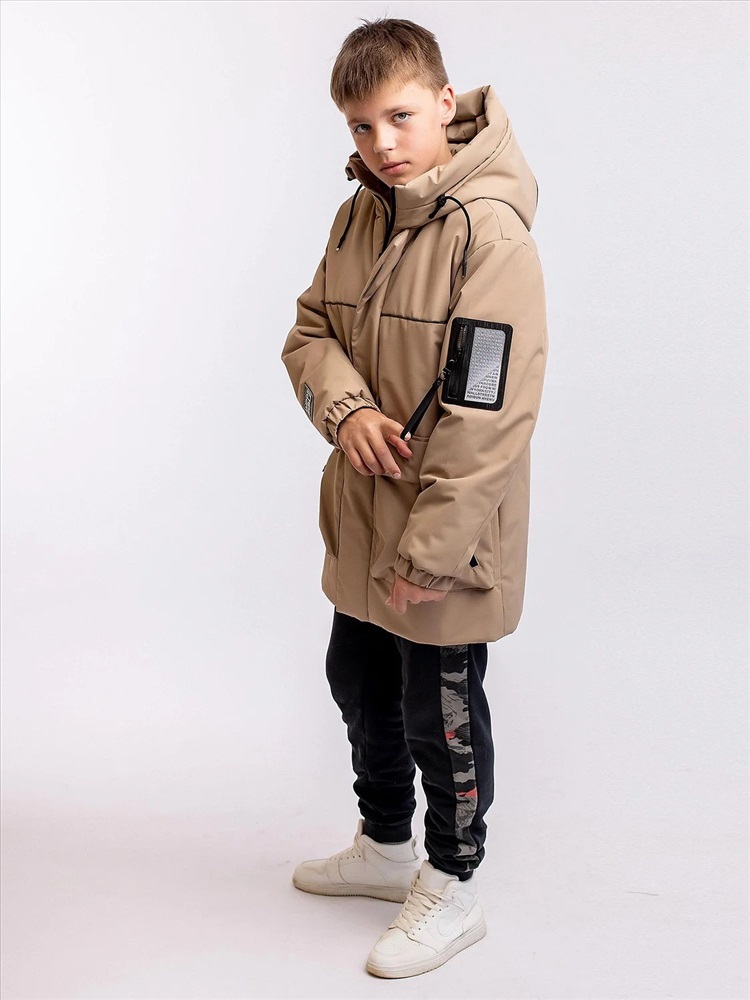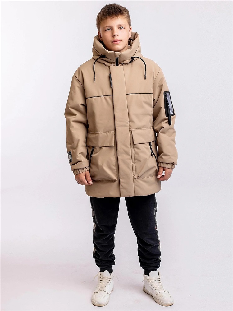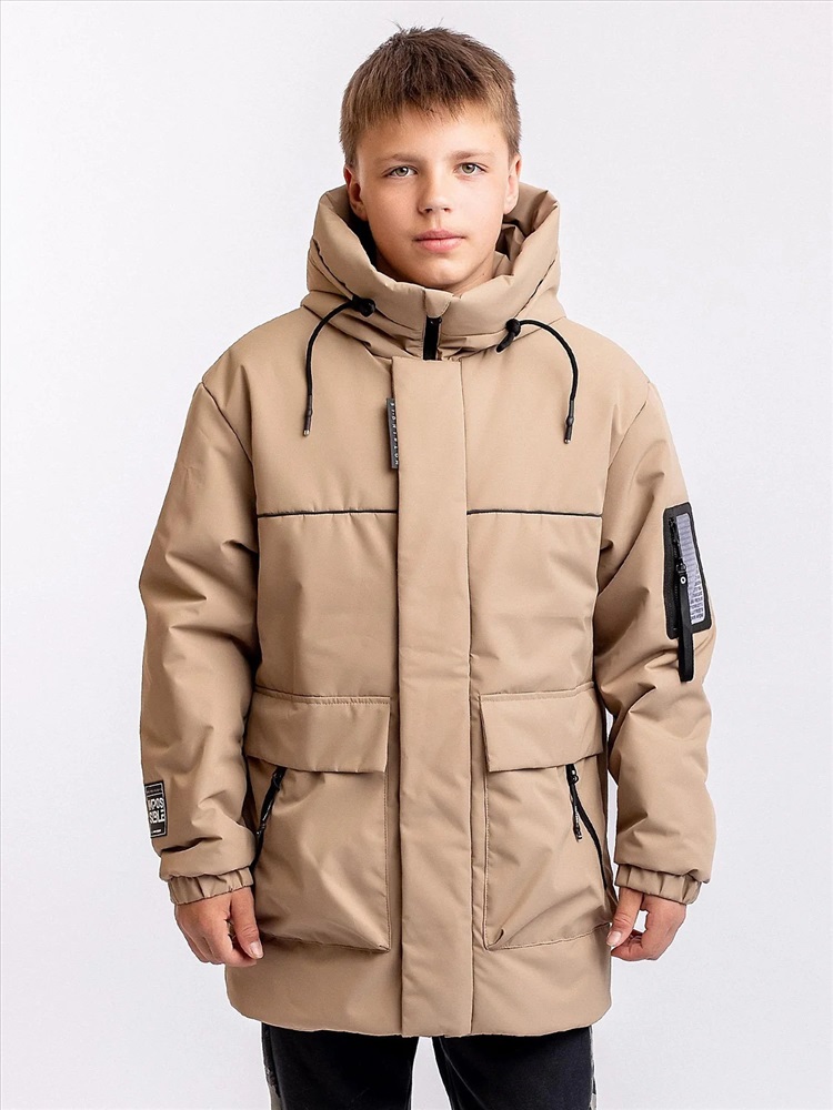 Пальто-парка для мальчика БЭЙН - идеальный вариант для демисезона. Центральная застёжка на молнии, ветрозащитная внешняя планка на магнитах. Рукава с манжетами на резинке. Капюшон втачной с возможностью регулировки для защиты в непогоду. Карманы с двойным входом: клапаны на магнитах и вход на молнии. Декоративный элемент на левом рукаве: нашивка-карман. Светоотражающие элементы - канты и нашивки, пуллеры.