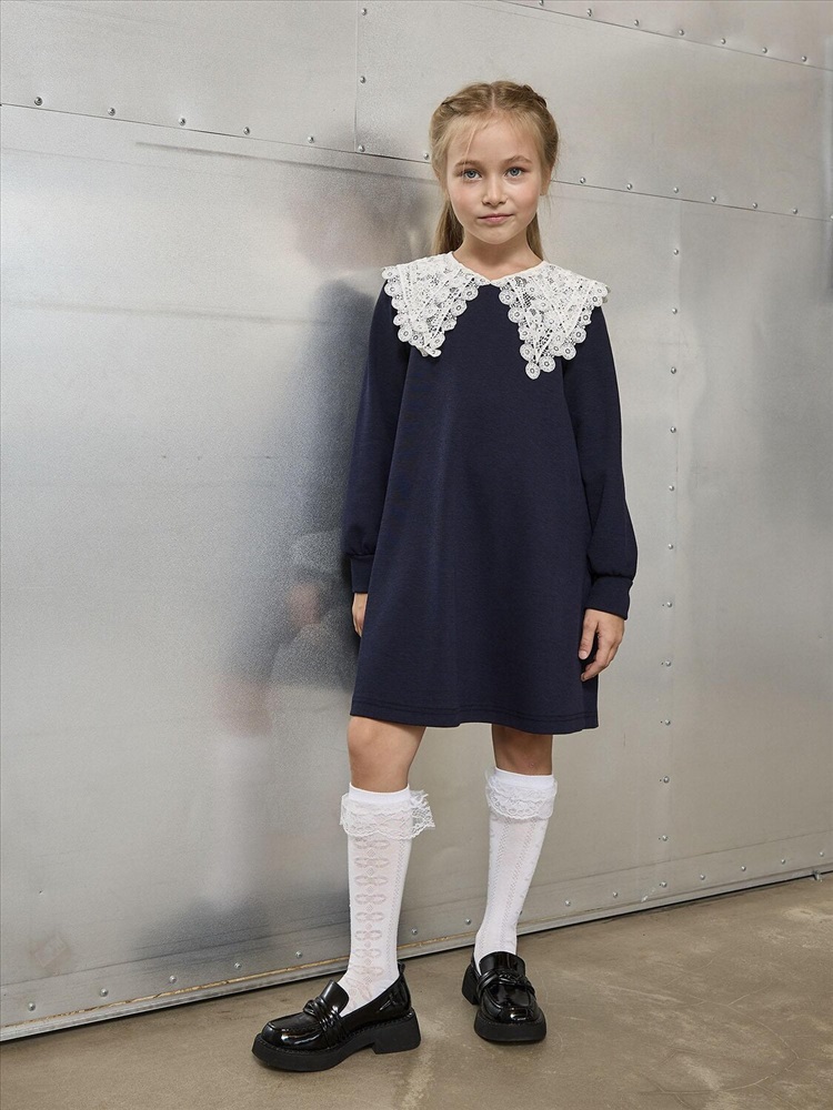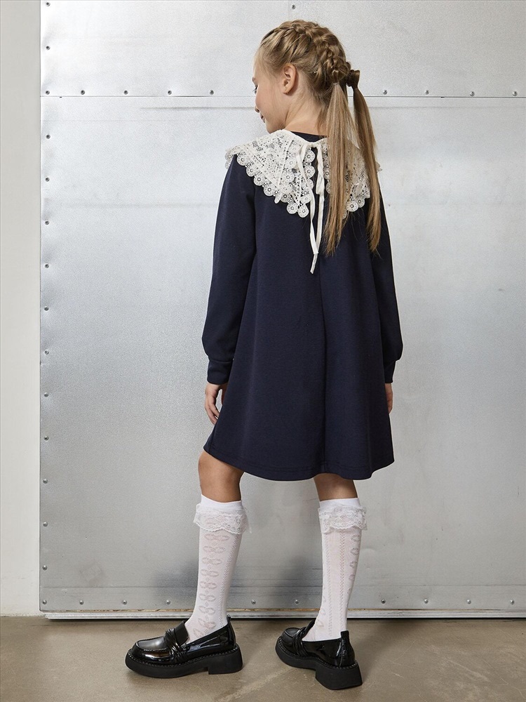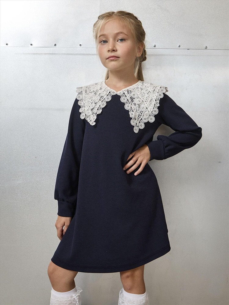 Элегантное темно-синее платье-трапеция – универсальная база школьного гардероба. Удлиненные рукава на манжетах для аккуратного завершенного образа. Декор в романтичном стиле – съемный белый кружевной воротник на завязках (можно носить отдельно). Мягкое трикотажное полотно – приятное к телу, идеально для ежедневной носки. Классический темно-синий цвет – легко комбинируется с любыми аксессуарами и обувью.