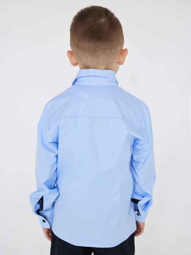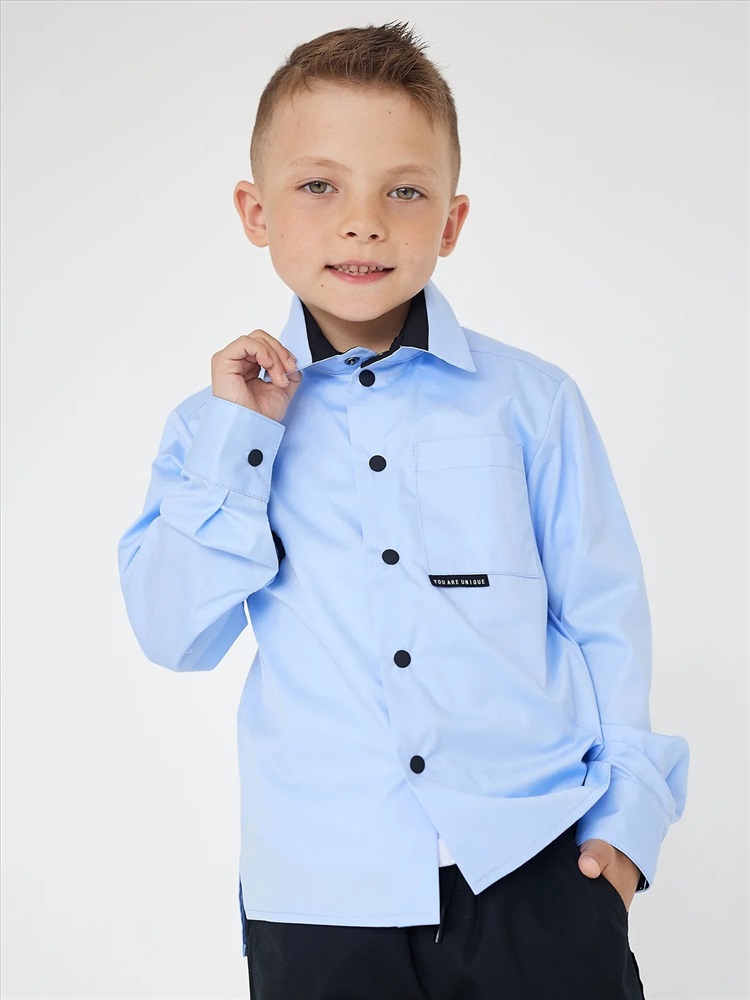 Приталенная рубашка голубого цвета для мальчика с длинным рукавом, нагрудным карманом и контрастной отделкой. Застежка на пуговицы. Нашивка на кармане.