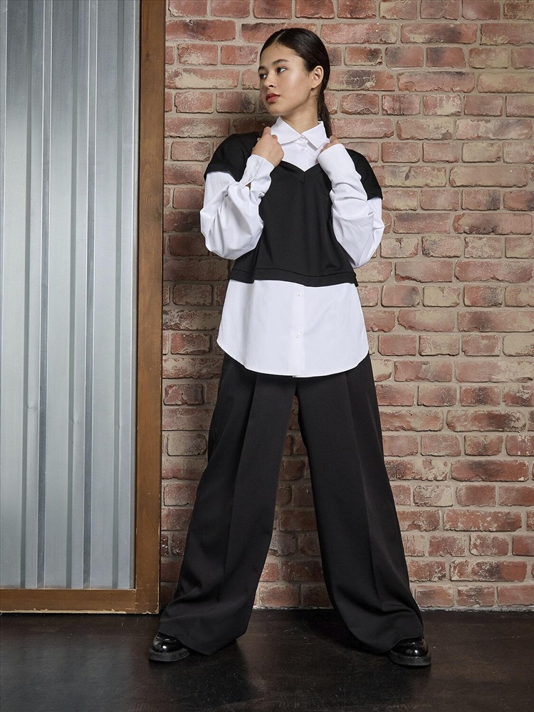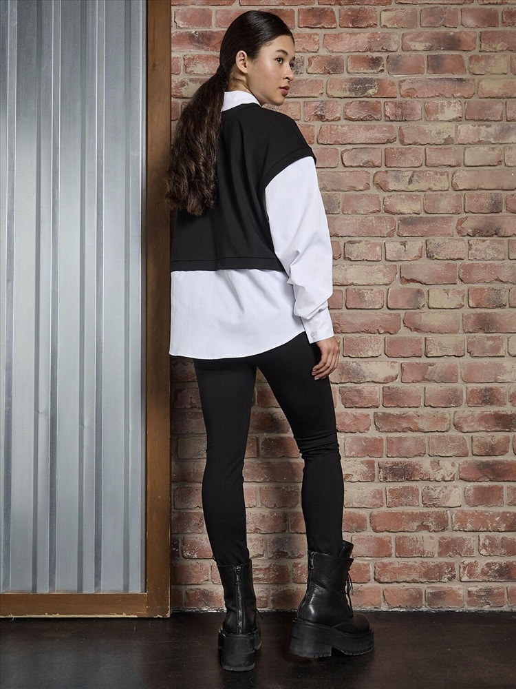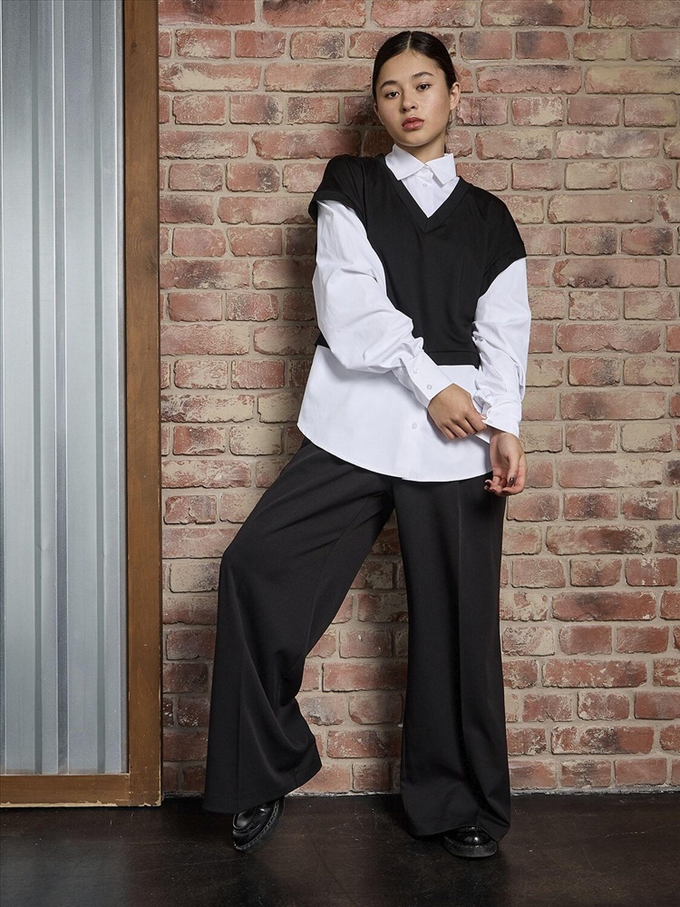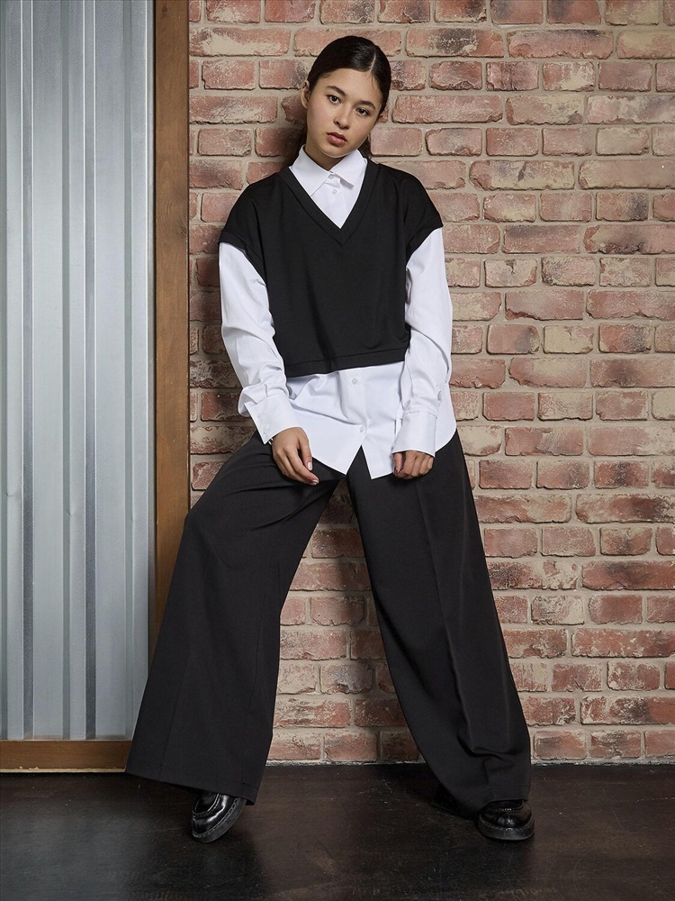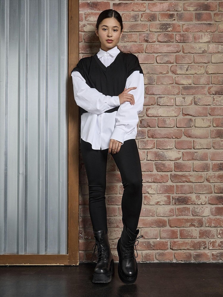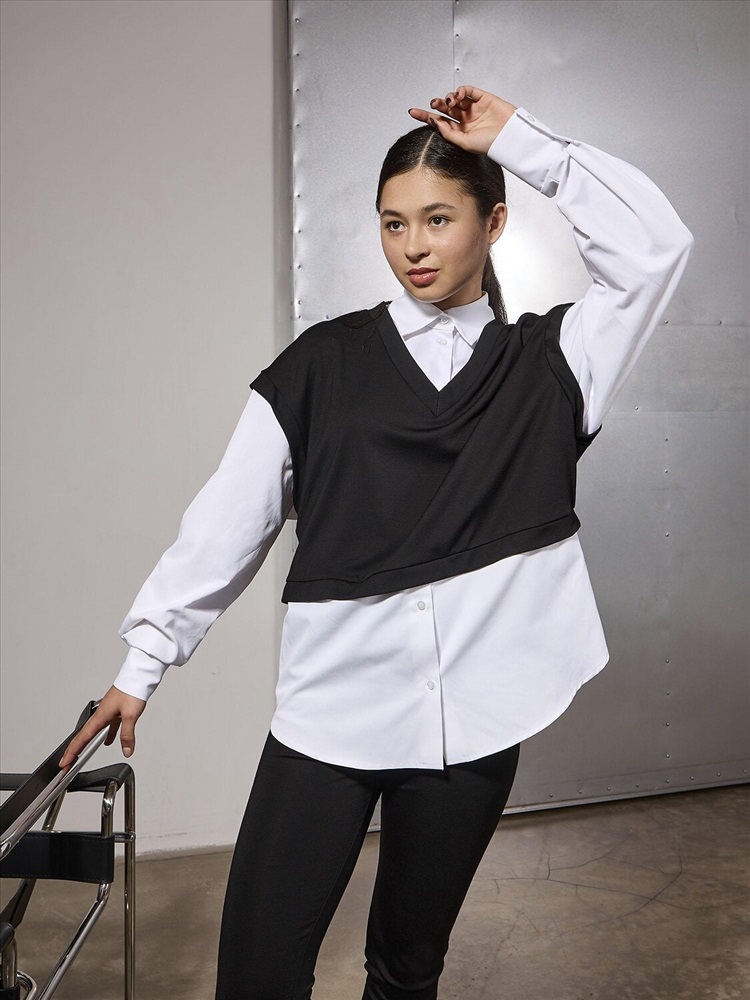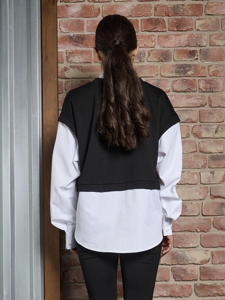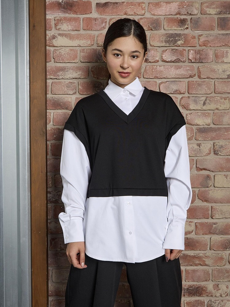 Стильная рубашка-обманка для девочки. Эффектный черный топ с оригинальным дизайном, который создает иллюзию двух вещей - элегантной рубашки и уютного трикотажного жилета. Длинные рукава с аккуратными манжетами добавляют образу строгости и аккуратности. Визуальный эффект многослойности позволяет создать стильный лук без лишних слоев одежды. Идеально сочетается с юбками, брюками и шортами. Подходит для школы, праздников и повседневной носки.