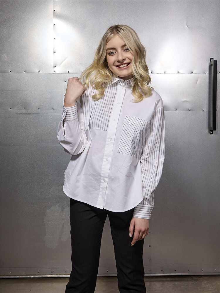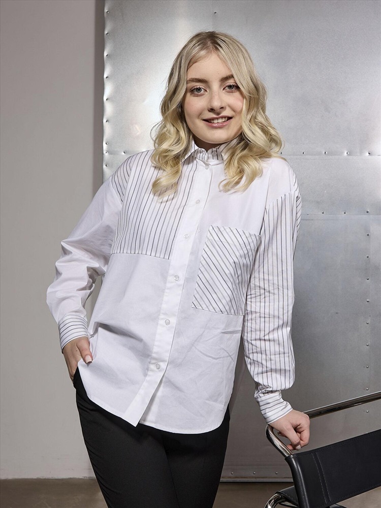 Рубашка выполнена в сочетании принтованной ткани и однотонной. Слева нагрудный карман. Длинные рукава с манжетом. Классический воротник, застежка на пуговицы. На спинке кокетка и встречная складка