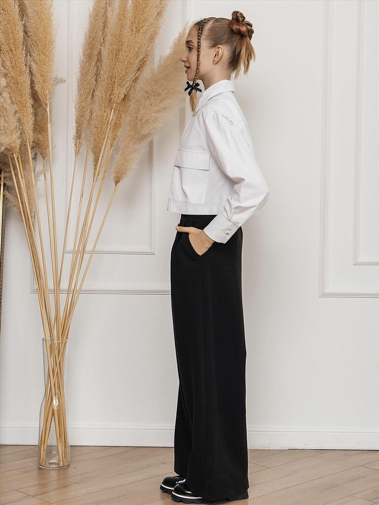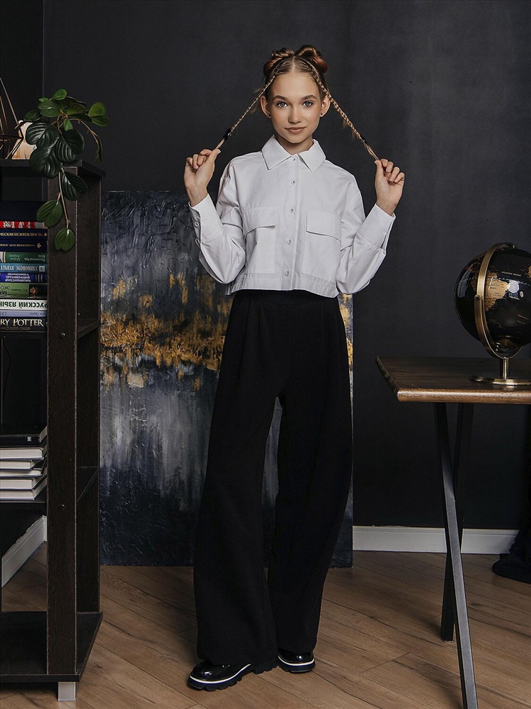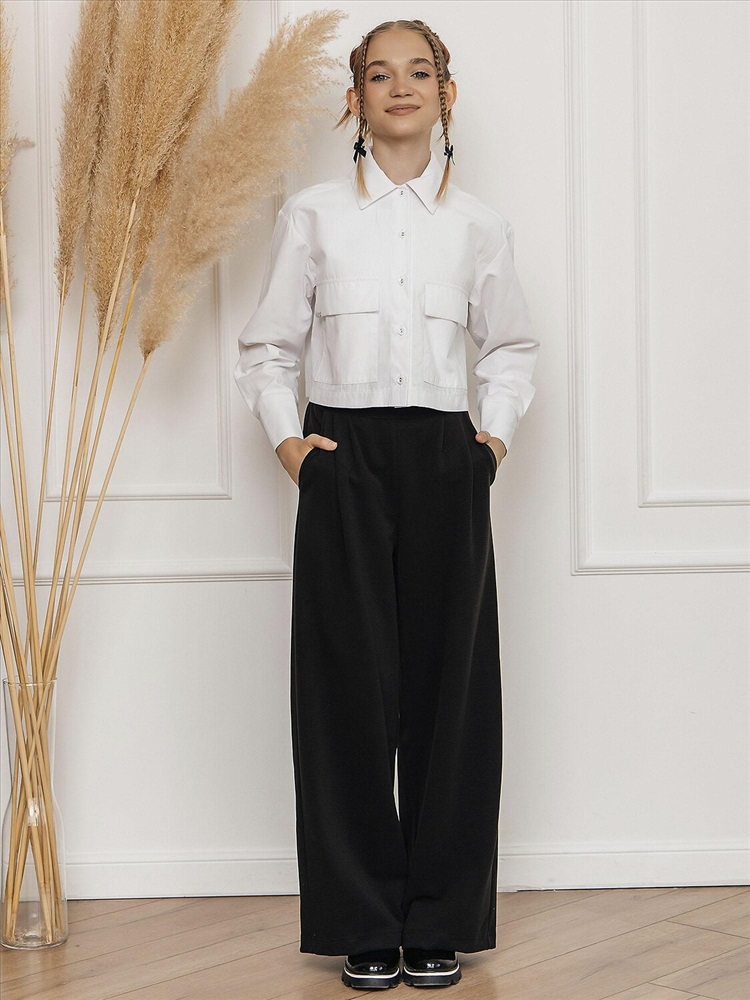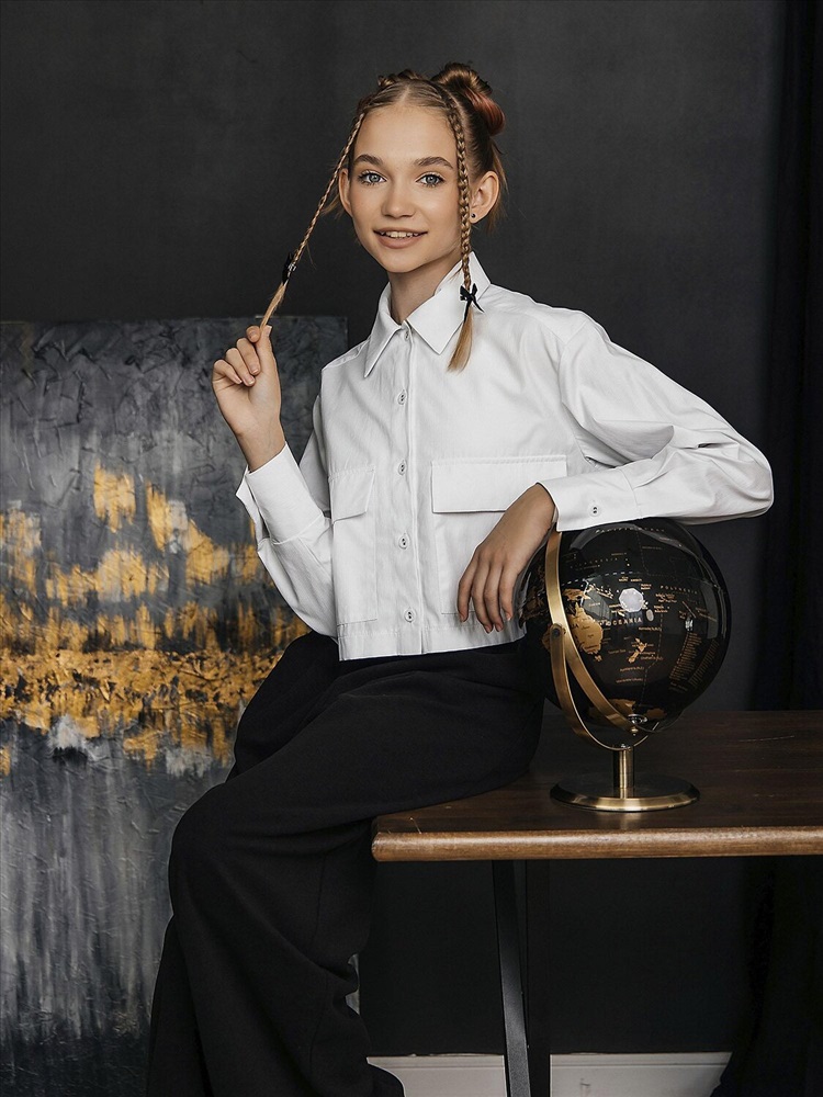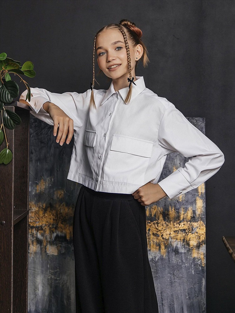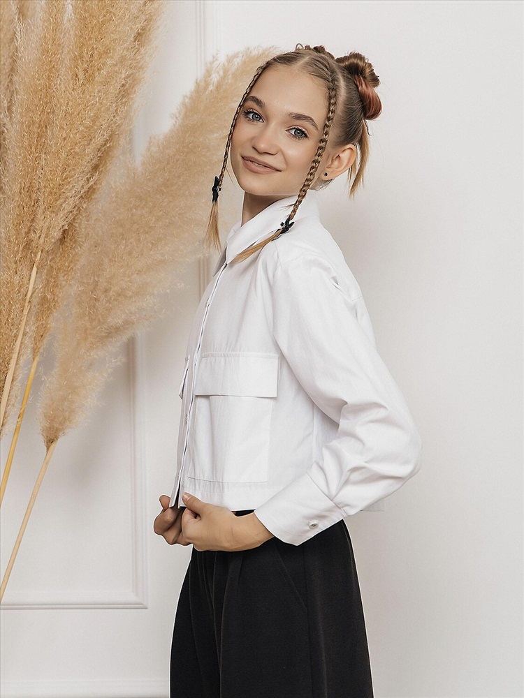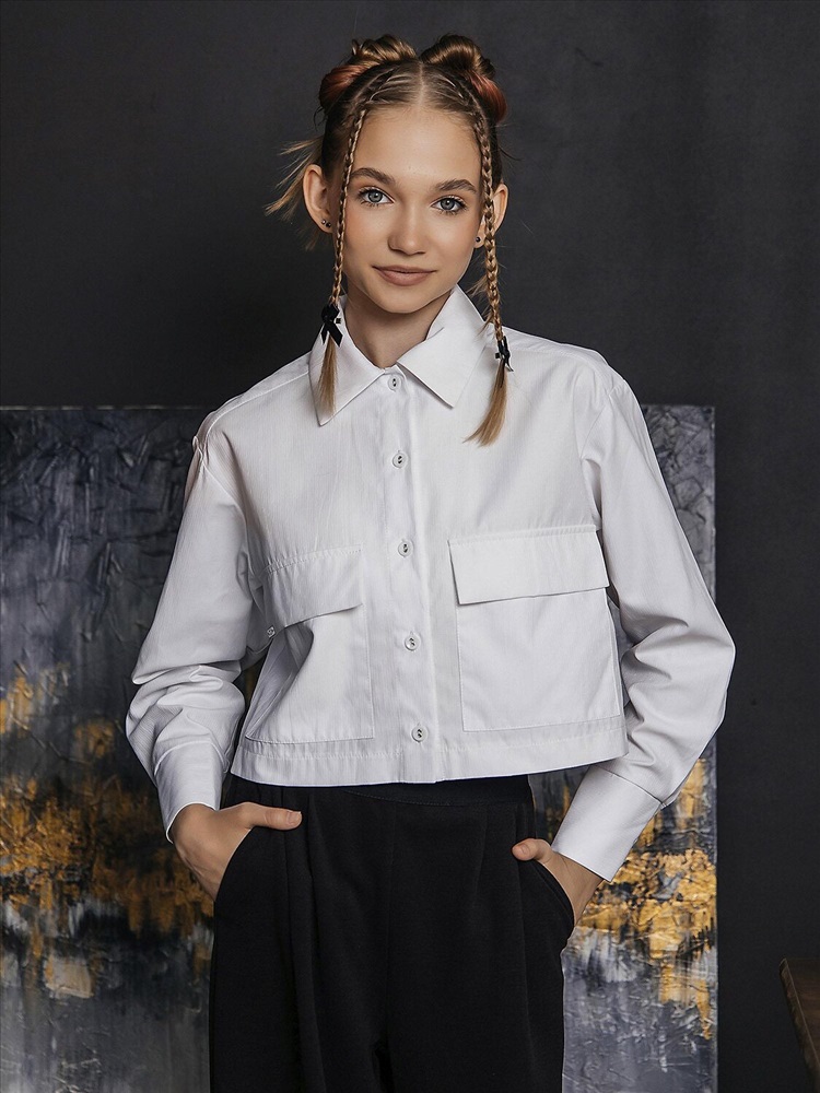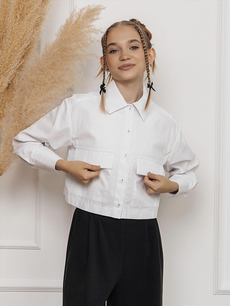 Укороченная рубашка для девочкив белом цвете выполнена из смесовой ткани с рисунком из хлопка и полиэстера. Модель дополнена классическим отложным воротником, длинными рукавами и застежкой на пуговицы. Вместительные накладные карманы с клапанами.