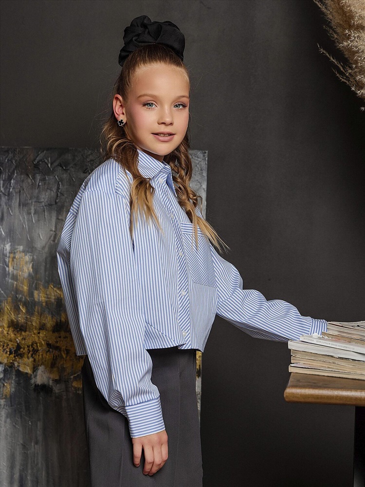 Стильная голубая рубашка в полоску с дизайнерскими подрезами. Эффектный принт в голубую полоску с креативными подрезами в разных направлениях — игра линий добавляет образу динамики и современности. Удобный нагрудный карман слева, классический воротник и застежка на пуговицы — лаконично и универсально. Длинные рукава с аккуратным манжетом для элегантной посадки. Удобная кокетка на спинке обеспечивает комфорт и свободу движений. Идеально сочетается с джинсами, брюками чинос или шортами. Подойдет для школьного, кэжуал- или уличного стиля.