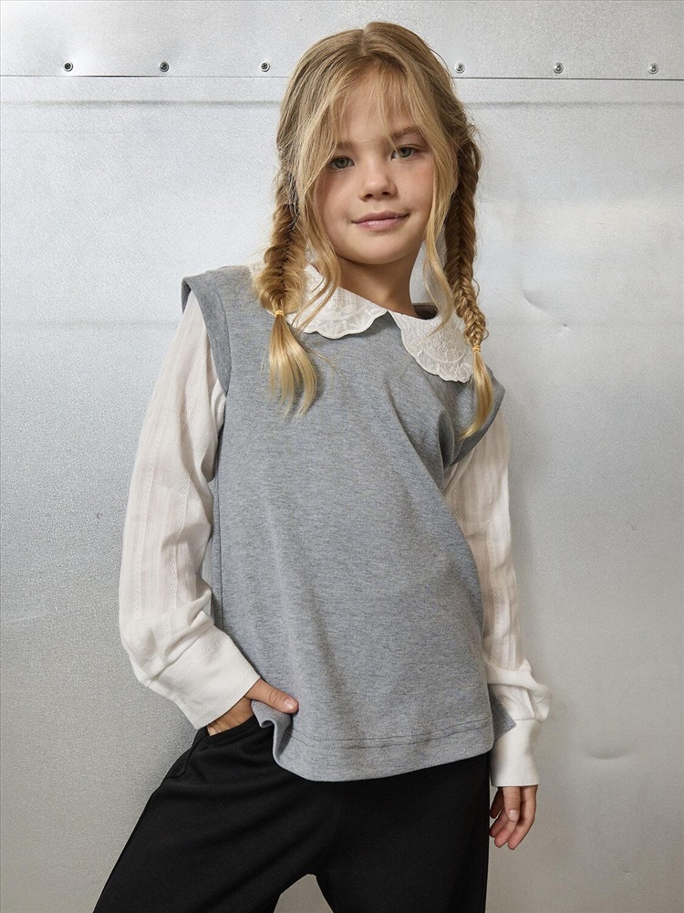 Стильная рубашка-обманка в светло-сером цвете имитирует эффект многослойности: сочетает элегантную рубашку и уютный трикотажный жилет в одной модели. Иллюзия двух изделий создает визуально интересный и стильный образ без лишних слоев. Кружевной воротник добавляет изысканности, а длинные рукава с манжетами завершают лаконичный крой. Приятный светло-серый оттенок делает рубашку универсальной для базового гардероба.