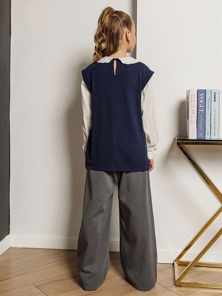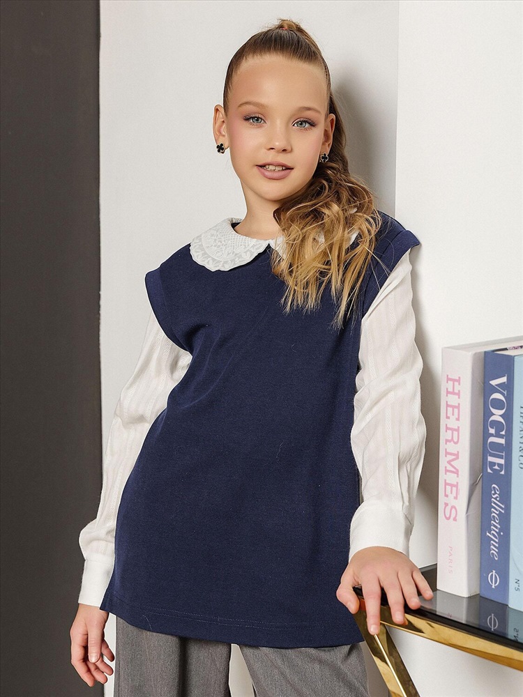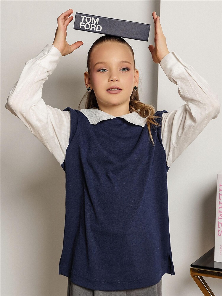 Стильная рубашка-обманка в темно-синем цвете имитирует эффект многослойности: сочетает элегантную рубашку и уютный трикотажный жилет в одной модели. Иллюзия двух изделий создает визуально интересный и стильный образ без лишних слоев. Кружевной воротник добавляет изысканности, а длинные рукава с манжетами завершают лаконичный крой. Глубокий темно-синий оттенок делает рубашку универсальной для базового гардероба.