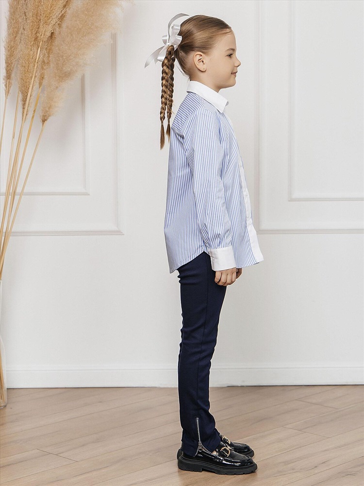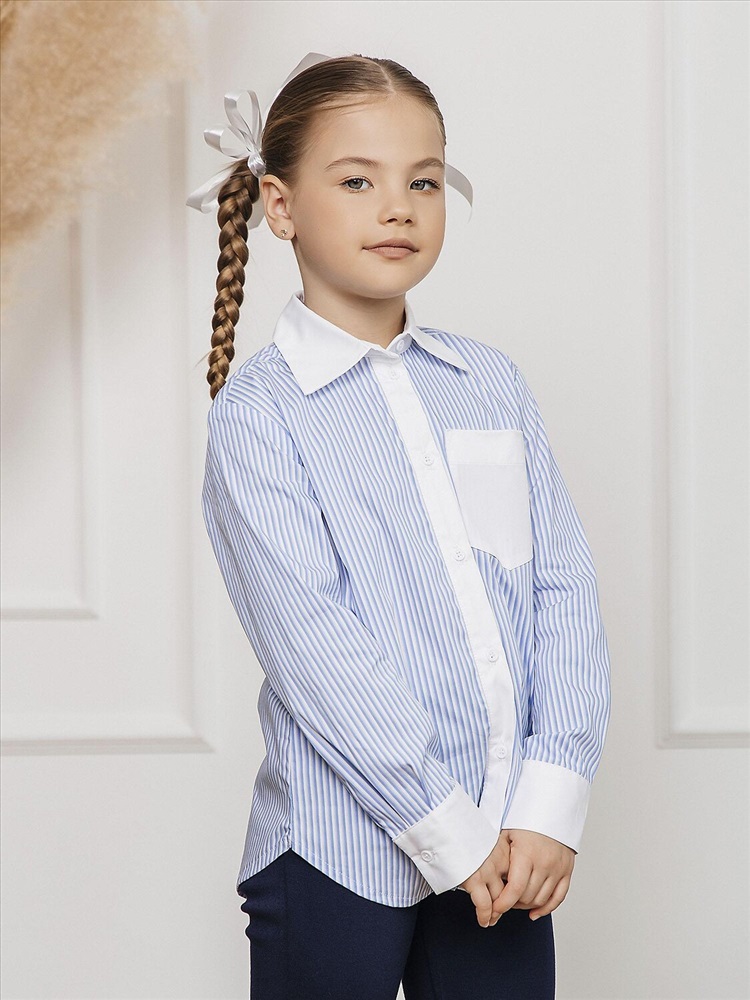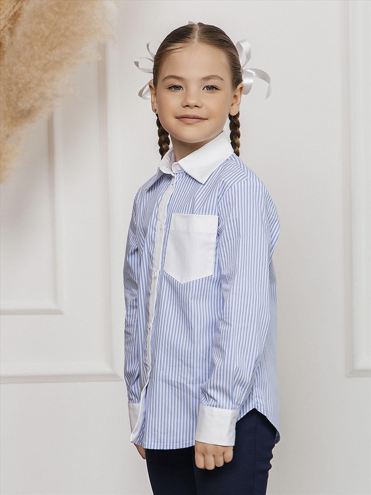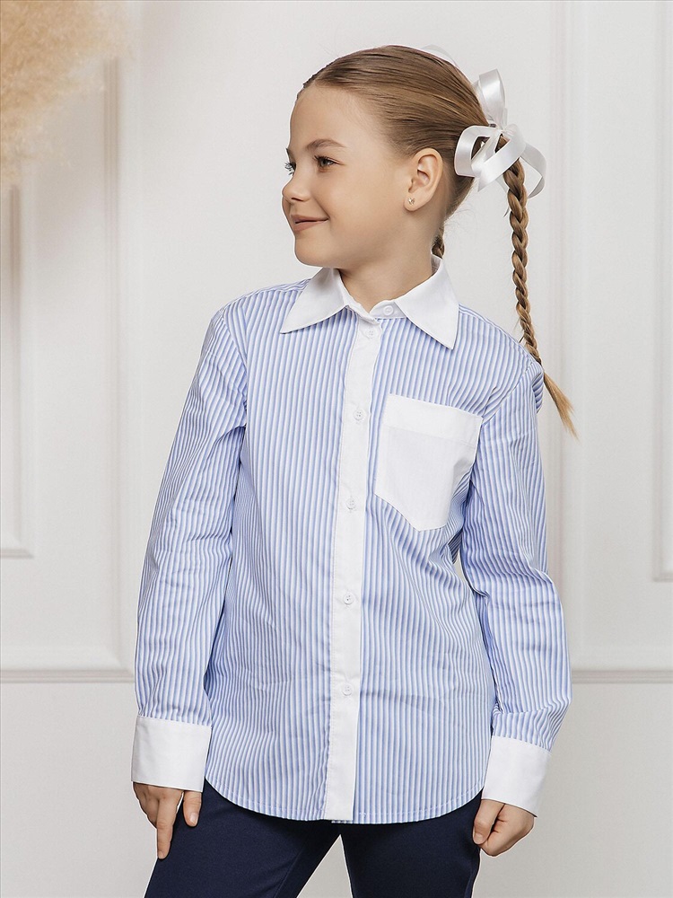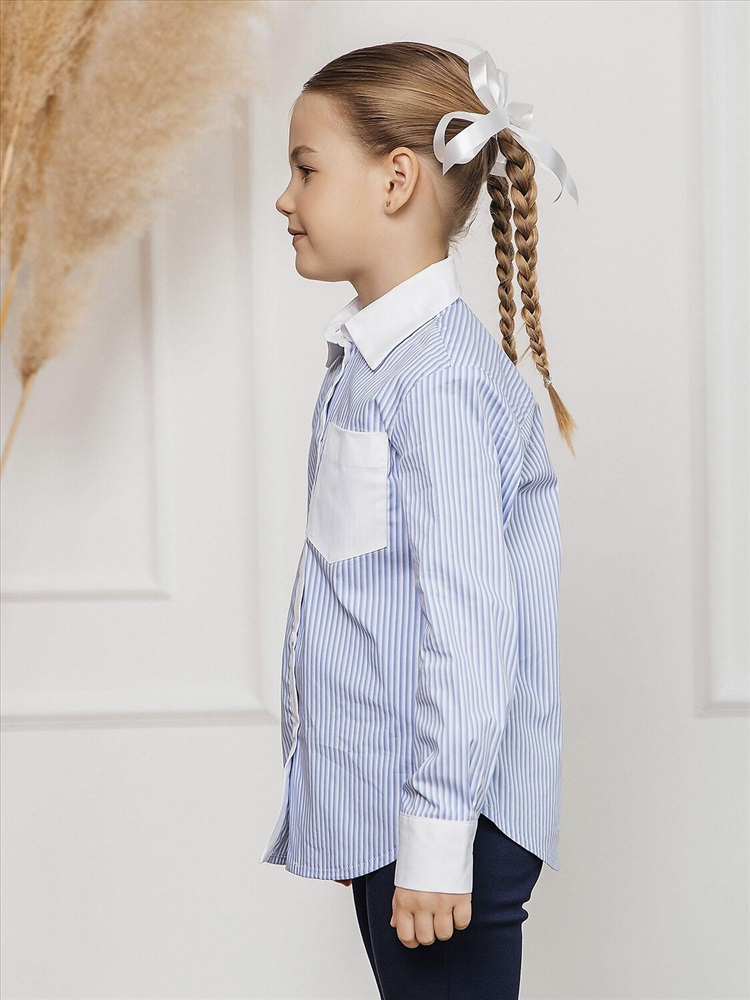 Классическая рубашка выполнена в сочетании принтованной ткани и однотонной. Слева нагрудный карман. Длинные рукава с манжетом. Классический воротник, застежка на пуговицы. На спинке кокетка.