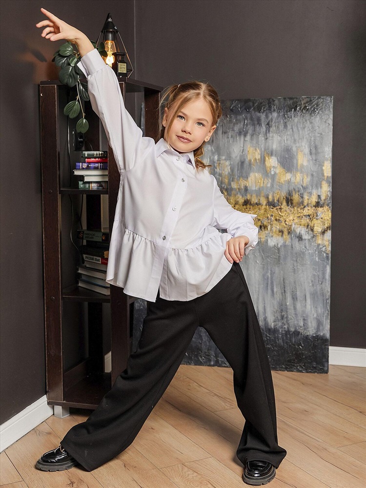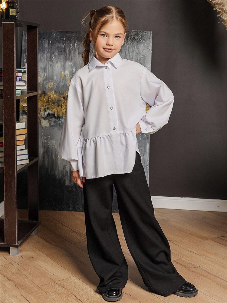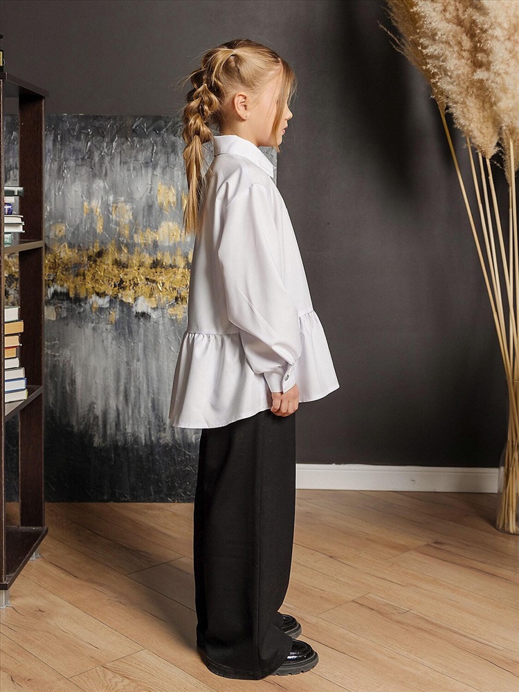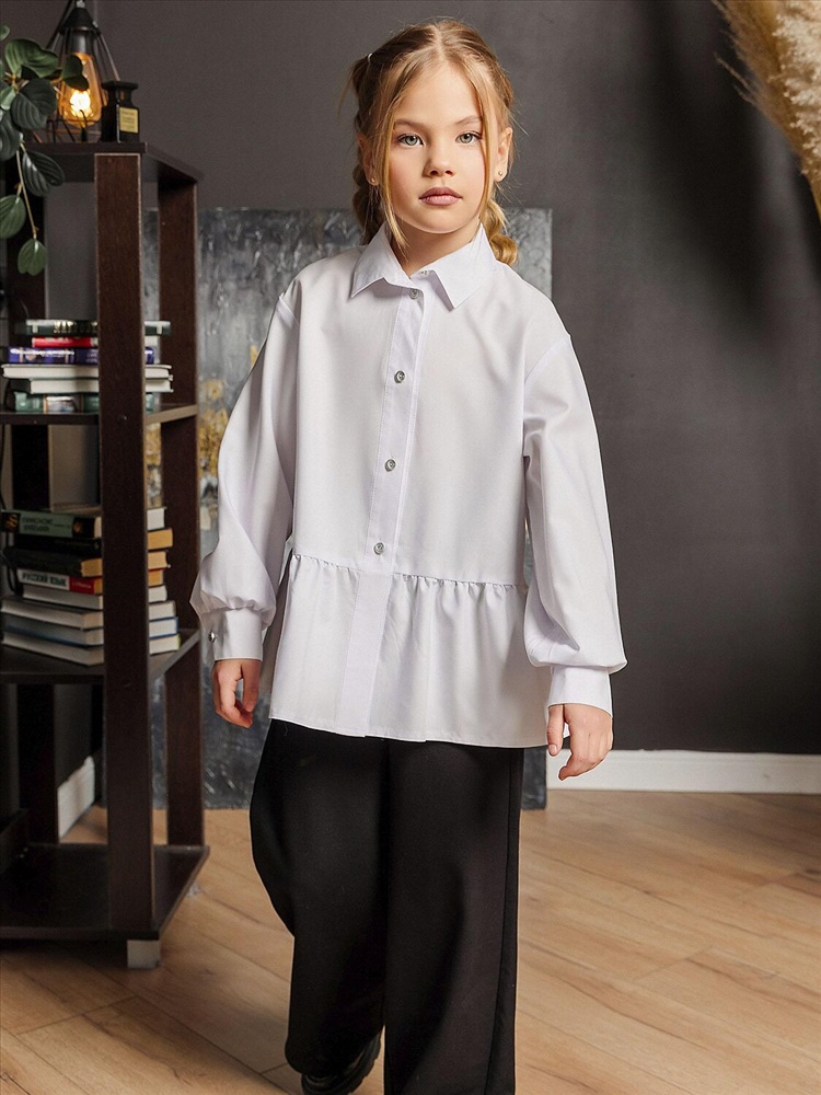 Белая широкая рубашка с романтичной оборкой. Объемный силуэт – свободный крой для комфорта и модного oversize-эффекта. Очаровательная оборка по подолу – акцент, создающий воздушный образ. Классический отложной воротник подчеркивает аккуратность и стиль. Длинные рукава – универсальный вариант для любого сезона. Застежка на пуговицах. Идеальная база для школьного и праздничного гардероба. Качественный материал – приятный к телу, хорошо держит форму. Универсальность – сочетается с юбками, шортами, джинсами и сарафанами.