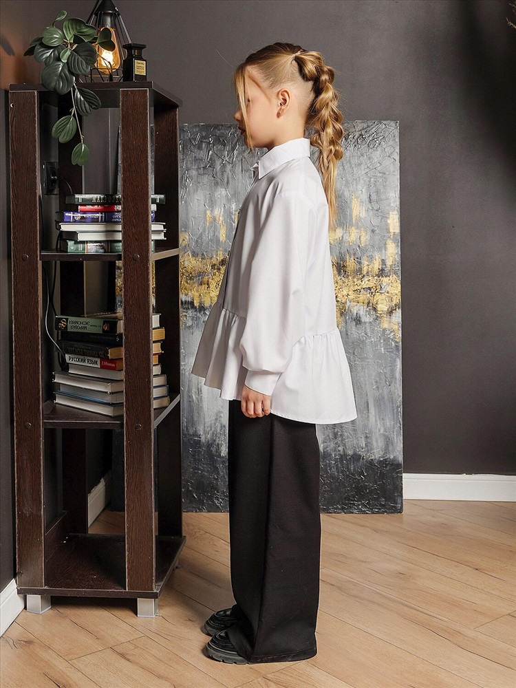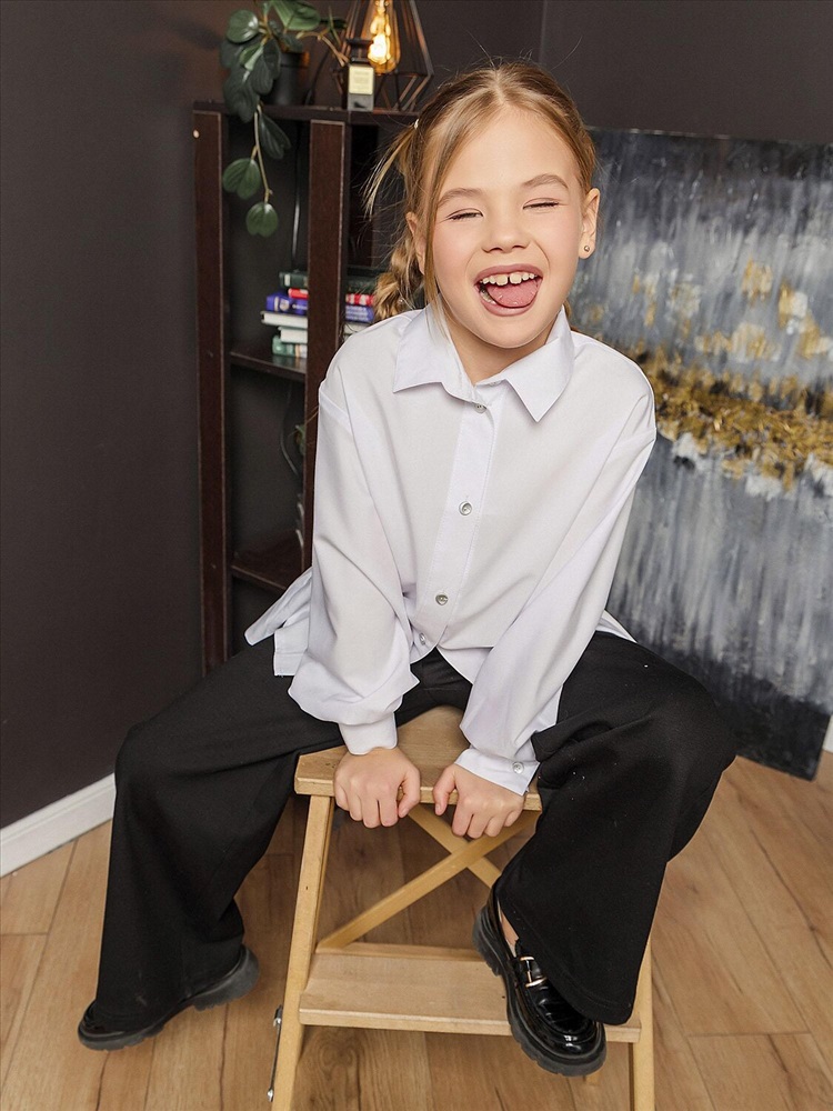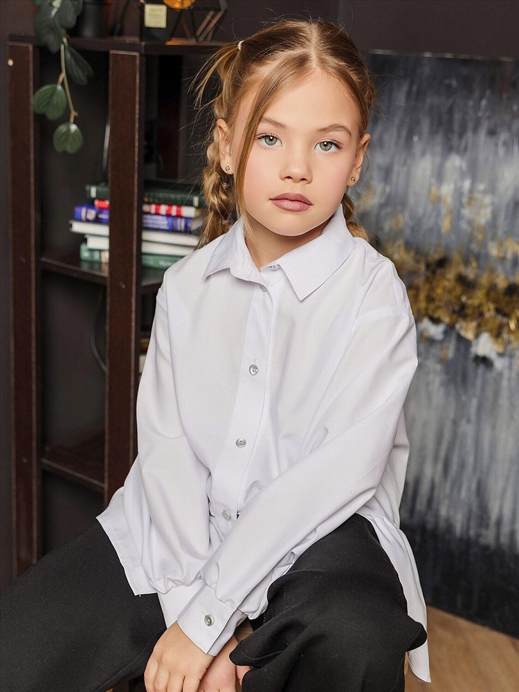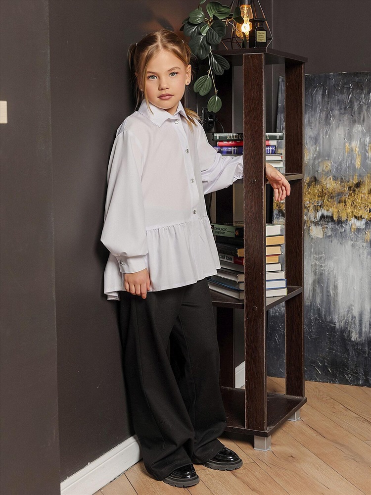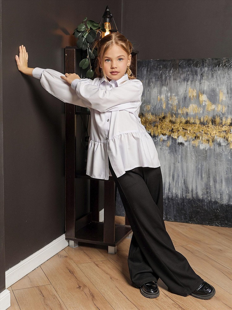 Белая широкая рубашка с романтичной оборкой. Объемный силуэт – свободный крой для комфорта и модного oversize-эффекта. Очаровательная оборка по подолу – акцент, создающий воздушный образ. Классический отложной воротник подчеркивает аккуратность и стиль. Длинные рукава – универсальный вариант для любого сезона. Застежка на пуговицах. Идеальная база для школьного и праздничного гардероба. Качественный материал – приятный к телу, хорошо держит форму. Универсальность – сочетается с юбками, шортами, джинсами и сарафанами.