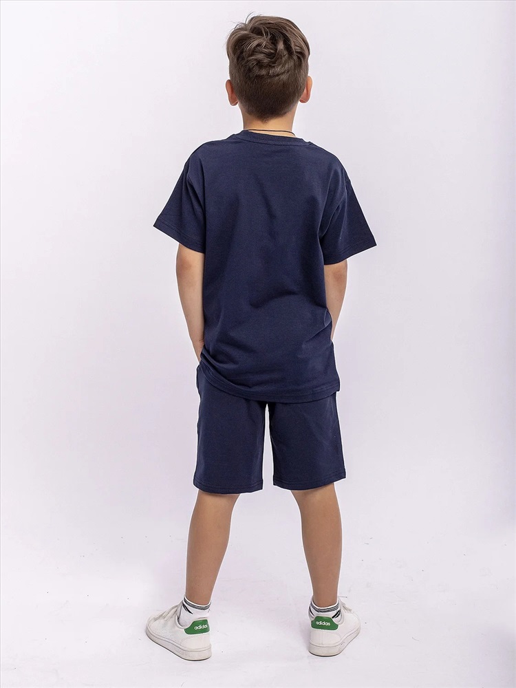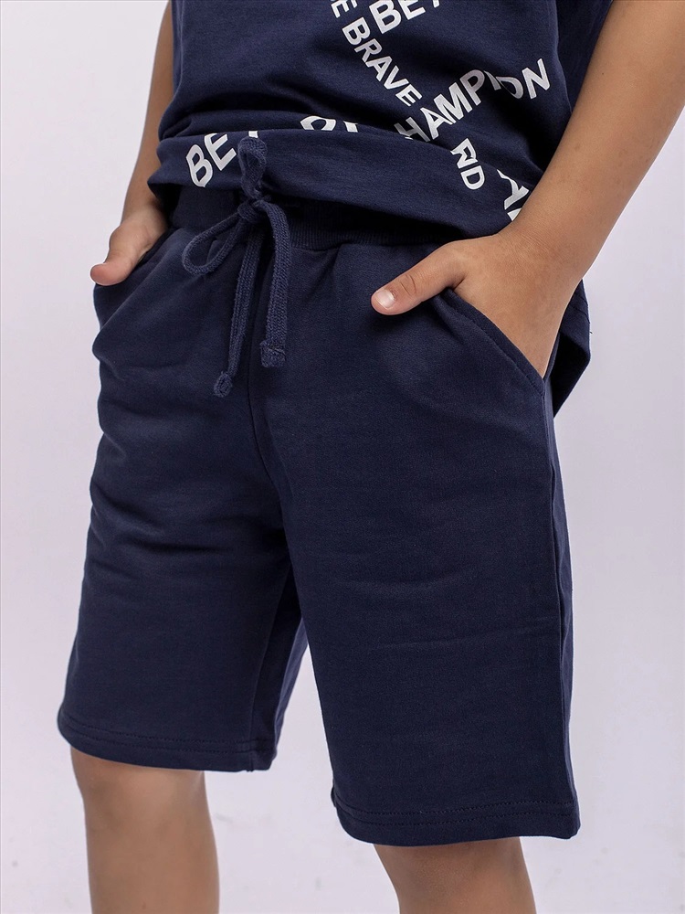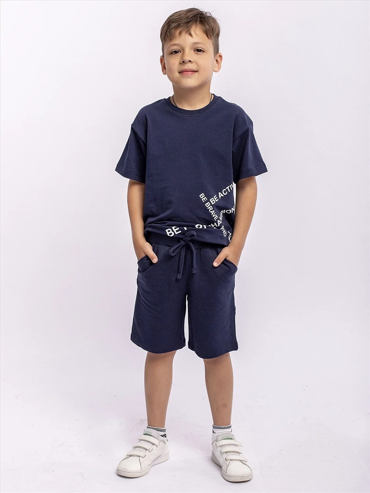 Шорты для мальчика синие из футера вы можете купить в нашем интернет-магазине по низкой цене. Шорты имеют карманы, эластичный пояс со шнурком. Расцветка однотонная.