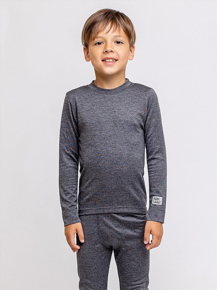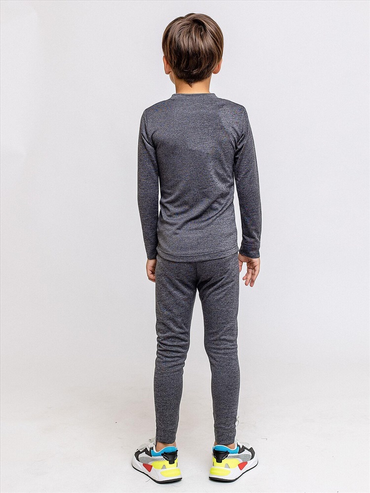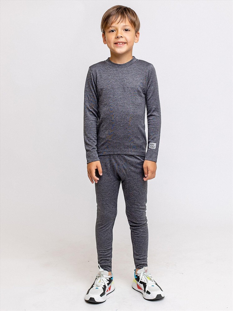 Термобелье двухслойное для детей в расцветке черный меланж. Термобелье от бренда batik создано для того, чтобы ребенку было тепло и комфортно во время игр, прогулок или отдыха дома. Комплект состоит из леггинсов и лонгслива с длинными рукавами.