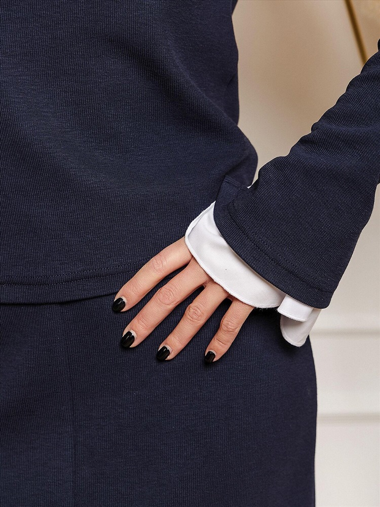 Топ-водолазка темно-синяя с длинными рукавами. Съемные манжеты-воланы из сорочечной ткани. Крепятся изнутри на пуговицы. Стильная универсальная водолазка отлично подойдет для создания различных образов - как casual, так и более нарядных.