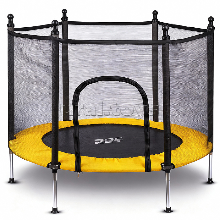 Диаметр батута: 140 см. Диаметр прыжковой поверхности: 107 см. Высота модели: 122 см. Высота защитной сетки: 88 см. Высота от пола до прыжкового полотна: 30 см. Количество стоек: 6. Количество пружин: 36 Максимальный вес пользователя: 100 кг. Материал сетки: нейлоновая ткань. Материал мата: полипропилен. Материал рамы: сталь. Вход в сетку закрывается на молнию. Для детей от 6 лет. В комплекте: - шесть крестовин каркаса, - 36 пружин, - натяжитель, - прыжковое полотно, - боковой защитный кожух, - 6 ножек с пластиковыми наконечниками, - 6 стоек для сетки, - защитная ограничительная сетка.