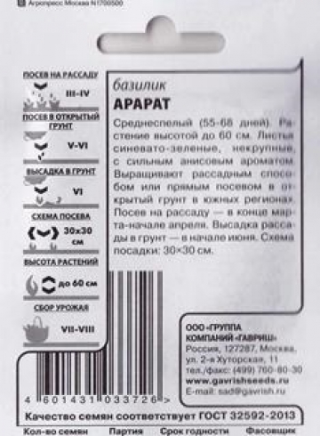 Очень ароматный сорт базилика, с крупными листьями темно-фиолетового цвета, средней величины. Растение среднеспелое, высотой 40-60 см, содержит много эфирных масел и каротина. Молодые побеги и листья в свежем и сушеном виде используют в качестве приправы, а также при засолке и консервировании. Базилик эффективно применяют при заболеваниях желудка, воспалении мочевого пузыря, кашле, для заживления ран. Сорт рекомендован для использования в свежем виде. Может выращиваться в горшках. Фасовка 0,3г Комментарии к товару